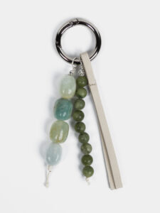 Брелок из натуральных камней (яшма песочная) с элементом из натуральной кожи темно-коричневого цвета на кольце-карабине. Брелок можно носить на шлевке брюк в качестве аксессуара, а также крепить к сумке или использовать в качестве брелока для ключей.