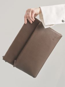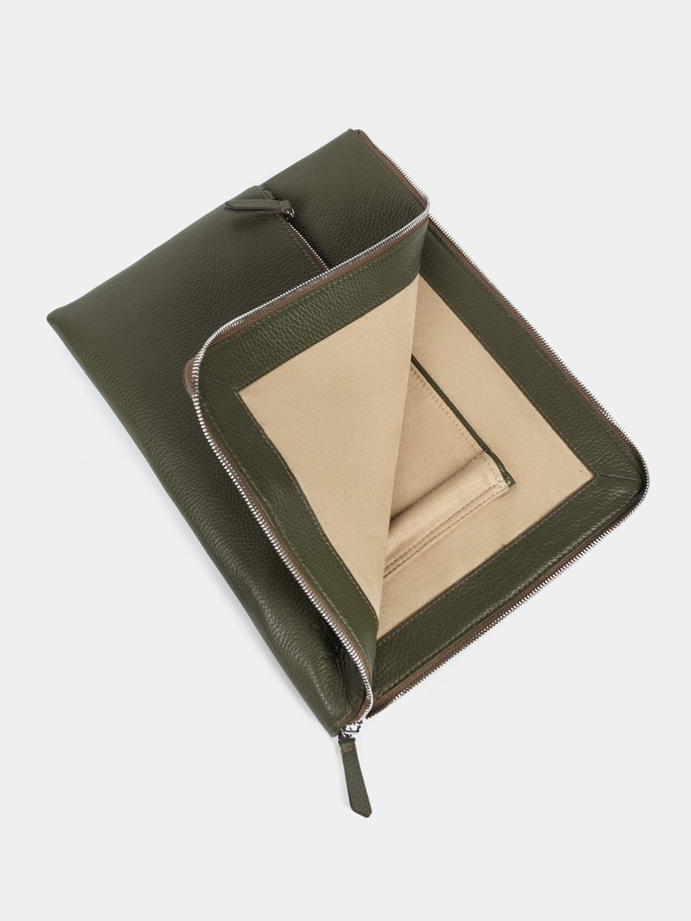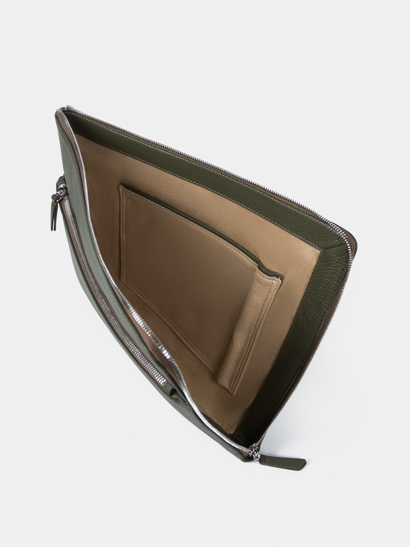 Чехол для ноутбука 14 дюймов бренда SAAJ из зернистой натуральной кожи оливкового цвета. Чехол закрывается на металлическую молнию. Внутри одно отделение, карман для паспорта, карман для авторучки. На передней стенке карман на молнии. На задней cтенке ручка для ношения в руке (можно прикрепить к чемодану). Изделие упаковано в тканевый мешок.