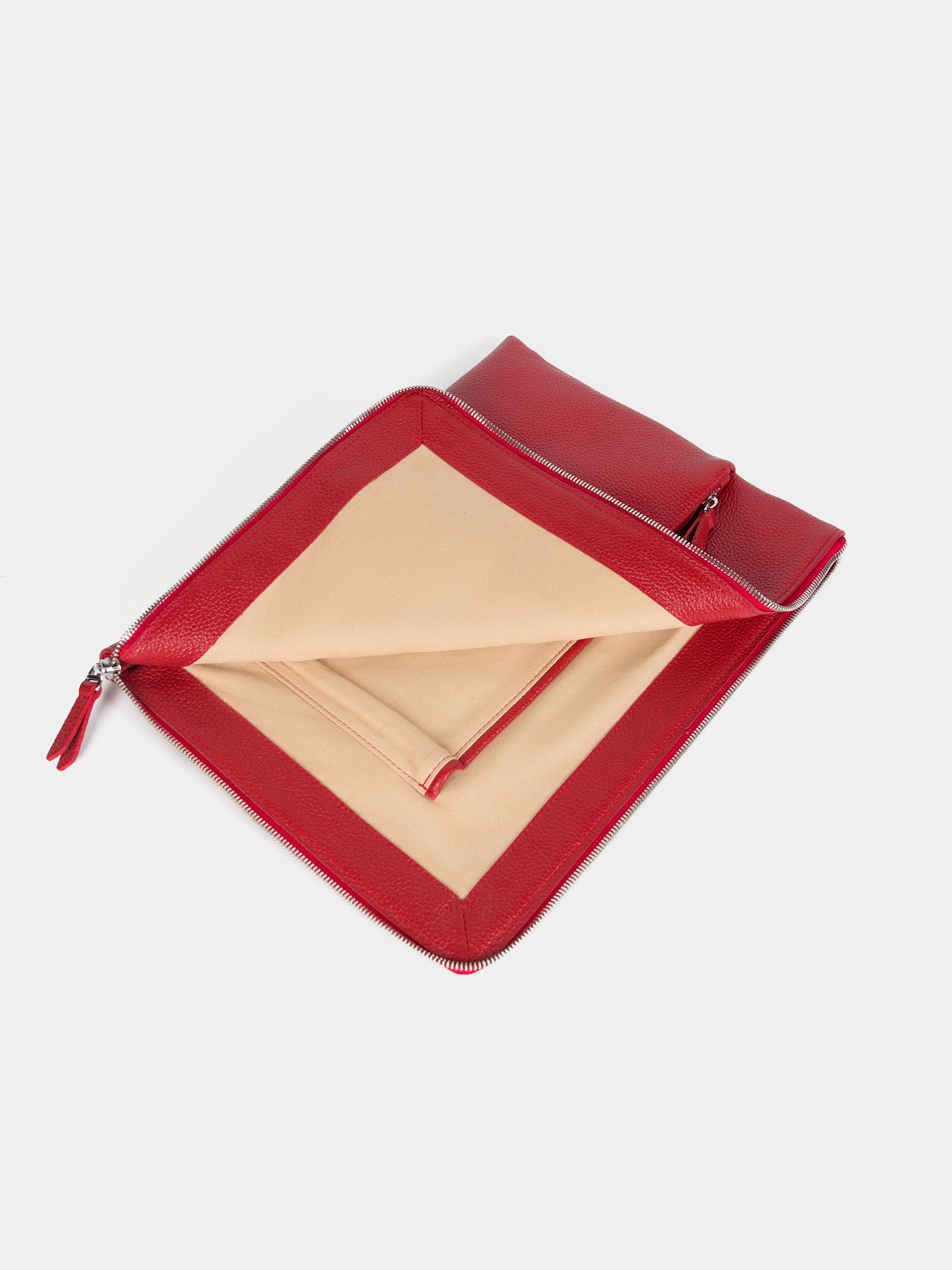Чехол для ноутбука 14 дюймов бренда SAAJ из зернистой натуральной кожи красного цвета. Чехол закрывается на металлическую молнию. Внутри одно отделение, карман для паспорта, карман для авторучки. На передней стенке карман на молнии. На задней cтенке ручка для ношения в руке (можно прикрепить к чемодану). Изделие упаковано в тканевый мешок.