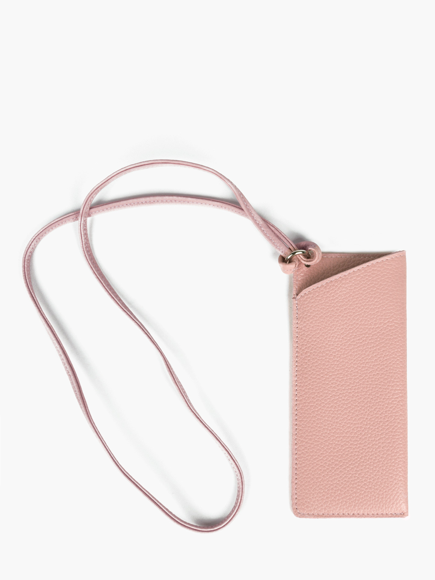 Футляр для очков бренда SAAJ из зернистой натуральной кожи светло-розового цвета с металлическим кольцом на шнурке. Длина шнурка 40 см. Внутри текстильная подкладка бежевого цвета. Изделие упаковано в тканевый мешок.