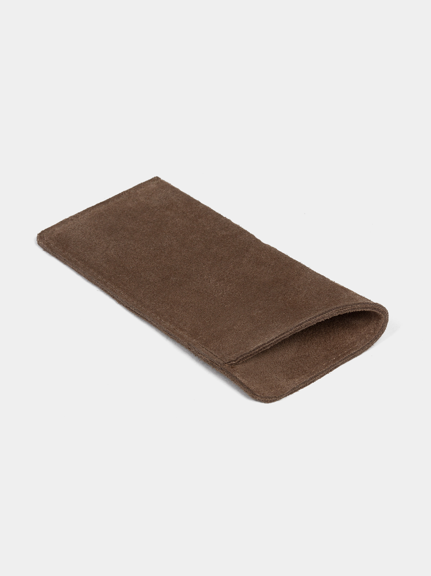 Футляр для очков бренда SAAJ из науральной замши коричневого цвета. Внутри текстильная подкладка бежевого цвета. Изделие упаковано в тканевый мешок.