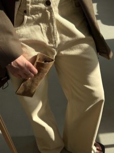 Очешник бренда SAAJ из натуральной замши цвета тауп. Внутри текстильная подкладка бежевого цвета. Изделие упаковано в тканевый мешок.