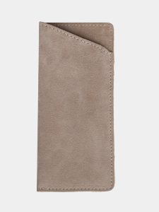 Очешник бренда SAAJ из натуральной замши коричневого цвета. Внутри текстильная подкладка бежевого цвета. Изделие упаковано в тканевый мешок.