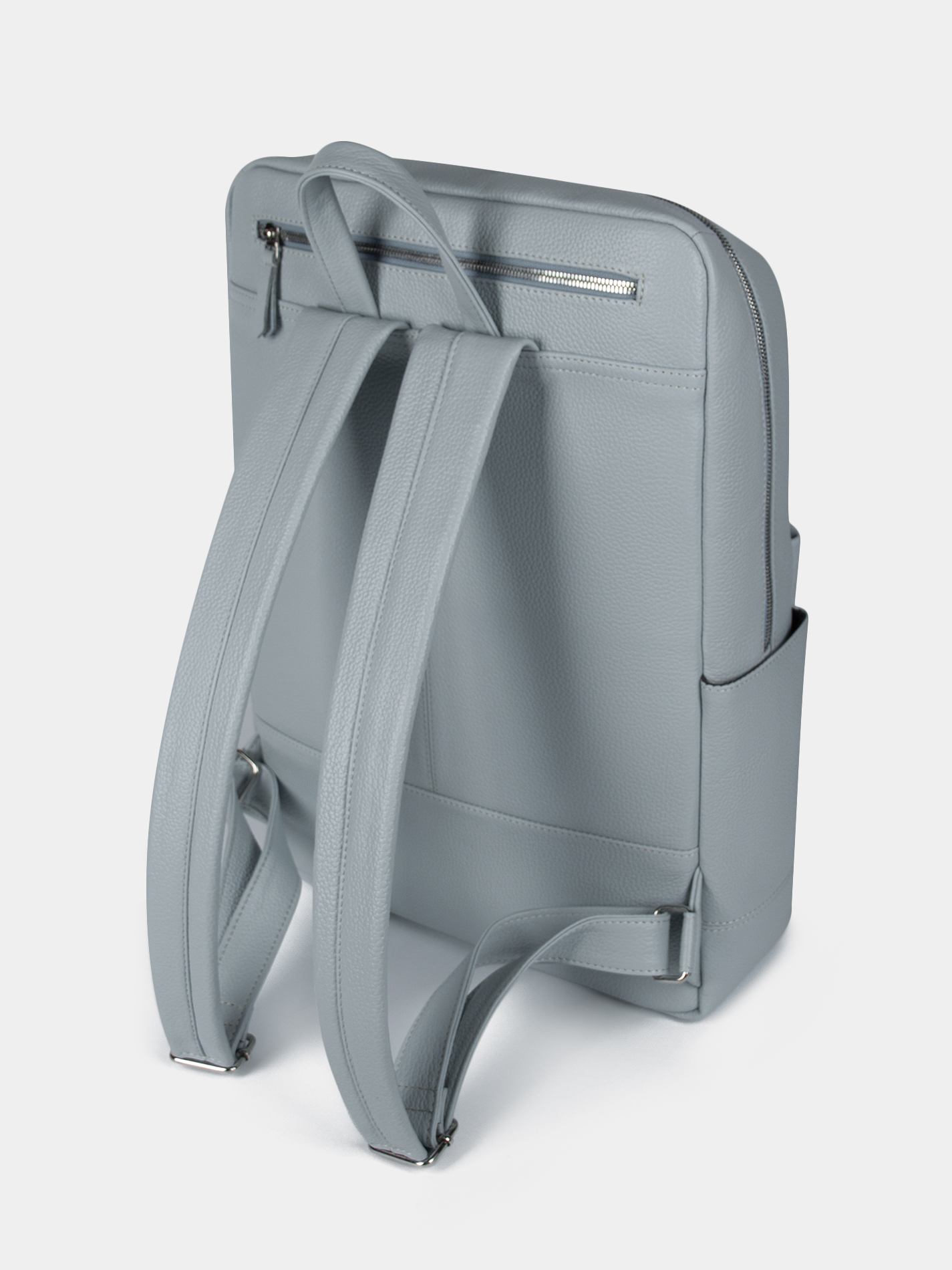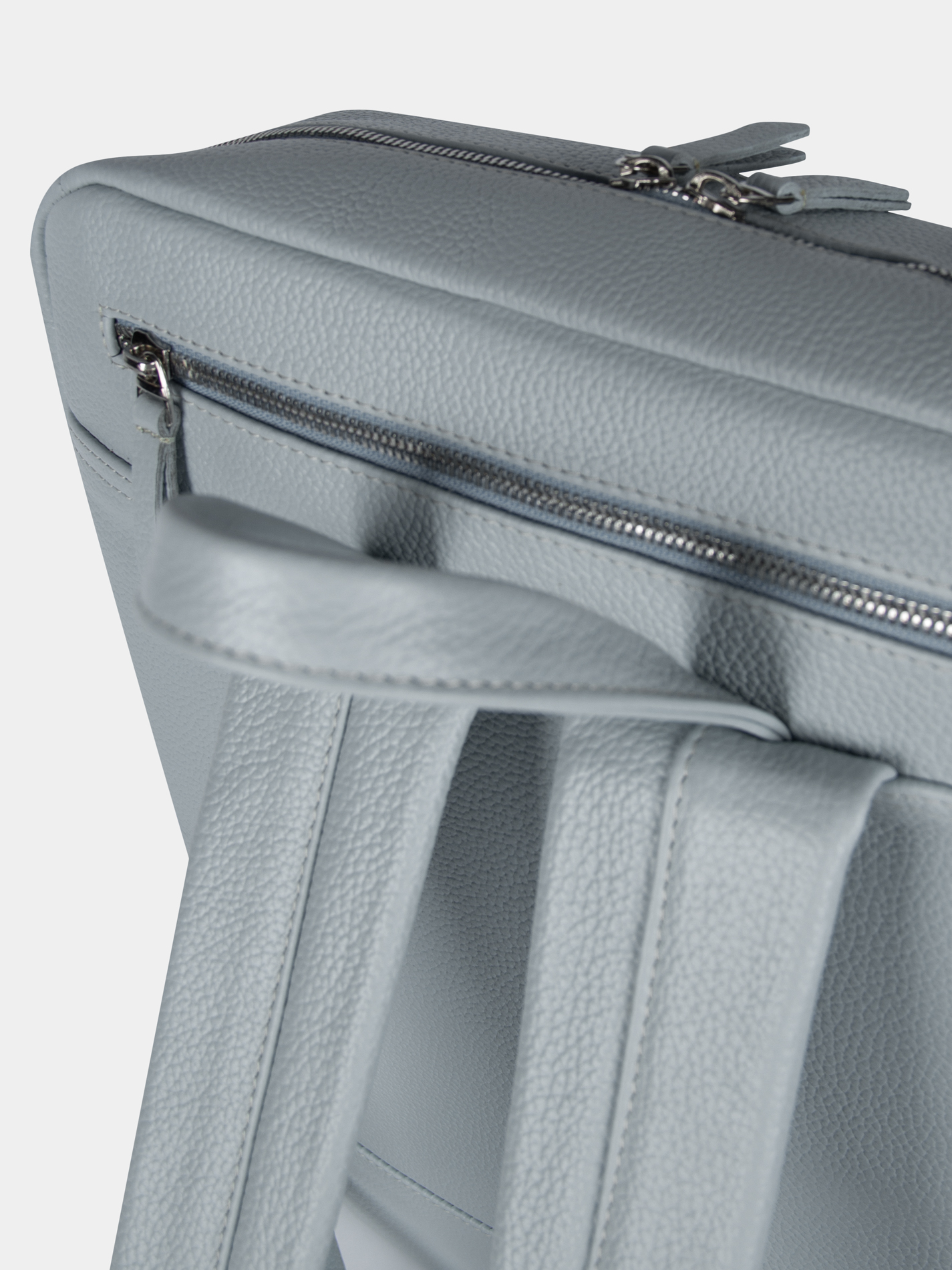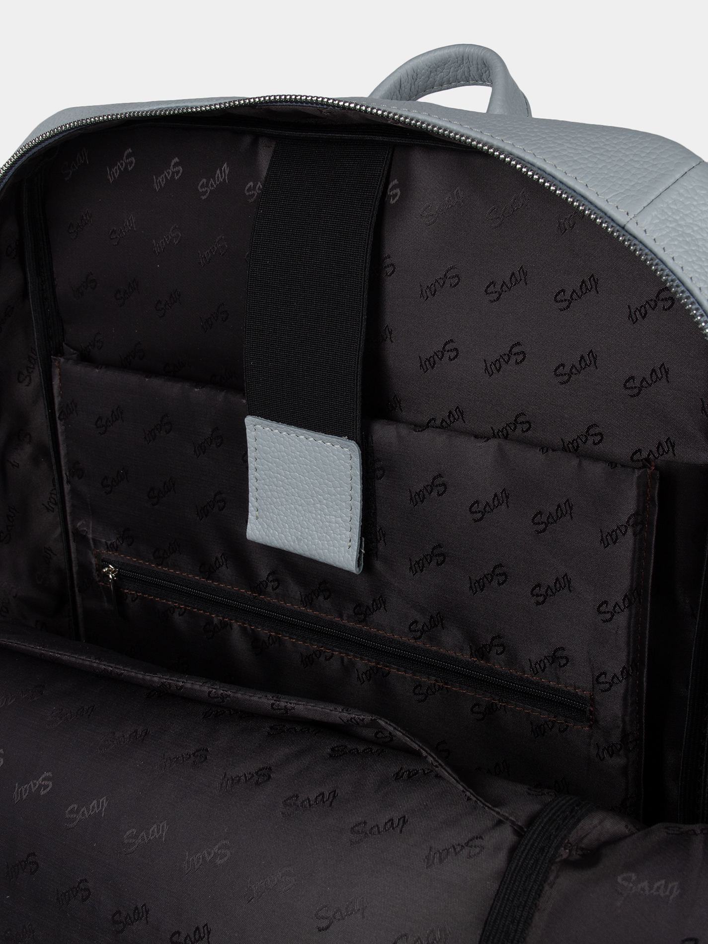 Городской рюкзак торговой марки SAAJ из натуральной кожи небесного цвета имеет 2 отделения. Внутри основного отделения открытый карман для документов формата А4, карман на молнии и открытое отделение для ноутбука 17 дюймов. На передней и задней стенках расположены карманы на молнии. По бокам рюкзака открытые карманы. Максимальная длина плечевых ремней 83 см, минимальная 70 см. Изделие упаковано в тканевый мешок.