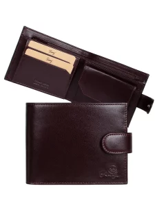 Кошелек торговой марки SAAJ из натуральной кожи. Портмоне с клапаном на кнопке. Внутри 3 отдела для купюр (из них один на молнии), один карман для мелочи с клапаном на кнопке, 2 прозрачных окошка для пропуска и водительского удостоверения (9.5 × 7.3 см и 9.7 × 6.3 см), 2 кармана для пластиковых карт. Изделие упаковано в фирменную подарочную картонную коробку с логотипом фирмы.
