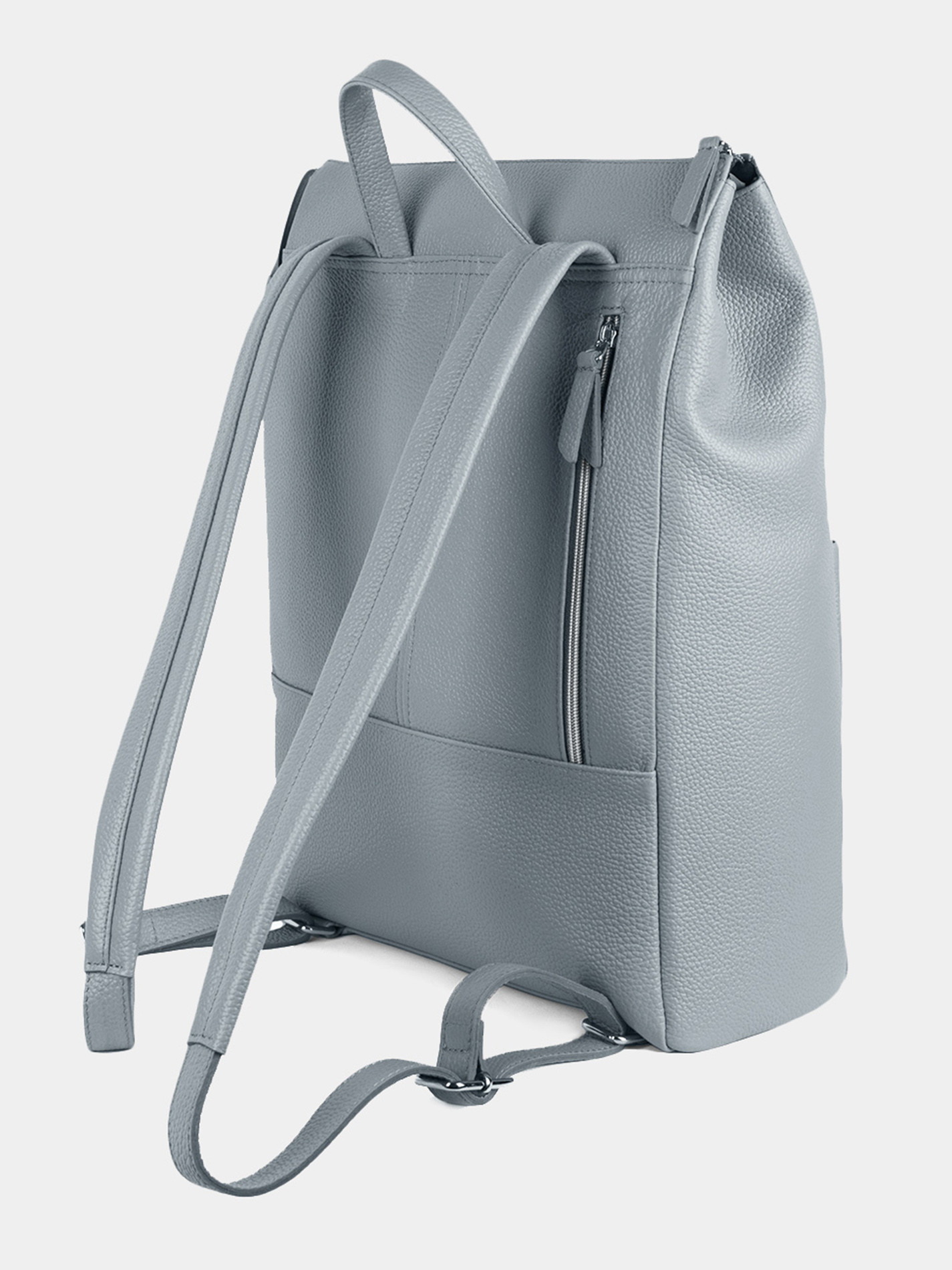 Городской рюкзак торговой марки SAAJ из натуральной кожи небесного цвета. Рюкзак закрывается на молнию. На задней и передней стенках карман на молнии. Внутри отделение для ноутбука 15 дюймов и формата А4, 1 карман на молнии, 2 открытых кармана. В основное отделение помещается ноутбук 16 дюймов. Максимальный вес содержимого рассчитан до 3,5 кг. Максимальная длина плечевых ремней 78 см, минимальная длина 65 см. Также имеется короткая ручка. Изделие упаковано в тканевый мешок.