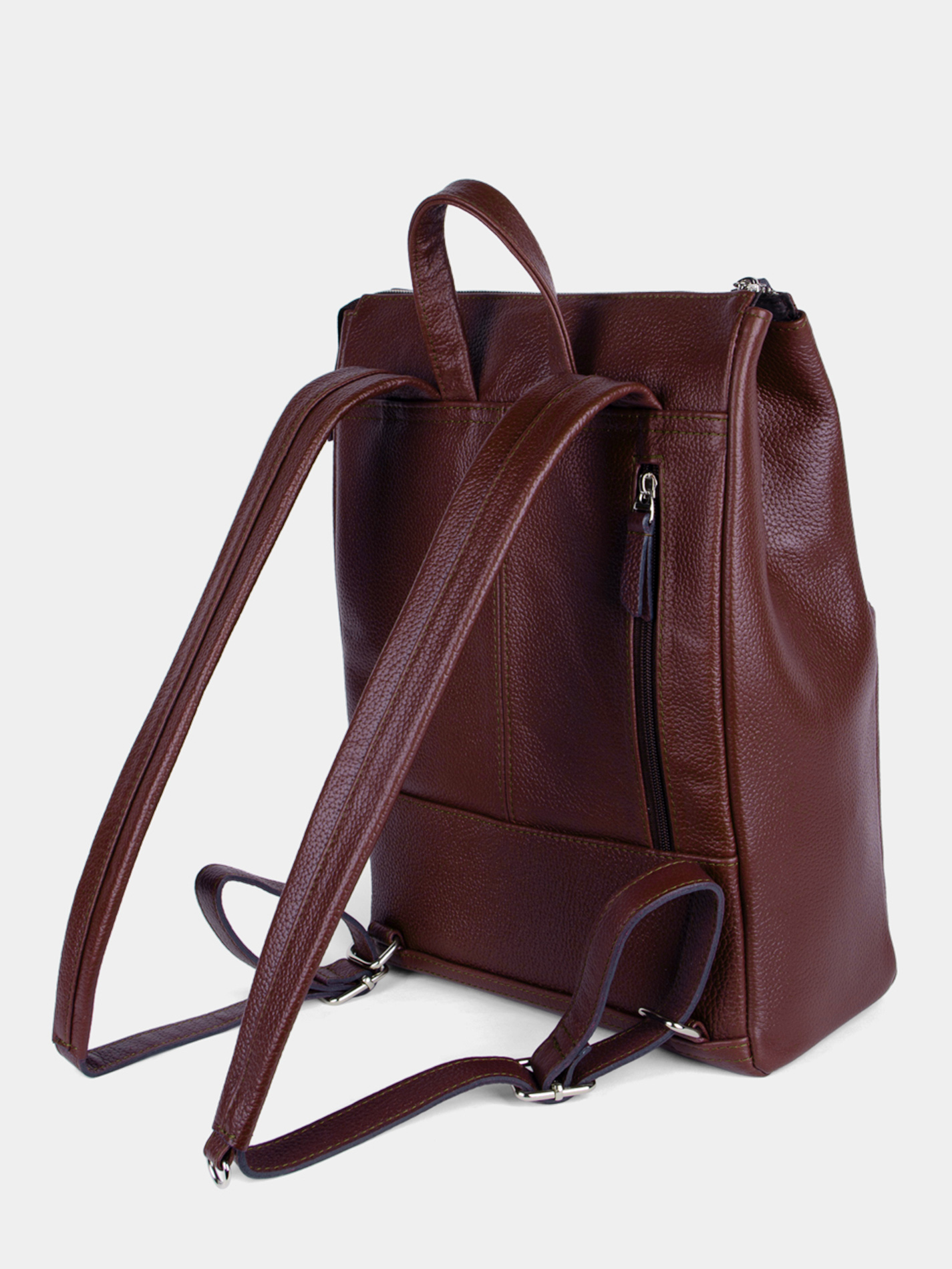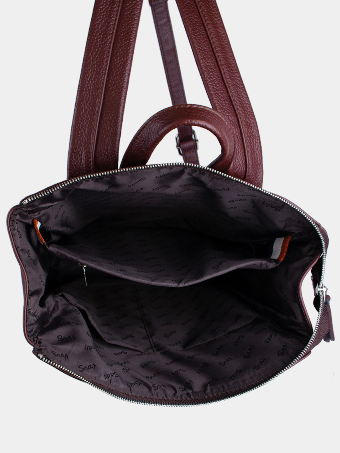 Городской рюкзак торговой марки SAAJ из натуральной кожи. Рюкзак закрывается на молнию. На задней и передней стенках карман на молнии. Внутри отделение для ноутбука 14 дюймов и формата А4, 1 карман на молнии, 2 открытых кармана. Максимальный вес содержимого рассчитан до 3,5 кг. Максимальная длина плечевых ремней 80 см, минимальная длина 64 см. Также имеется короткая ручка. Изделие упаковано в тканевый мешок.