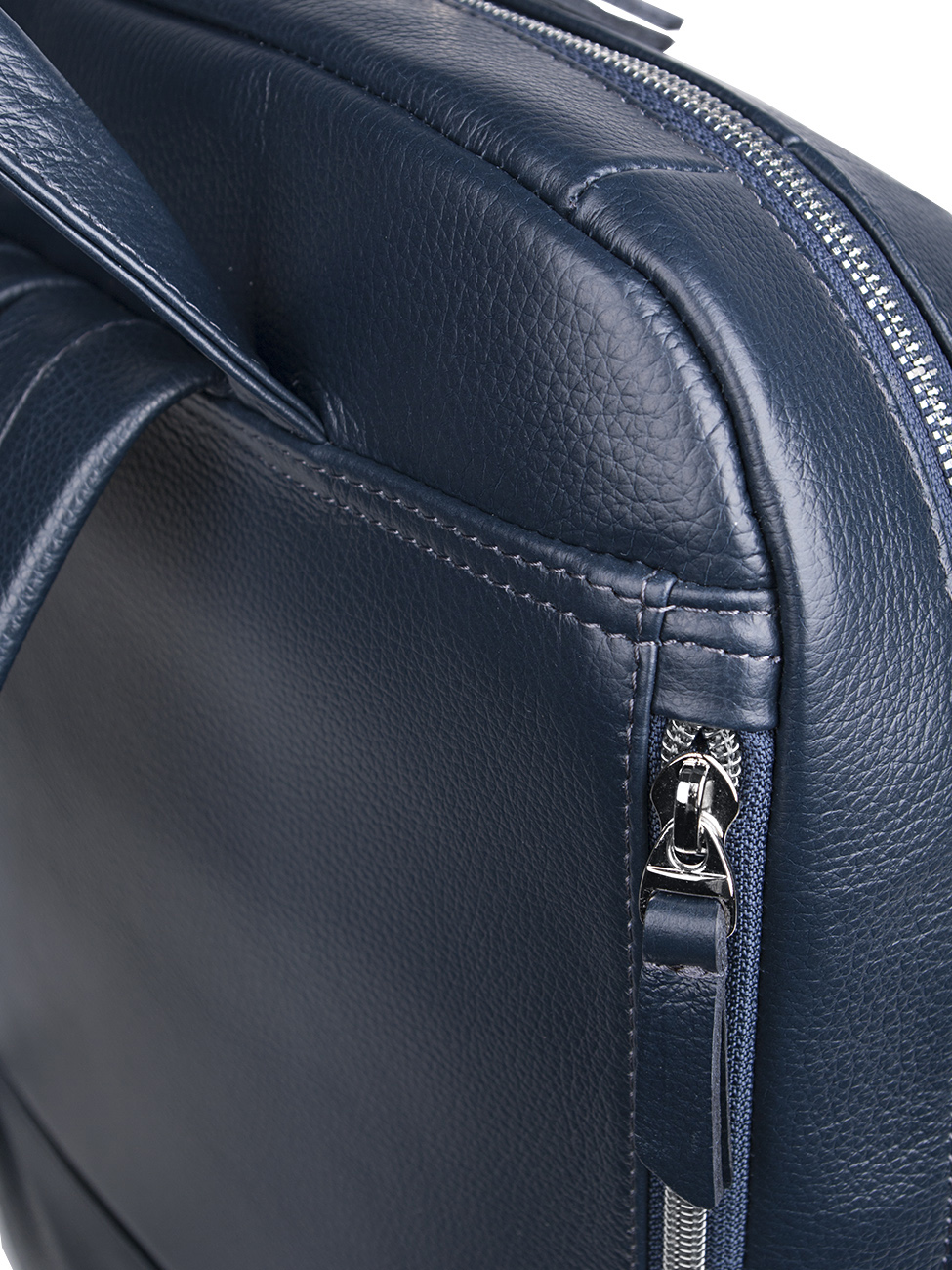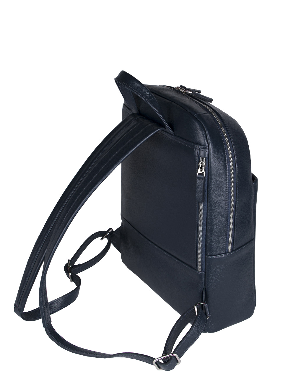 Городской рюкзак для ноутбука бренда SAAJ из натуральной кожи синего цвета. В рюкзаке одно отделение. Внутри основного отделения карман на молнии и отделение для ноутбука 14" (размеры 32,3 * 21,5 см). В основное отделение входит формат А4. На передней и задней стенках карманы на молнии. Максимальный вес рассчитан до 3,5 кг. Плечевые регулируемые ремни рюкзака усилены. Максимальная длина плечевых ремней 80 см, минимальная длина 62 см. Верхнее расстояние между плечевыми ремнями 4,5 см. Изделие упаковано в тканевый мешок.