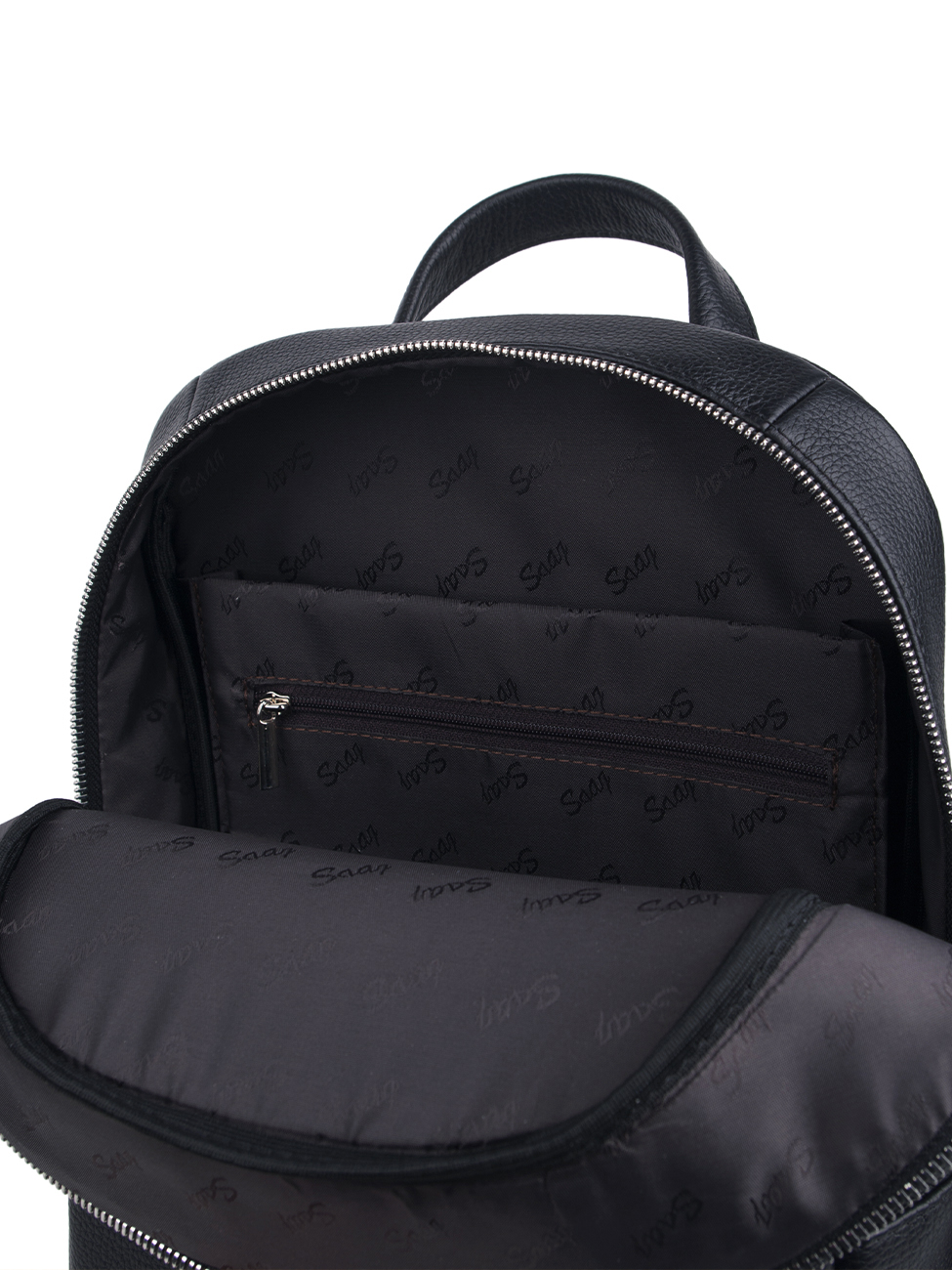 Городской рюкзак для планшета 11 дюймов бренда SAAJ из натуральной кожи черного цвета. Внутри основного отделения имеются карман на молнии, открытый карман для мелочи и открытое отделение для планшета. В рюкзак помещается бумага формата А4. На передней и задней стенках расположены карманы на молнии. Максимальная длина плечевых ремней 85 см, минимальная длина 68 см. Изделие упаковано в тканевый мешок.