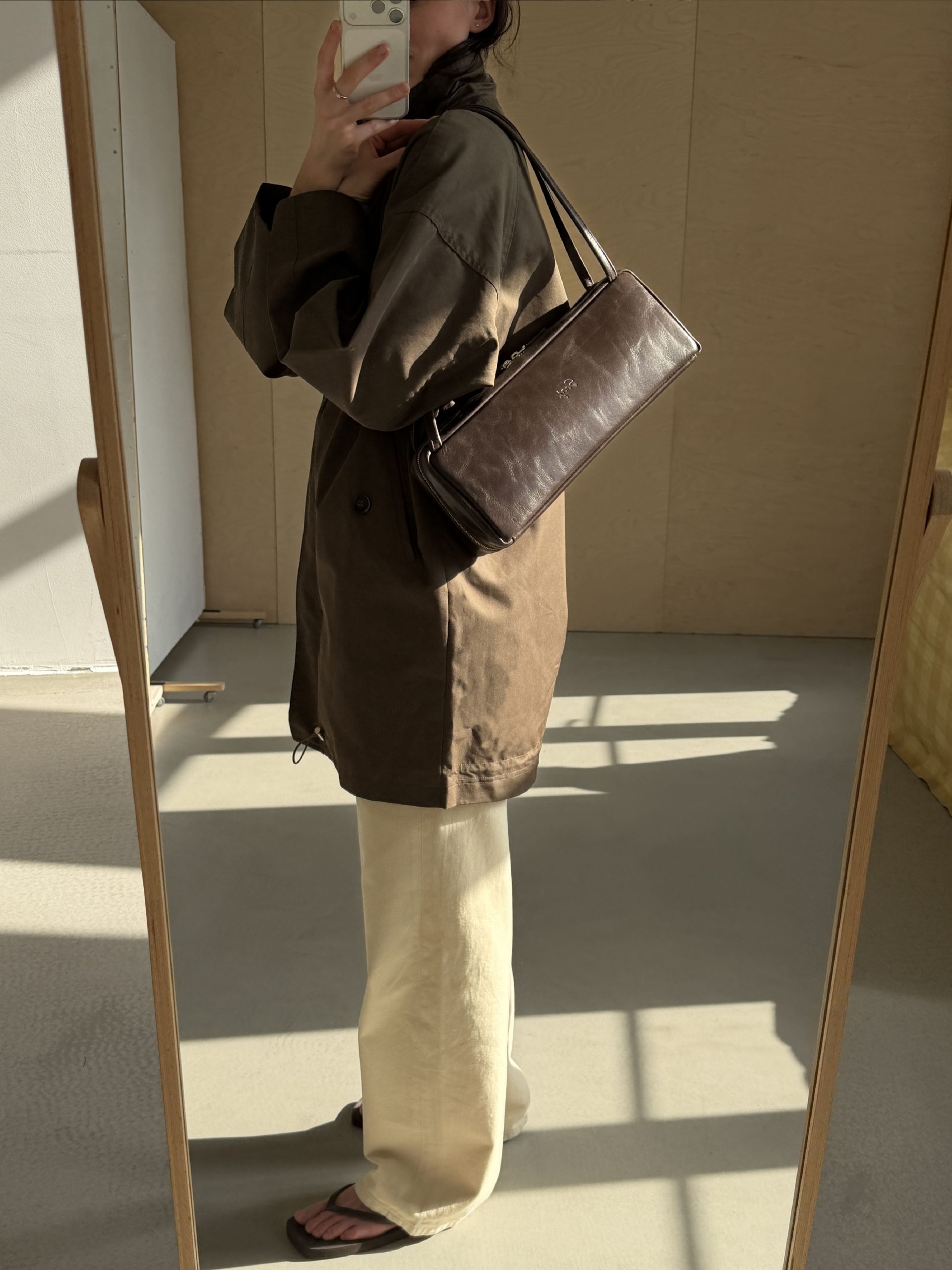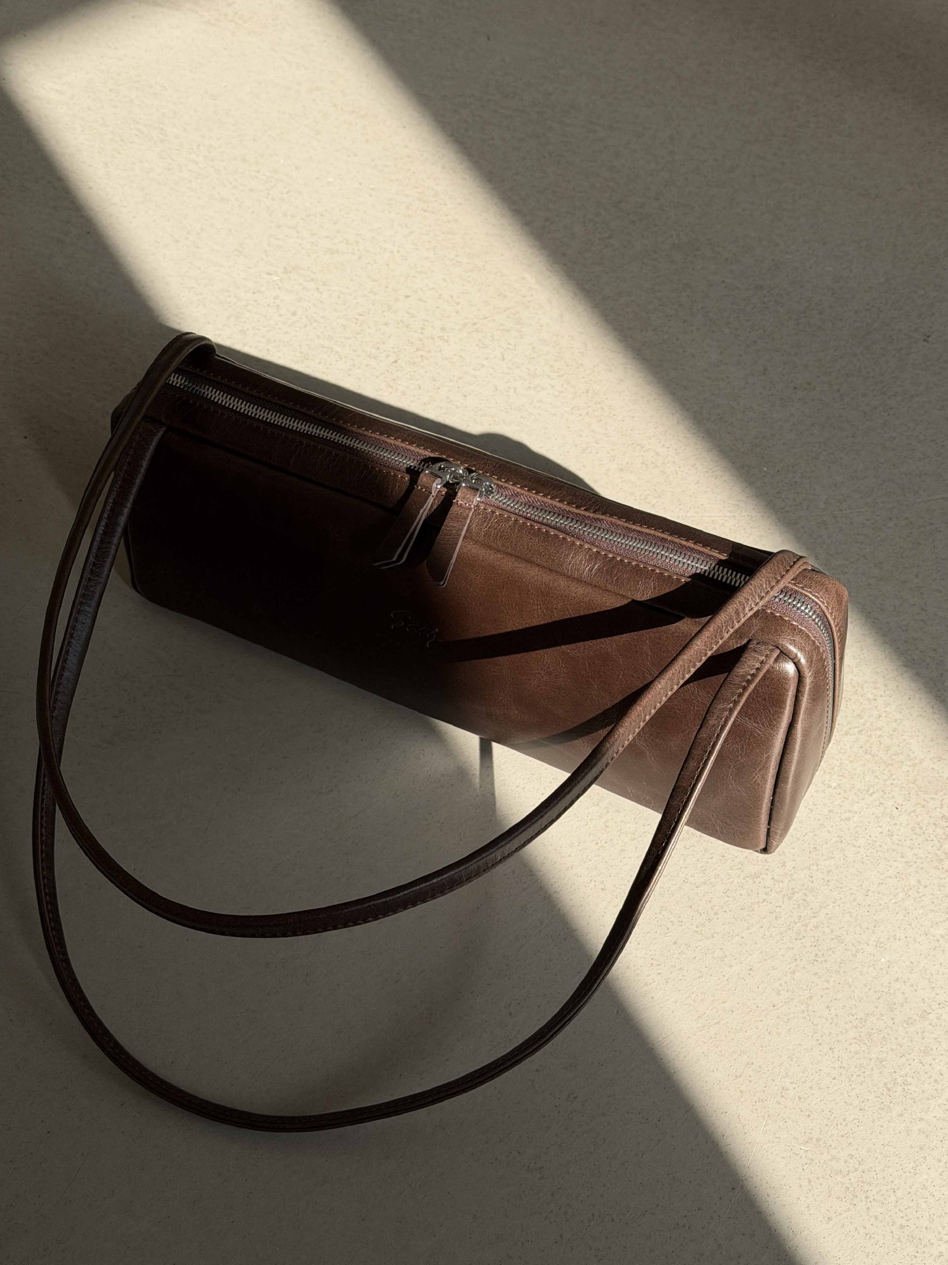 Сумка-такса из гладкой натуральной кожи коричневого цвета бренда SAAJ. Сумка имеет форму трапеции. Внутри: карман-перегородка на молнии, 2 открытых кармана для мелочи, 1 карман на молнии. Ручки вшиты на расстоянии 29 см друг от друга для удобства носки зимой с пуховиком. Высота ручек 31 см. Изделие упаковано в текстильный мешок.