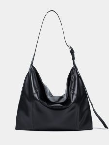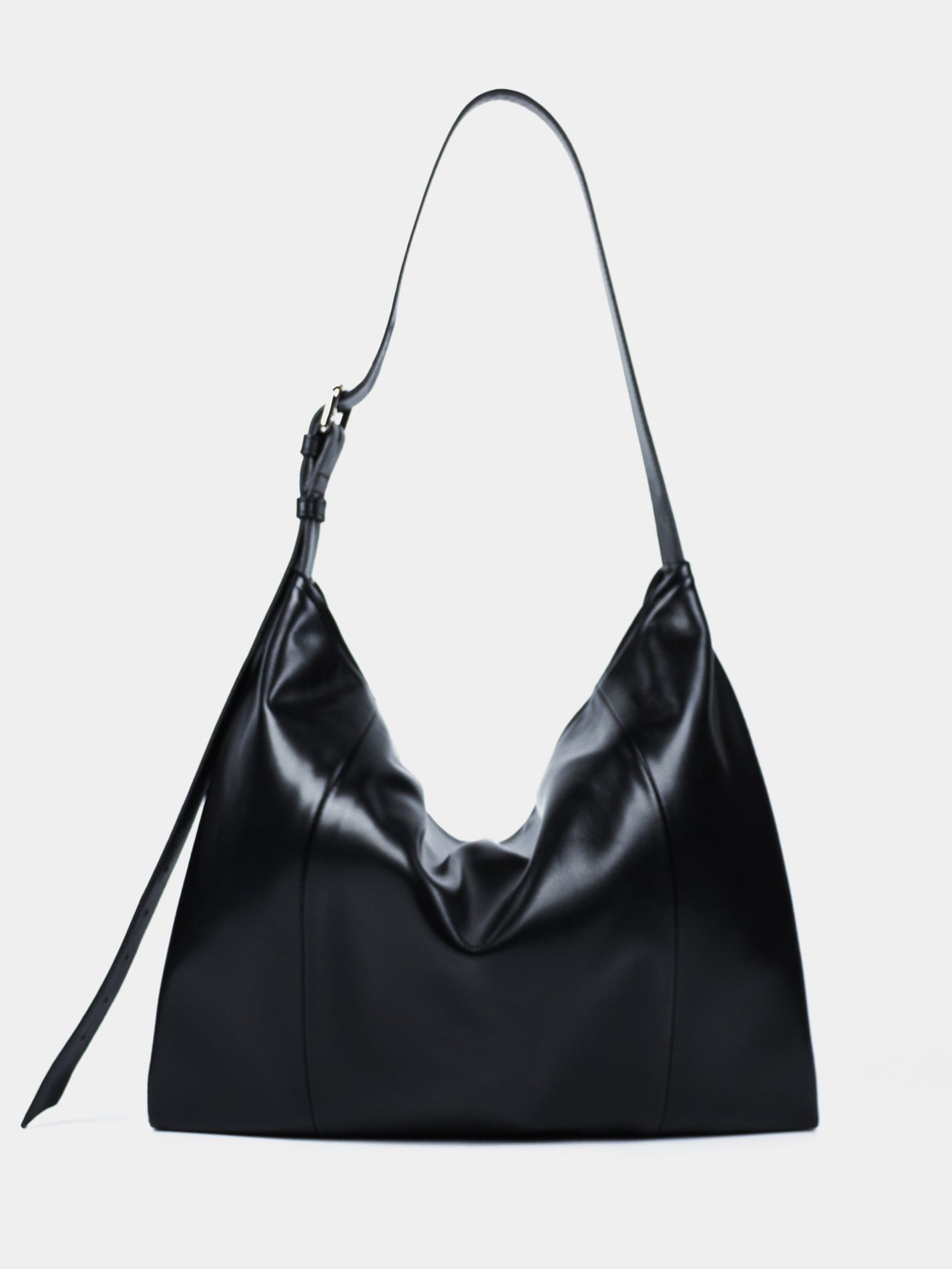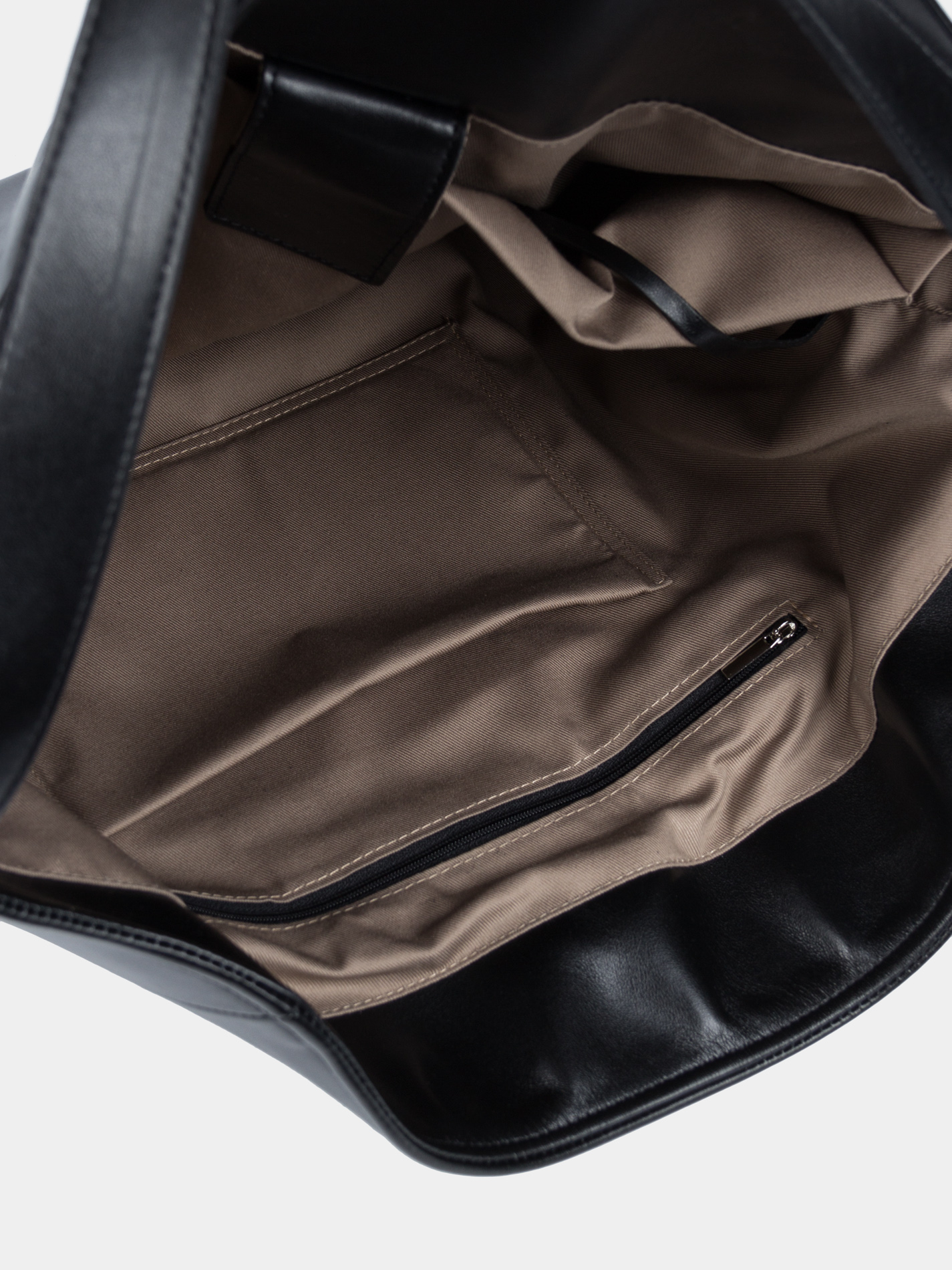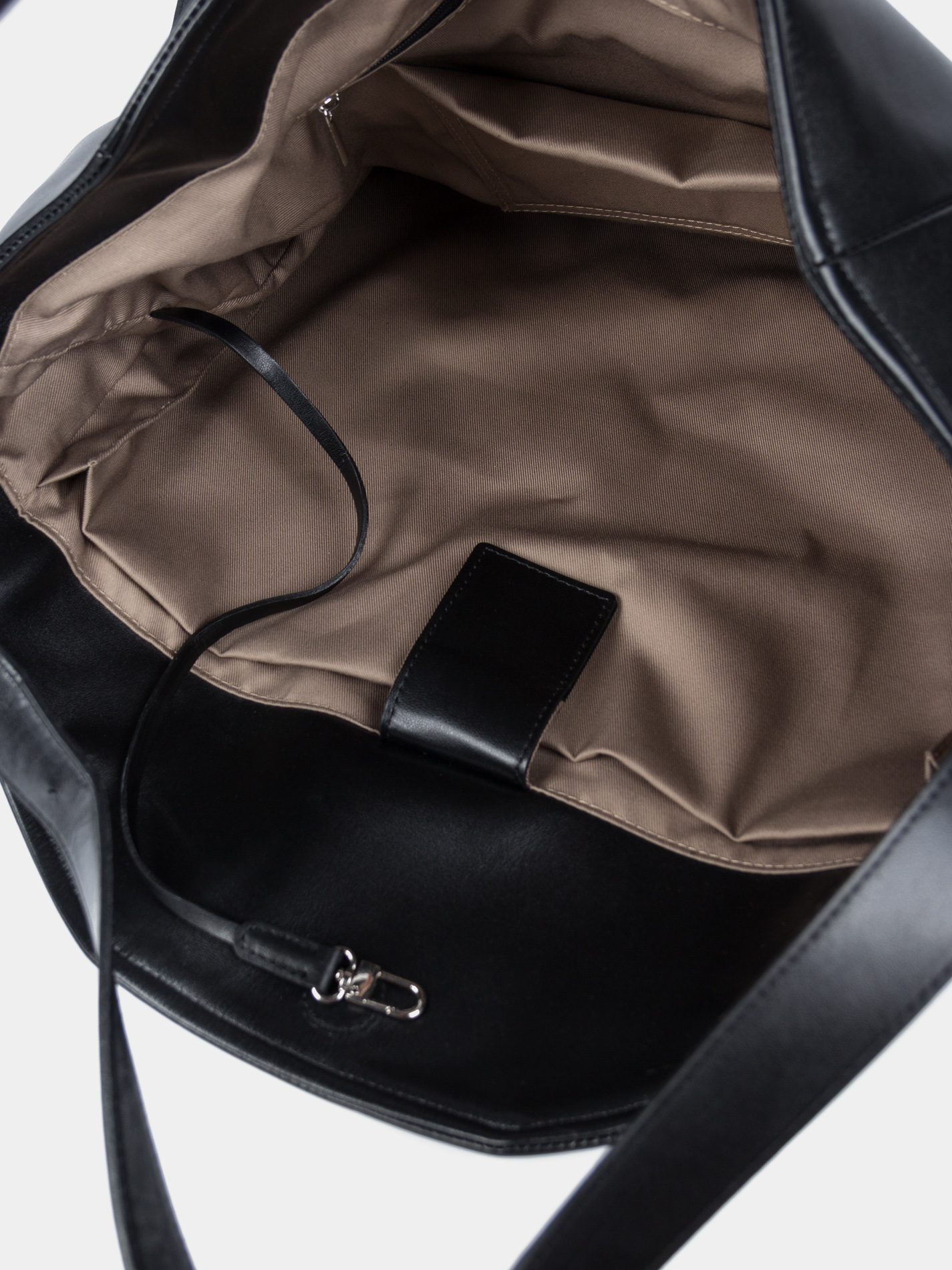 Вместительная сумка шоппер из гладкой высококачественной натуральной кожи черного цвета. Внутри одно вместительное отделение с карманом на липучке для ноутбука 16 дюймов, а также открытым карманом и карманом на молнии. Закрывается сумка на магнит. Длинный регулируемый ремень (48-113 см) позволяет носить сумку на плече или через плечо. Внутри есть ремешок с карабином для ключей. Подкладка бежевого цвета. Сумка упакована в тканевый мешок.