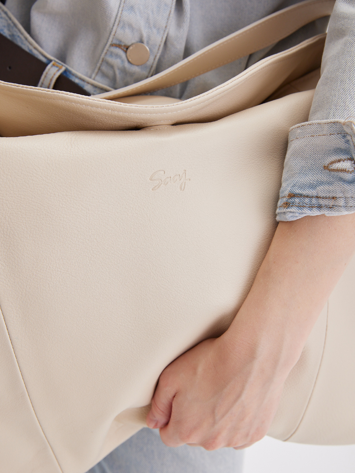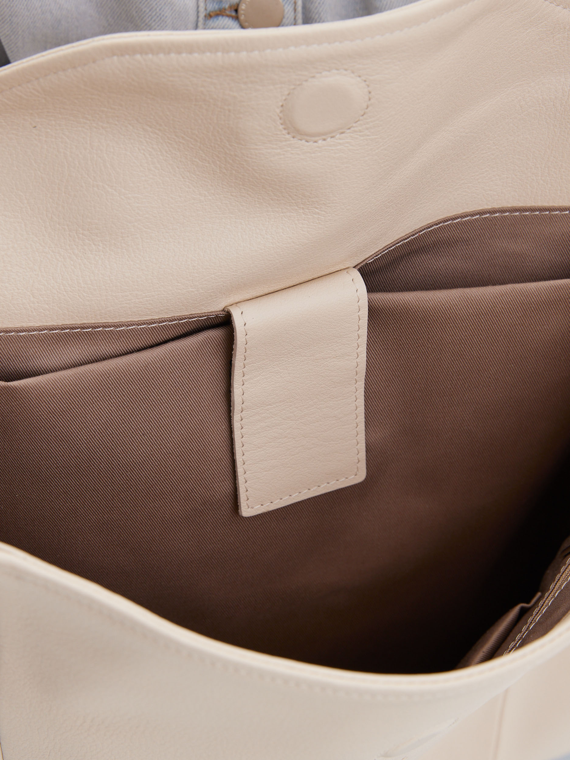 Вместительная сумка шоппер из гладкой высококачественной натуральной кожи молочного цвета. Внутри одно вместительное отделение с карманом на липучке для ноутбука 16 дюймов, а также открытым карманом и карманом на молнии. Закрывается сумка на магнит. Длинный регулируемый ремень (48-113 см) позволяет носить сумку на плече или через плечо. Внутри есть ремешок с карабином для ключей. Подкладка бежевого цвета. Сумка упакована в тканевый мешок.
