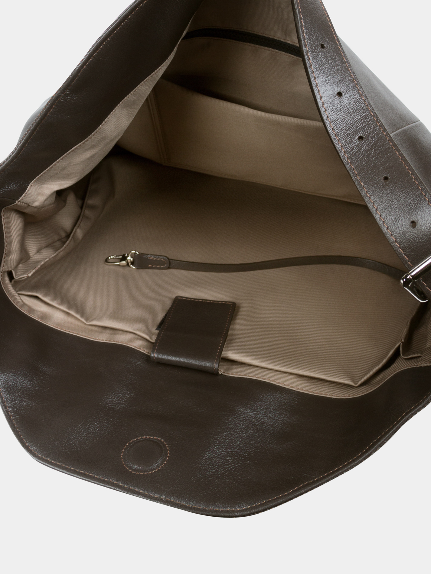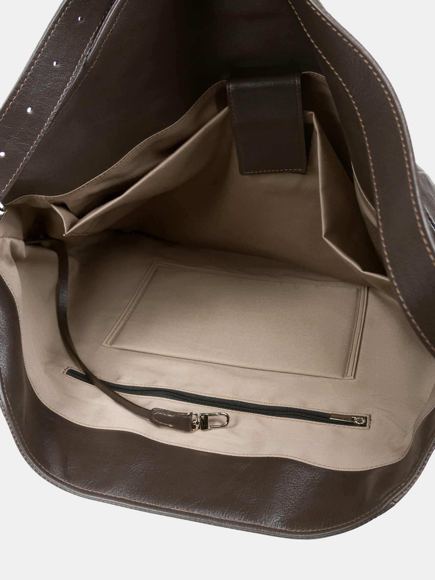Вместительная сумка шоппер из гладкой высококачественной натуральной кожи темно-коричневого цвета. Внутри одно вместительное отделение с карманом на липучке для ноутбука 16 дюймов, а также открытым карманом и карманом на молнии. Закрывается сумка на магнит. Длинный регулируемый ремень (48-113 см) позволяет носить сумку на плече или через плечо. Внутри есть ремешок с карабином для ключей. Подкладка бежевого цвета. Сумка упакована в тканевый мешок.