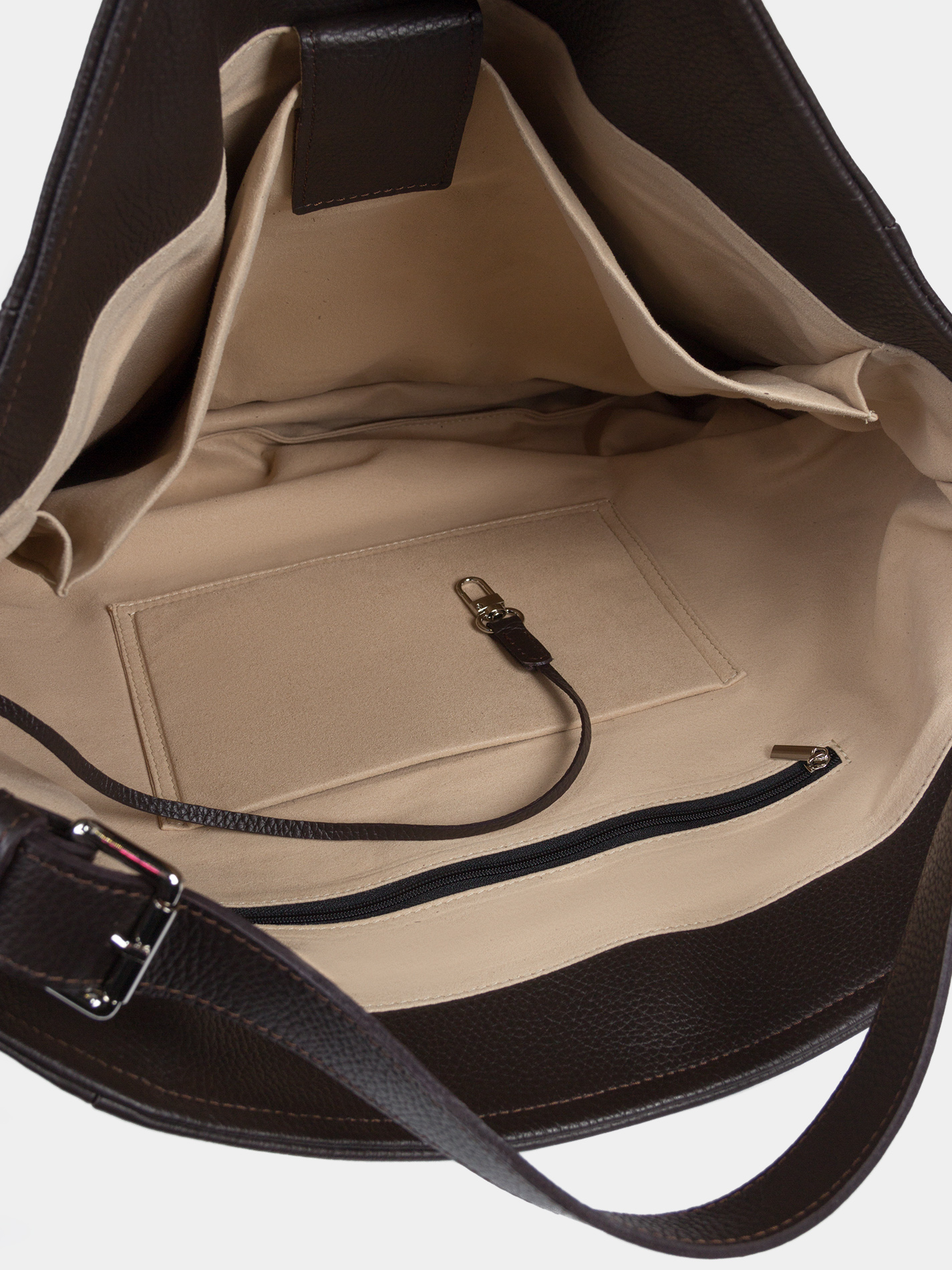 Вместительная сумка шоппер из зернистой высококачественной натуральной кожи темно-коричневого цвета. Внутри одно вместительное отделение с карманом на липучке для ноутбука 16 дюймов, а также открытым карманом и карманом на молнии. Закрывается сумка на магнит. Длинный регулируемый ремень (48-113 см) позволяет носить сумку на плече или через плечо. Внутри есть ремешок с карабином для ключей. Подкладка бежевого цвета. Сумка упакована в тканевый мешок.