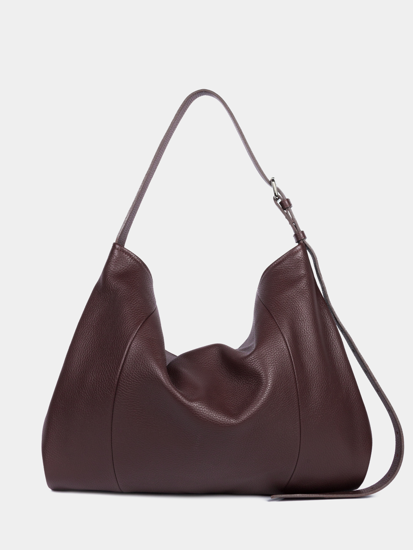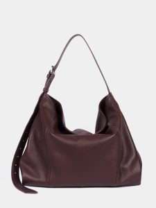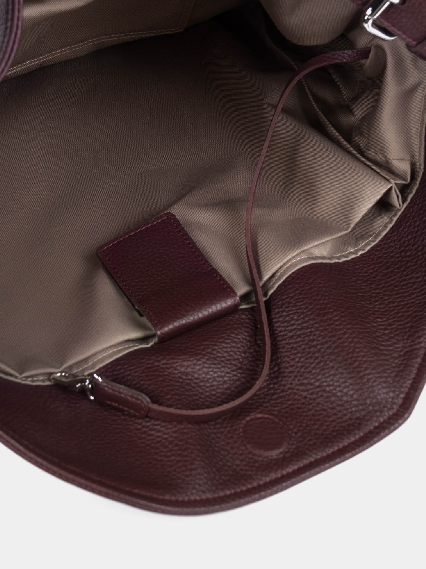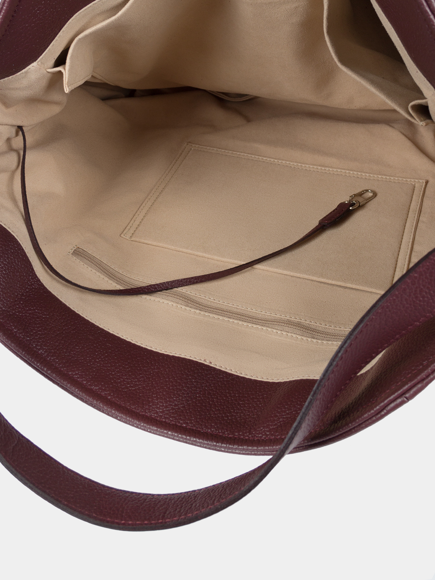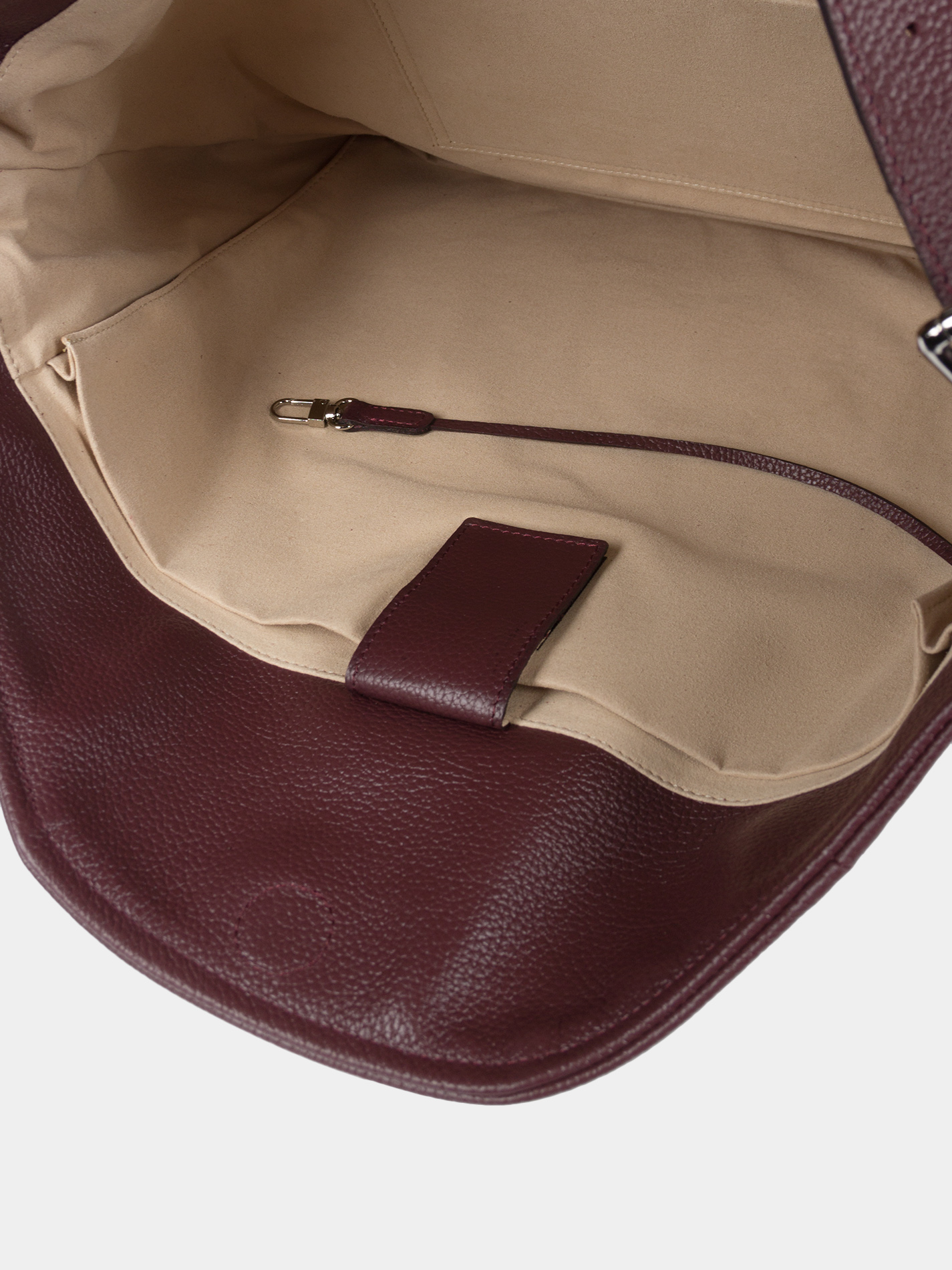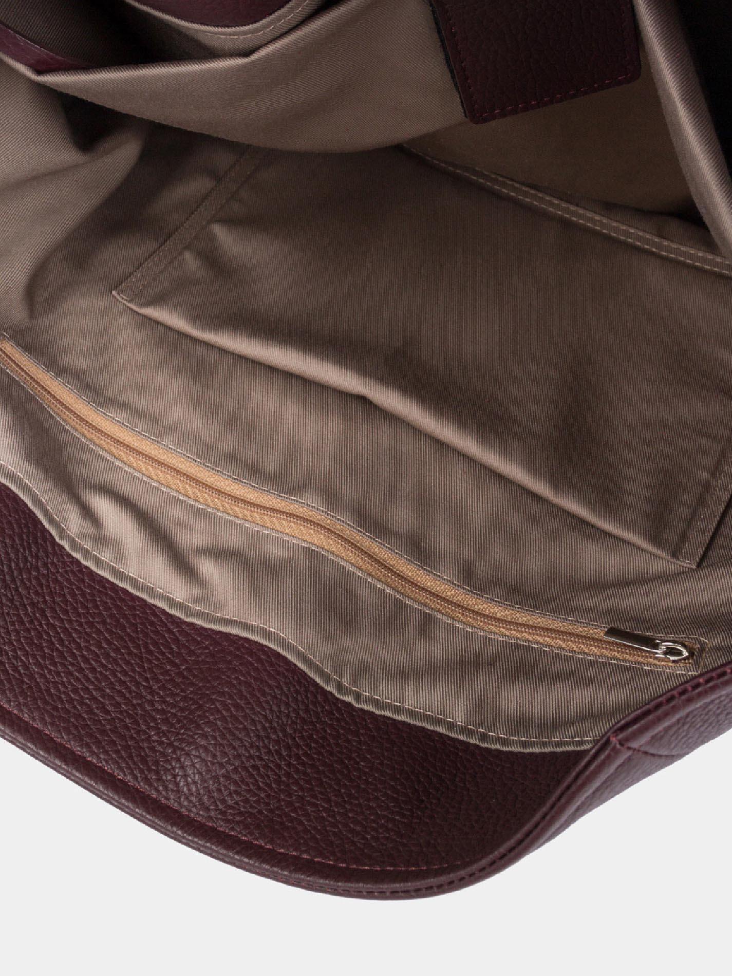 Вместительная сумка шоппер из зернистой высококачественной натуральной кожи цвета бургунди. Внутри одно вместительное отделение с карманом на липучке для ноутбука 16 дюймов, а также открытым карманом и карманом на молнии. Закрывается сумка на магнит. Длинный регулируемый ремень (48-113 см) позволяет носить сумку на плече или через плечо. Внутри есть ремешок с карабином для ключей. Подкладка бежевого цвета. Сумка упакована в тканевый мешок.