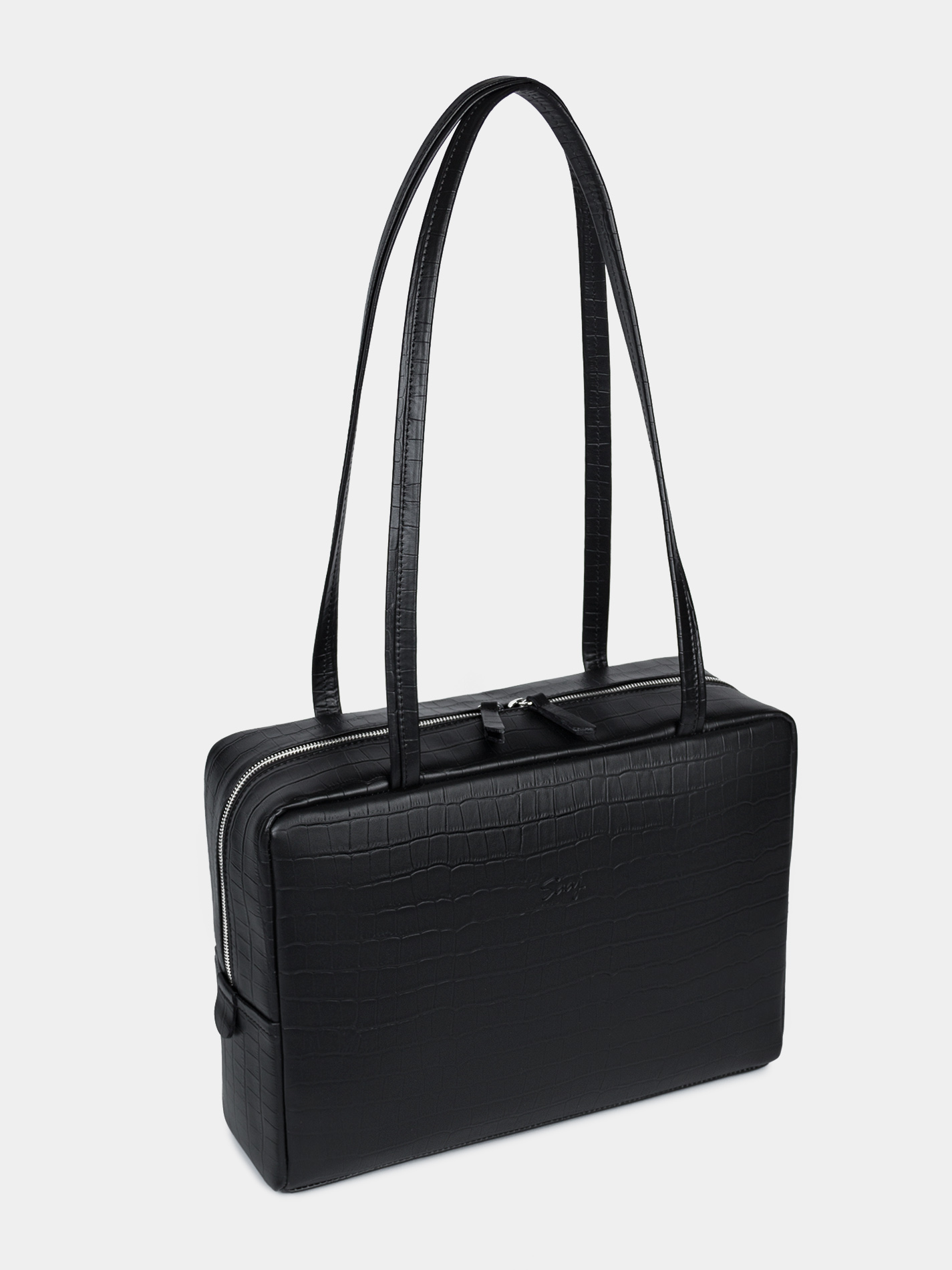 Сумка Айтишница 14 из высококачественной натуральной кожи с тиснением под крокодила черного цвета с металлической молнией. В сумке карман на молнии для ценных вещей, а также откидной карман на липучках для ноутбука 14 дюймов и формата А4. Откидной карман (длина — 32 см, высота — 23 см, глубина — 2,5 см) оберегает ноутбук от ударов и царапин от молнии. У сумки предусмотрены длинные функциональные ручки (37 см) для носки в руках и на плече. Интересный стильный вариант на каждый день. Рекомендованная нагрузка до 3,5 кг. Изделие упаковано в текстильный мешок. SAAJ