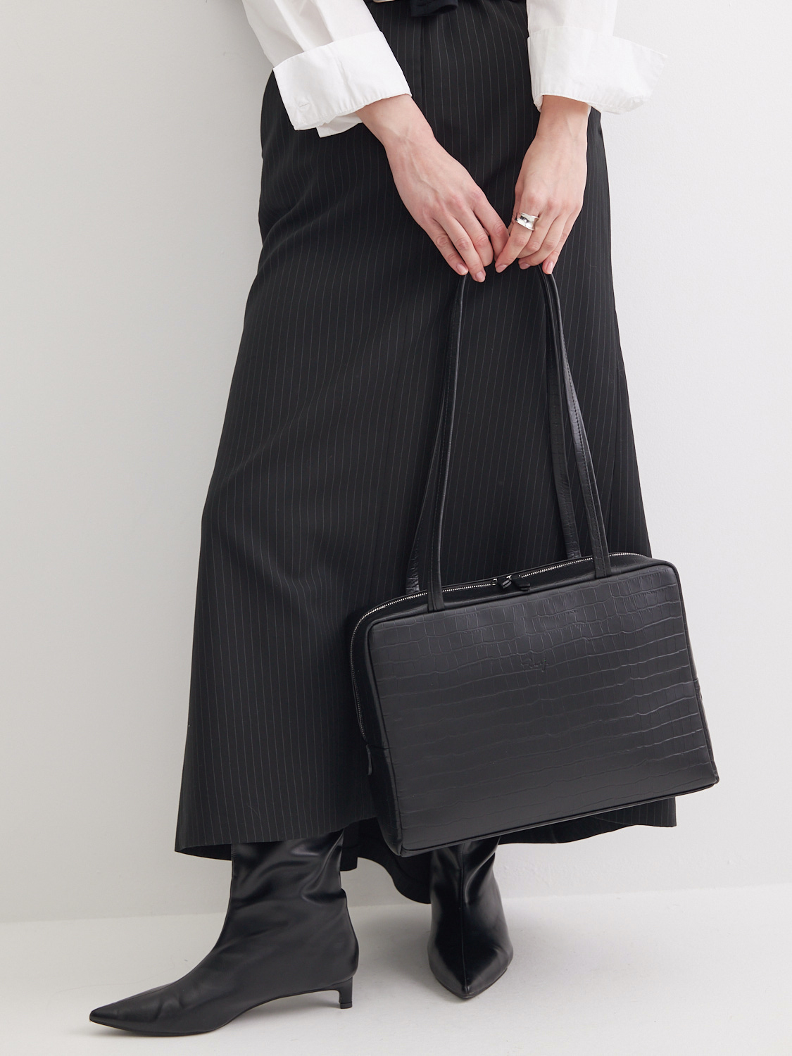 Сумка Айтишница 14 из высококачественной натуральной кожи с тиснением под крокодила черного цвета с металлической молнией. В сумке карман на молнии для ценных вещей, а также откидной карман на липучках для ноутбука 14 дюймов и формата А4. Откидной карман (длина — 32 см, высота — 23 см, глубина — 2,5 см) оберегает ноутбук от ударов и царапин от молнии. У сумки предусмотрены длинные функциональные ручки (37 см) для носки в руках и на плече. Интересный стильный вариант на каждый день. Рекомендованная постоянная нагрузка до 3,5 кг. Изделие упаковано в текстильный мешок.