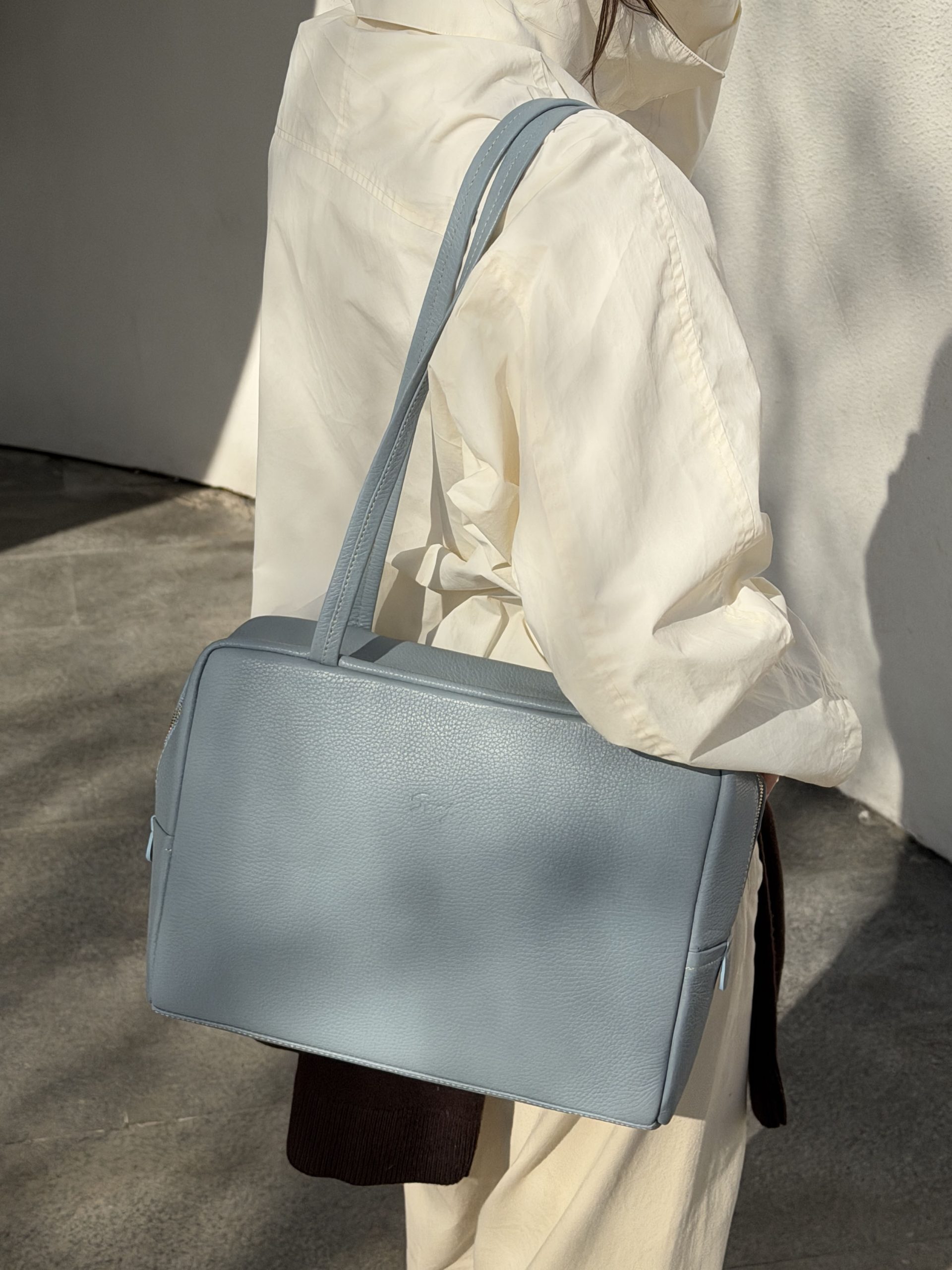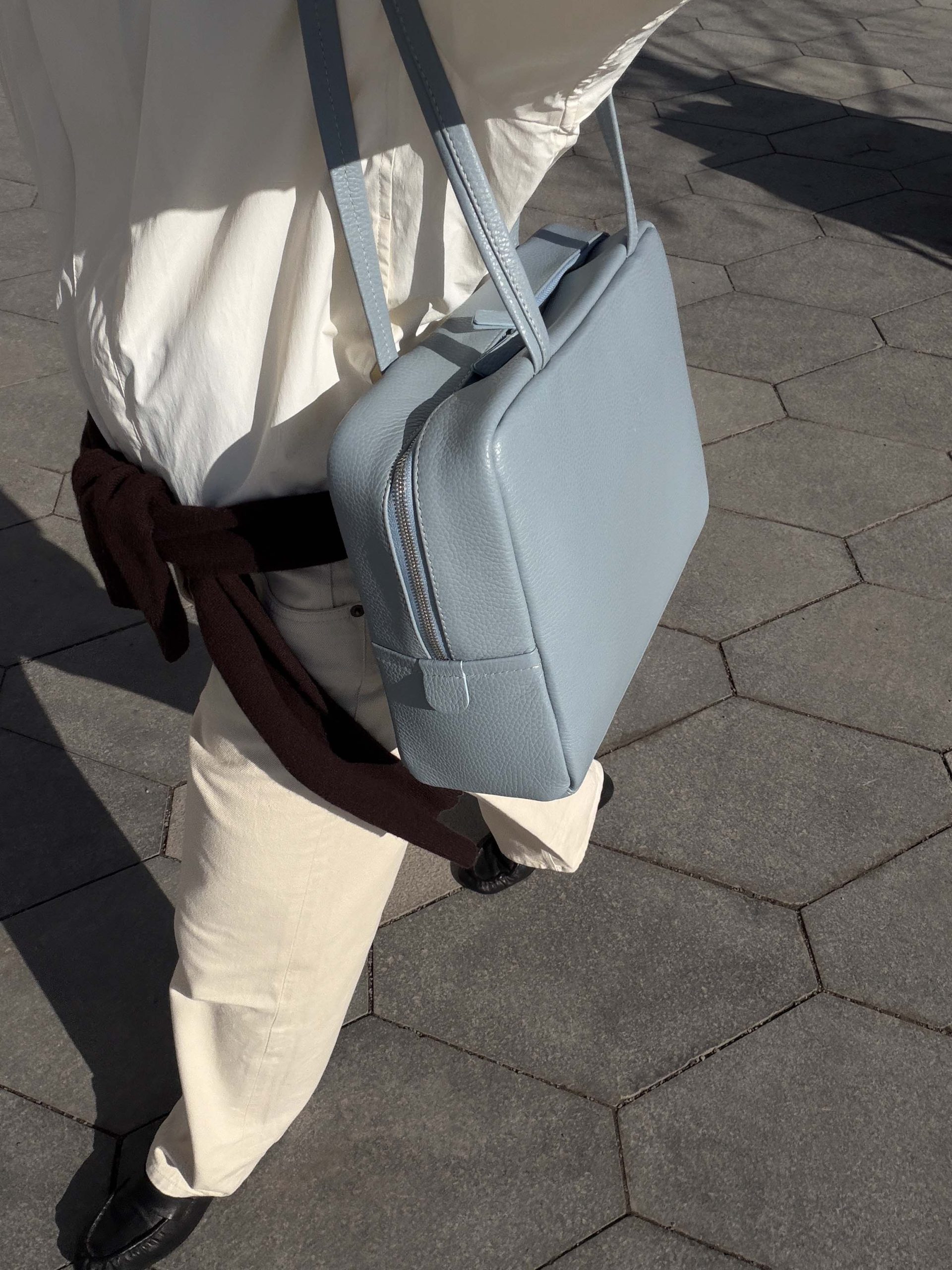 Сумка Айтишница 14 из высококачественной натуральной кожи небесного цвета с металлической молнией. В сумке карман на молнии для ценных вещей, а также откидной карман на липучках для ноутбука 14 дюймов и формата А4. Откидной карман (длина — 32 см, высота — 23 см, глубина — 2,5 см) оберегает ноутбук от ударов и царапин от молнии. У сумки предусмотрены длинные функциональные ручки (37 см) для носки в руках и на плече. Интересный стильный вариант на каждый день. Рекомендованная нагрузка до 3,5 кг. Изделие упаковано в текстильный мешок.