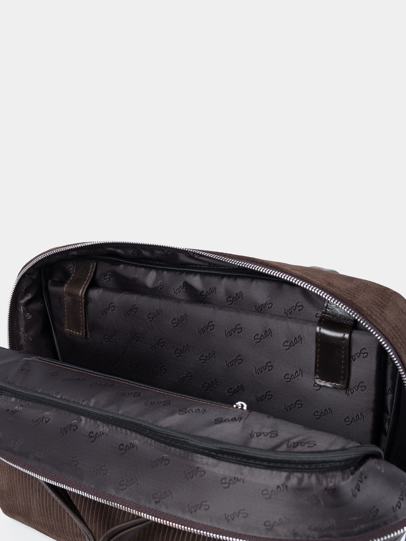Сумка Айтишница 14 из высококачественной натуральной замши (вельвет) коричневого цвета (полосы вертикальные) в комбинации с натуральной кожей коричневого цвета. Сумка закрывается на металлическую молнию. В сумке карман на молнии для ценных вещей, а также откидной карман на липучках для ноутбука 14 дюймов и формата А4. Откидной карман (длина — 32 см, высота — 23 см, глубина — 2,5 см) оберегает ноутбук от ударов и царапин от молнии. У сумки предусмотрены длинные функциональные ручки (37 см) для носки в руках и на плече. Интересный стильный вариант на каждый день. Рекомендованная нагрузка до 3,5 кг. Изделие упаковано в текстильный мешок.