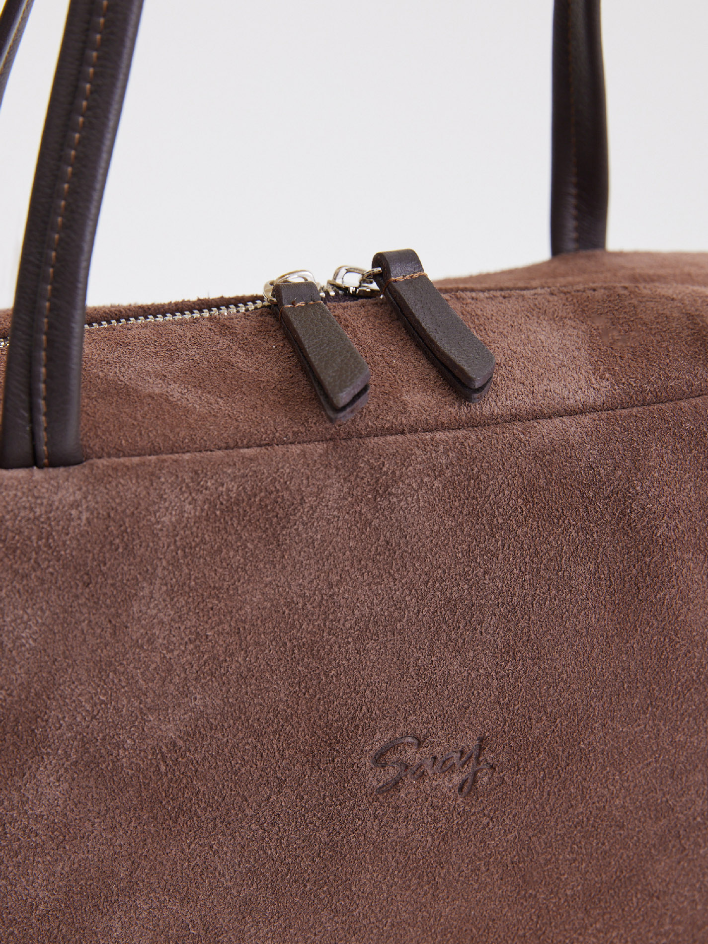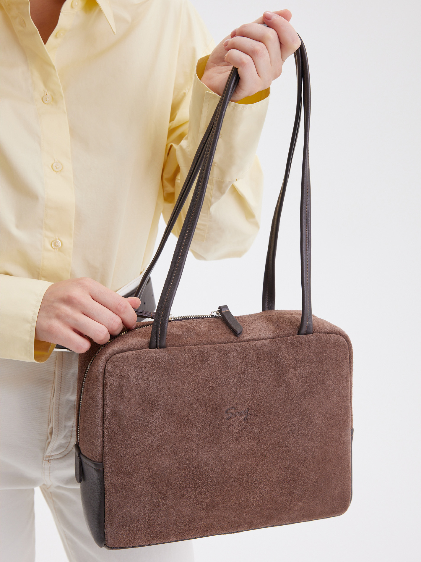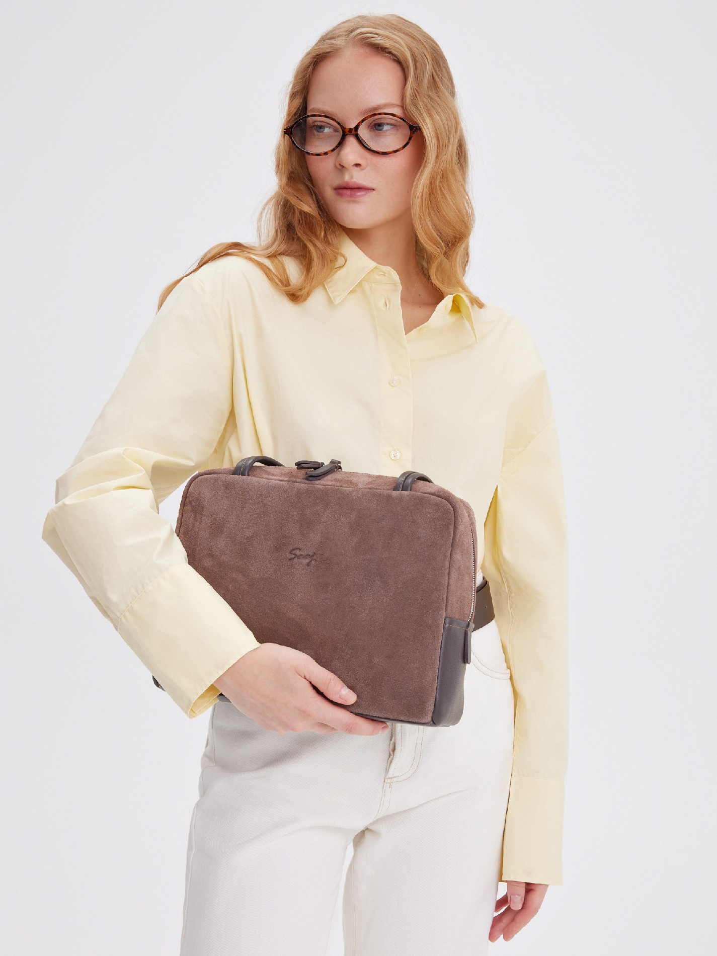 Женская сумка Айтишница MINI из натуральной замши цвета какао в комбинации с мелкозернистой кожей коричневого цвета с металлической молнией. Донышко и ручки из натуральной кожи. В сумке карман на молнии для ценных вещей, а также откидной карман на липучках для планшета 11 дюймов. В сумку вмещается формат А5. Откидной карман (длина — 26 см, высота — 18,5 см, глубина — 1,5 см) оберегает планшет от ударов и царапин от молнии. У сумки предусмотрены длинные функциональные ручки (31 см) для носки в руках и на плече. Интересный стильный вариант на каждый день. Изделие упаковано в текстильный мешок.