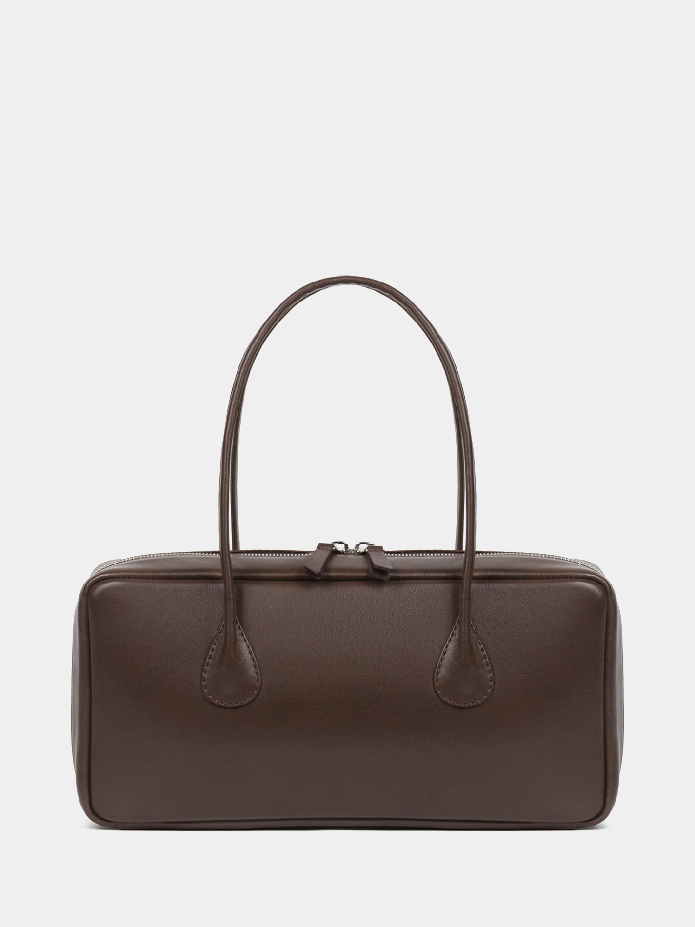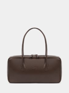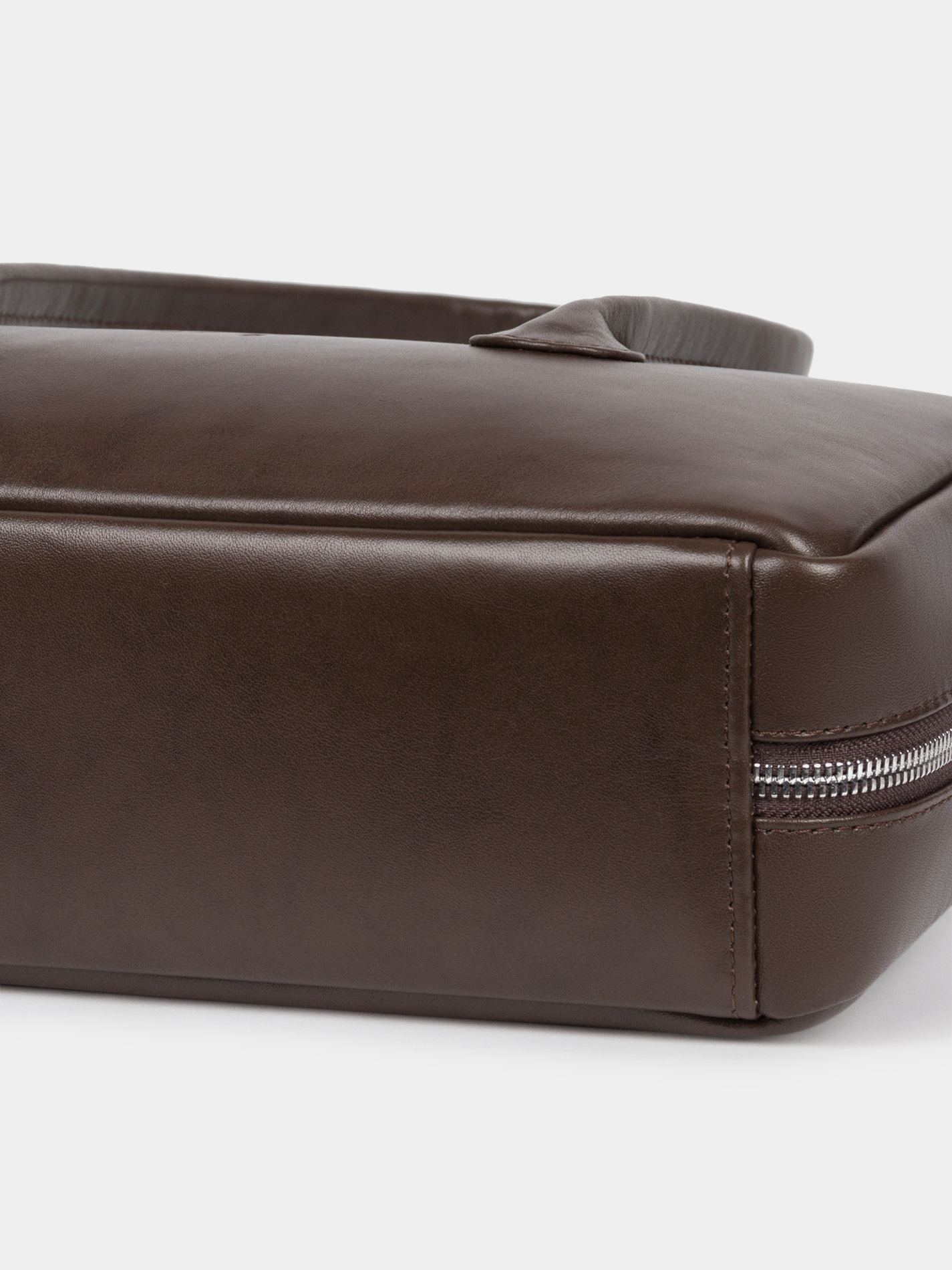Сумка-багет женская бренда SAAJ из гладкой высококачественной натуральной кожи коричневого цвета с эффектом «облака». У сумки одно отделение. Внутри карман-перегородка на молнии, два открытых кармана для мелочи, один карман на молнии. Высота ручек 18 см. Изделие упаковано текстильный мешок.