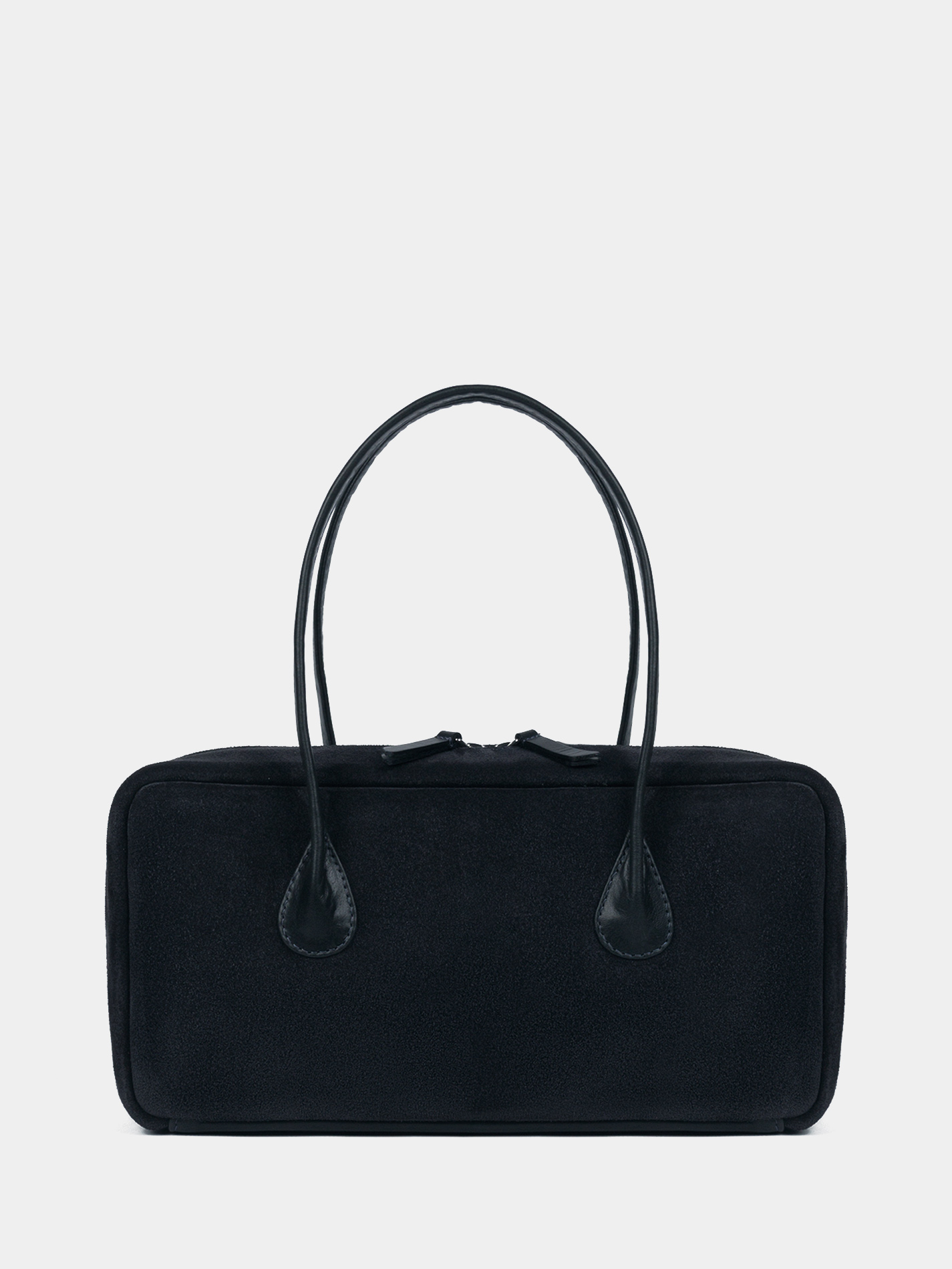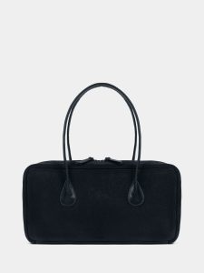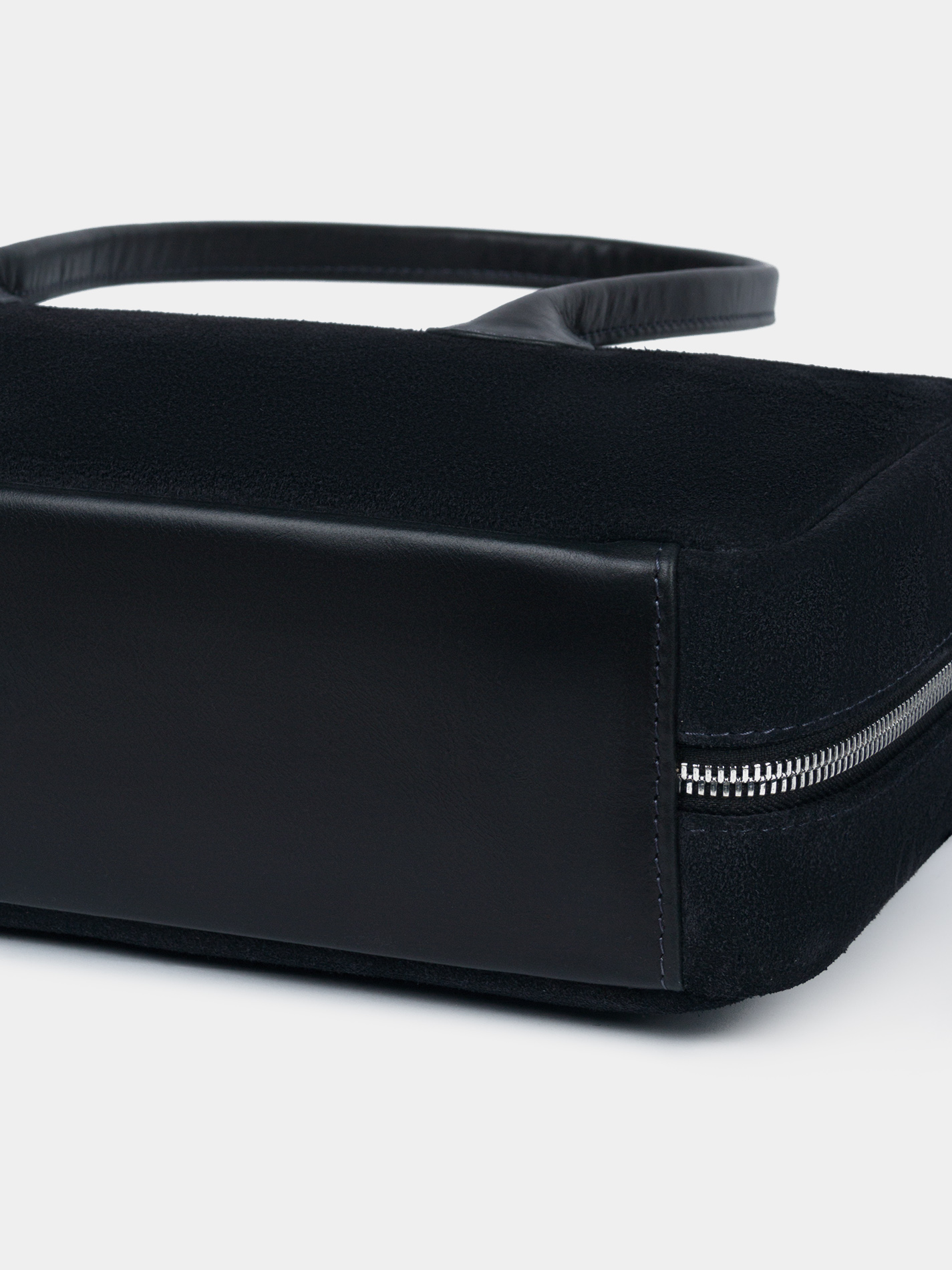 Сумка-багет женская бренда SAAJ из натуральной замши синего цвета в комбинации с натуральной кожей черного цвета. У сумки одно отделение. Внутри карман-перегородка на молнии, 2 открытых кармана для мелочи, 1 карман на молнии. 2 ручки и донышко выполнены из натуральной кожи. Высота ручек 18 см. Изделие упаковано в текстильный мешок.