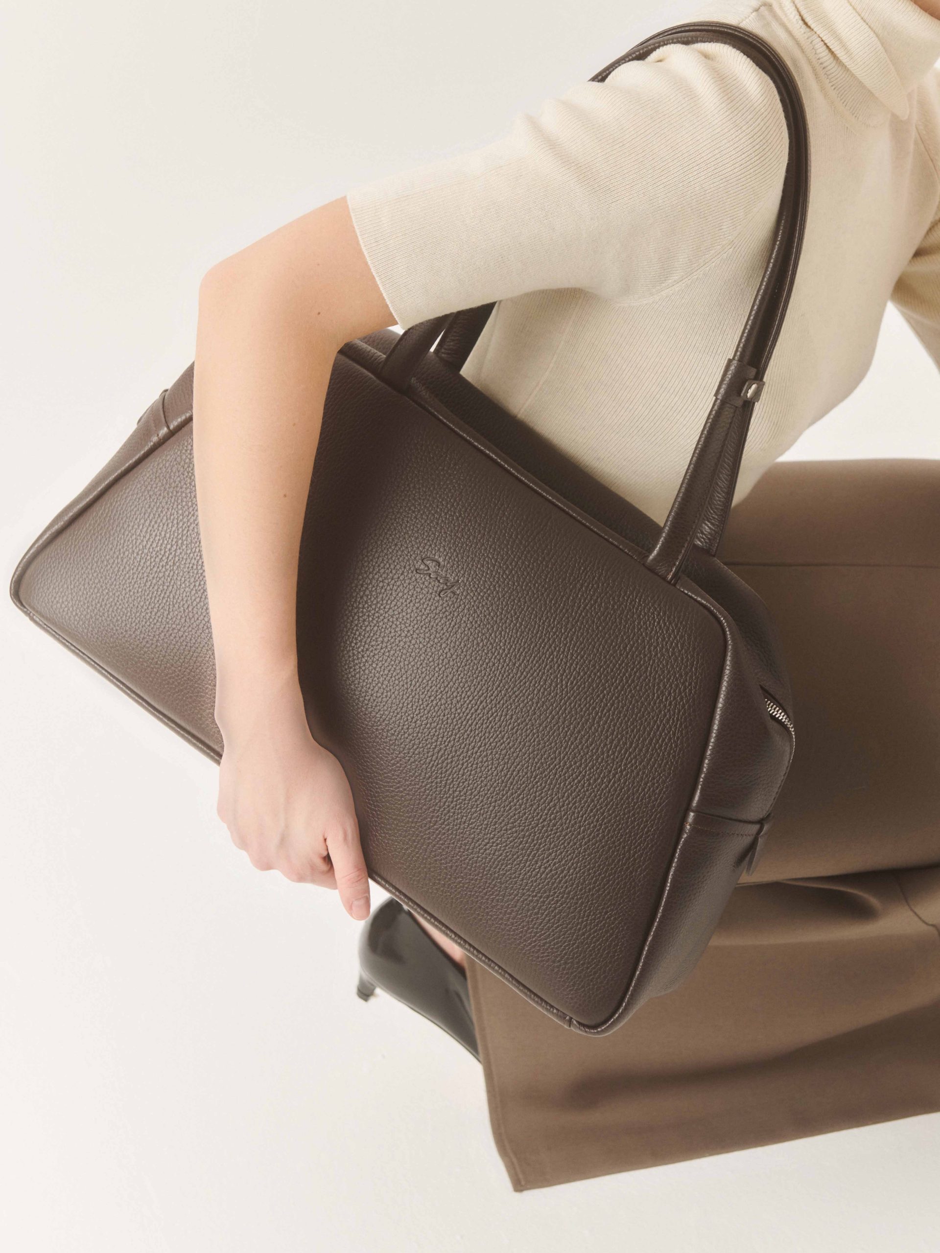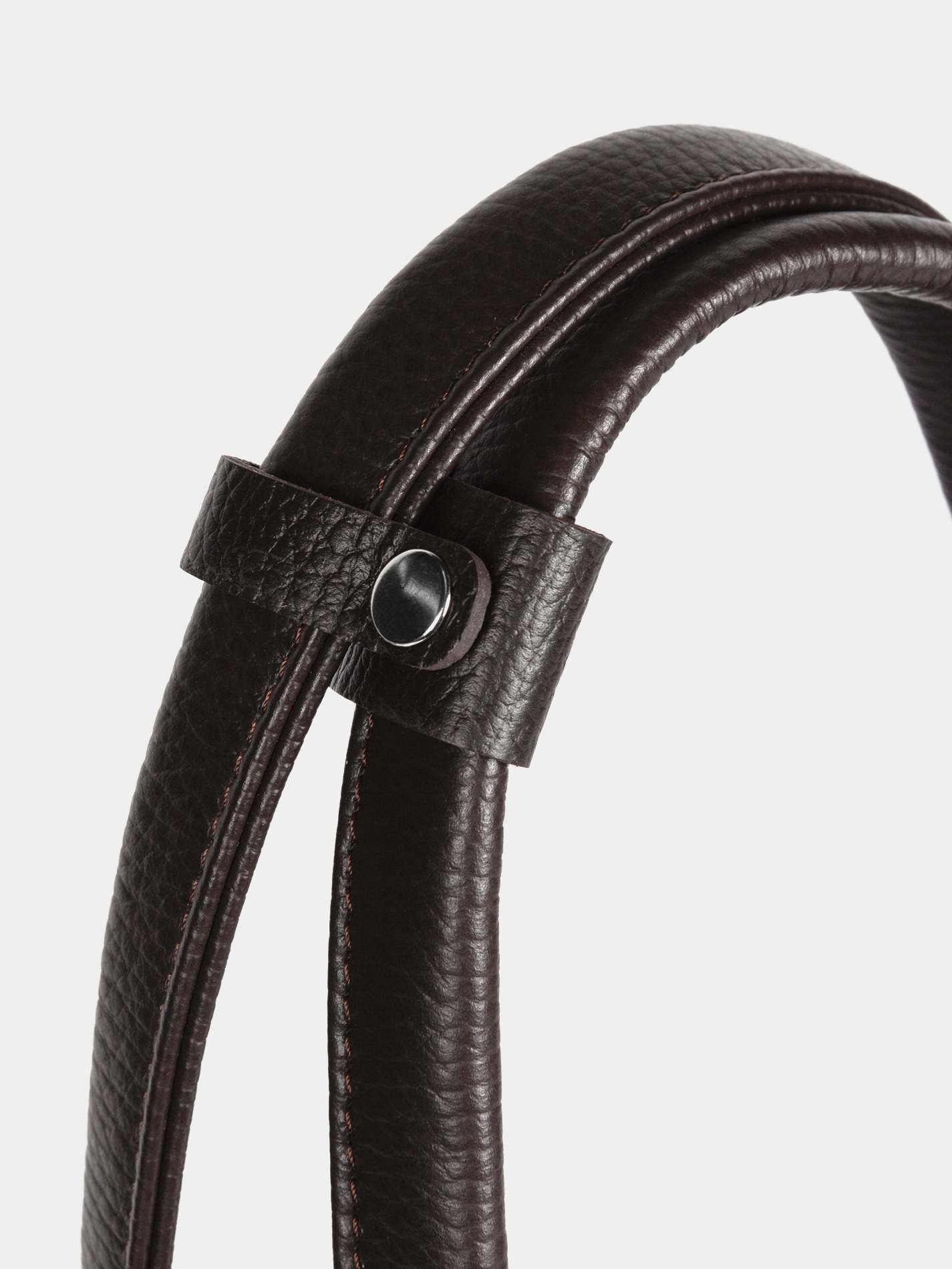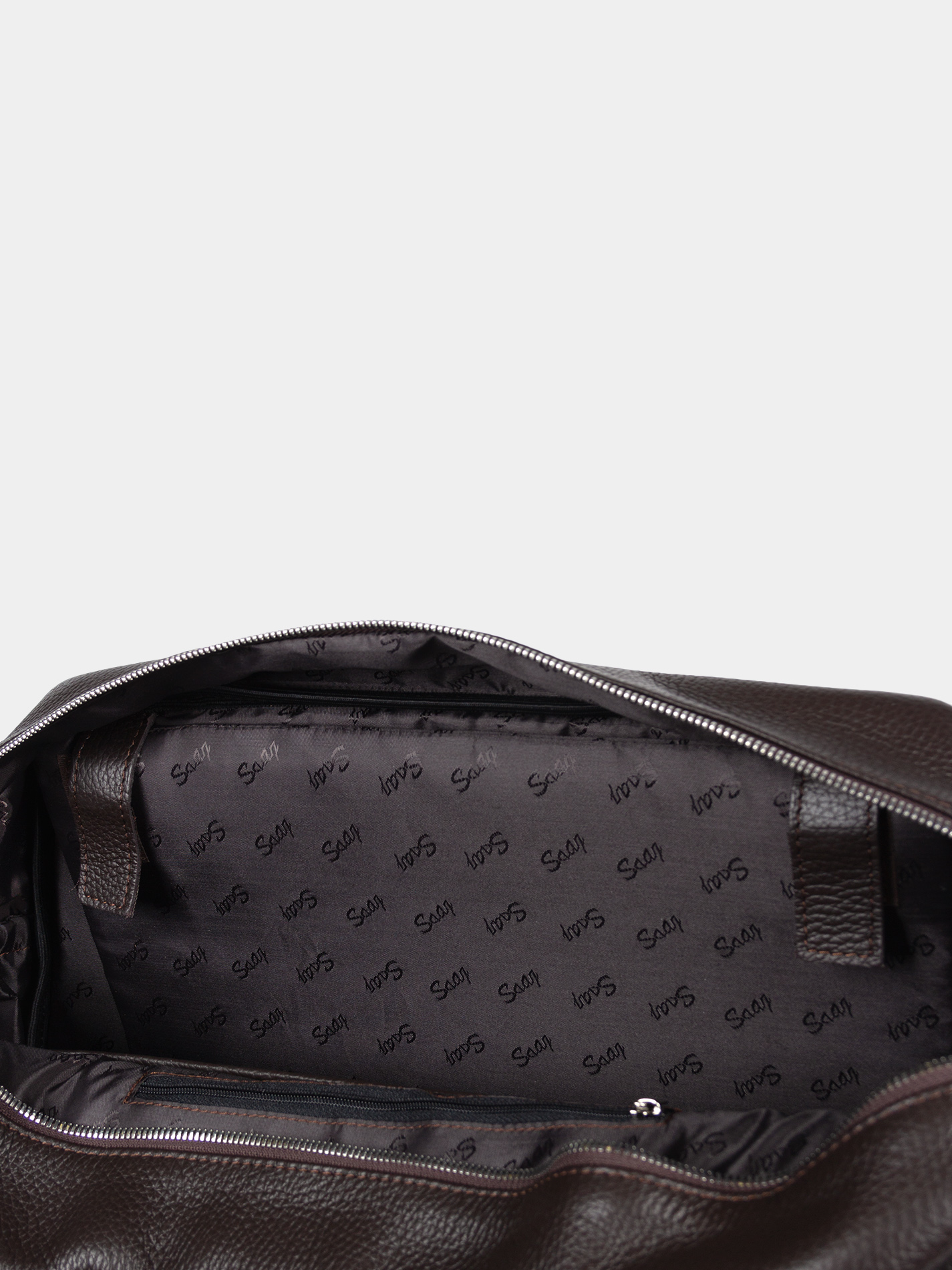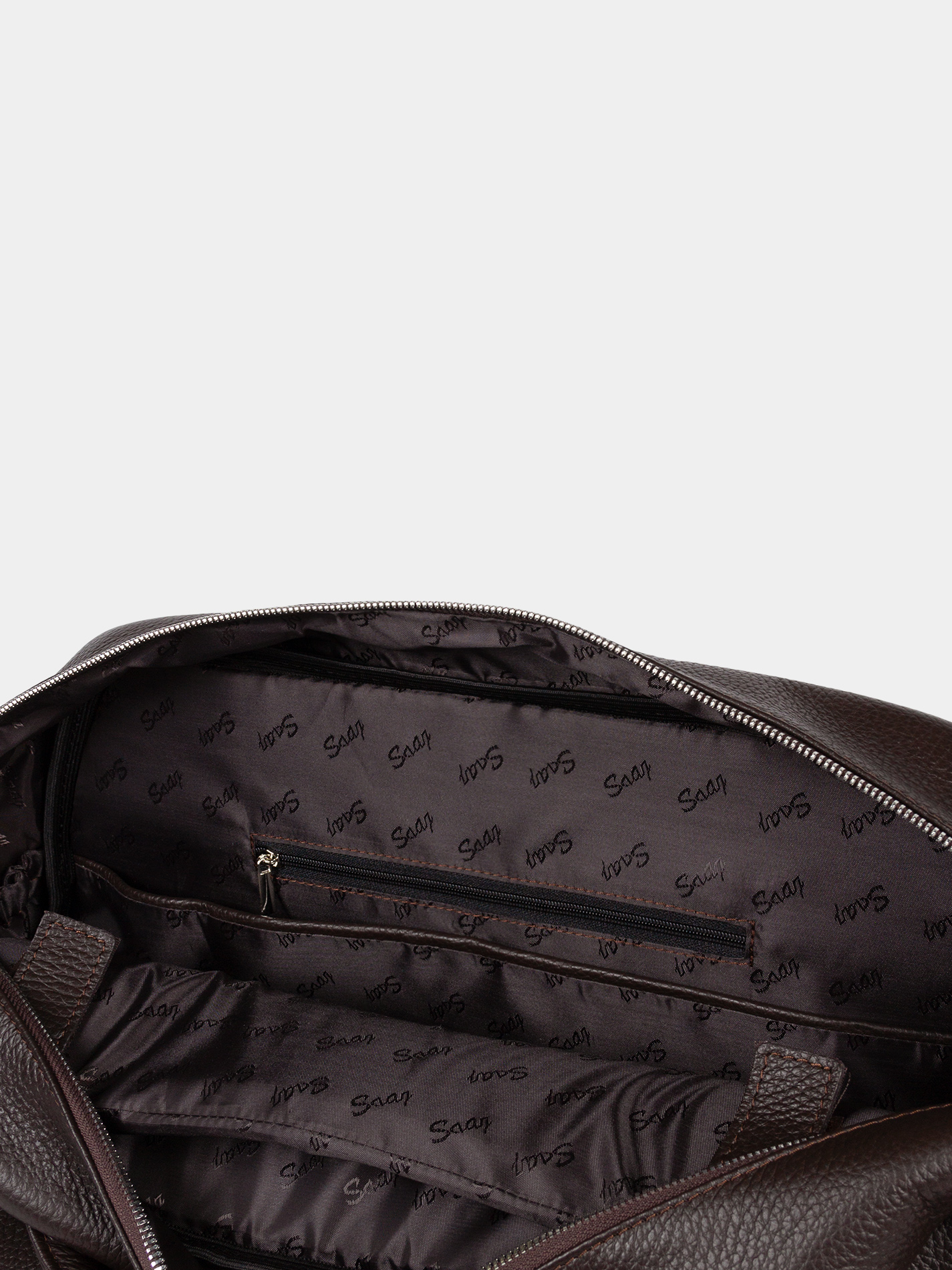 Сумка Balance из высококачественной натуральной кожи коричневого цвета трапециевидной формы. В сумке: два открытых кармана, один карман на молнии для ценных вещей, два боковых кармана на резинке, а также откидной карман на липучках для ноутбука 14 дюймов и формата А4. Откидной карман (длина — 31 см, высота — 22 см, глубина — 2,5 см) оберегает ноутбук от ударов и царапин от молнии. Удобные кожаные ручки (высота 28 см) с перемычкой обеспечивают комфорт при повcедневном использовании. Рекомендованная нагрузка до 3,5 кг. Изделие упаковано в текстильный мешок.