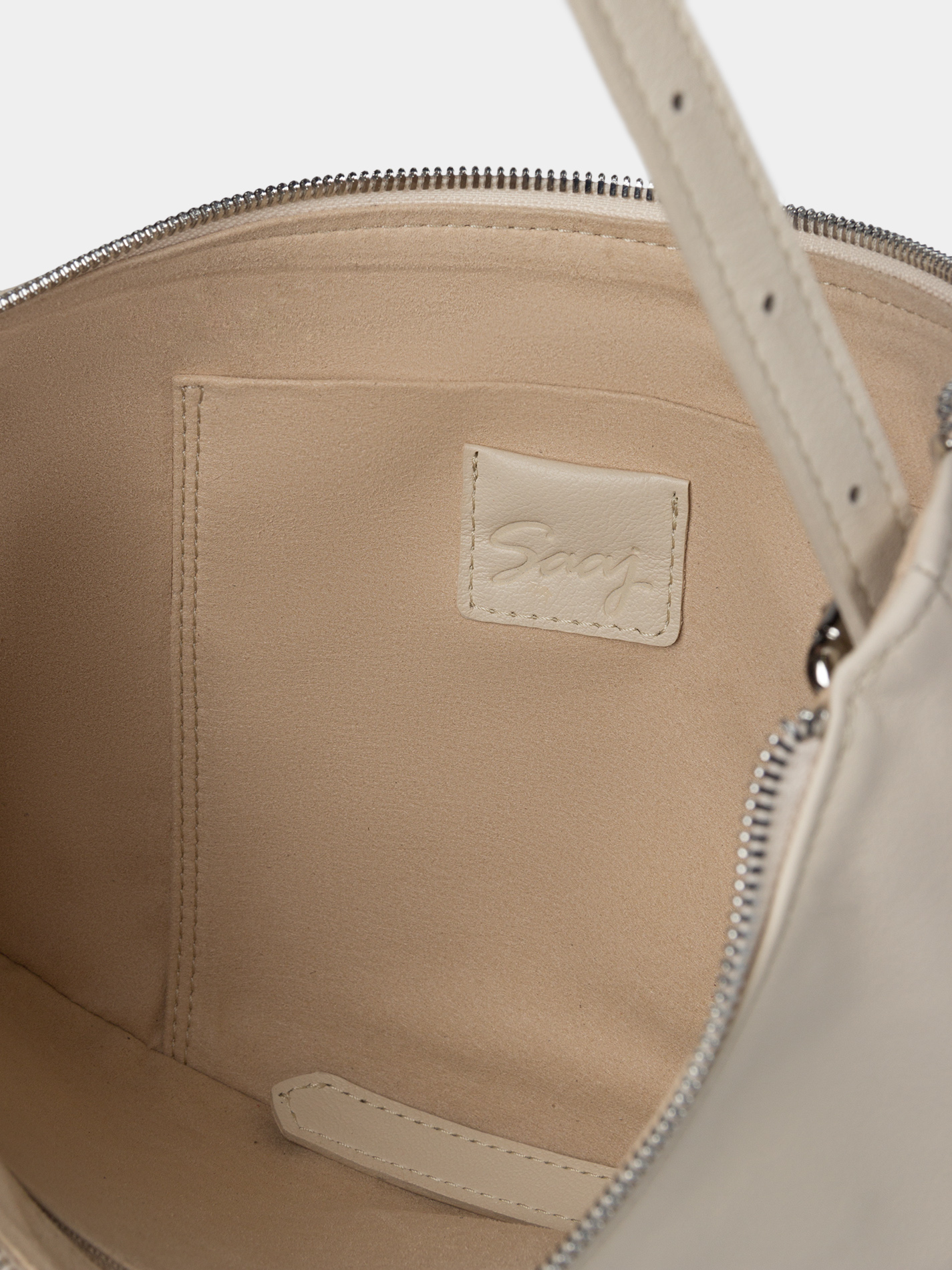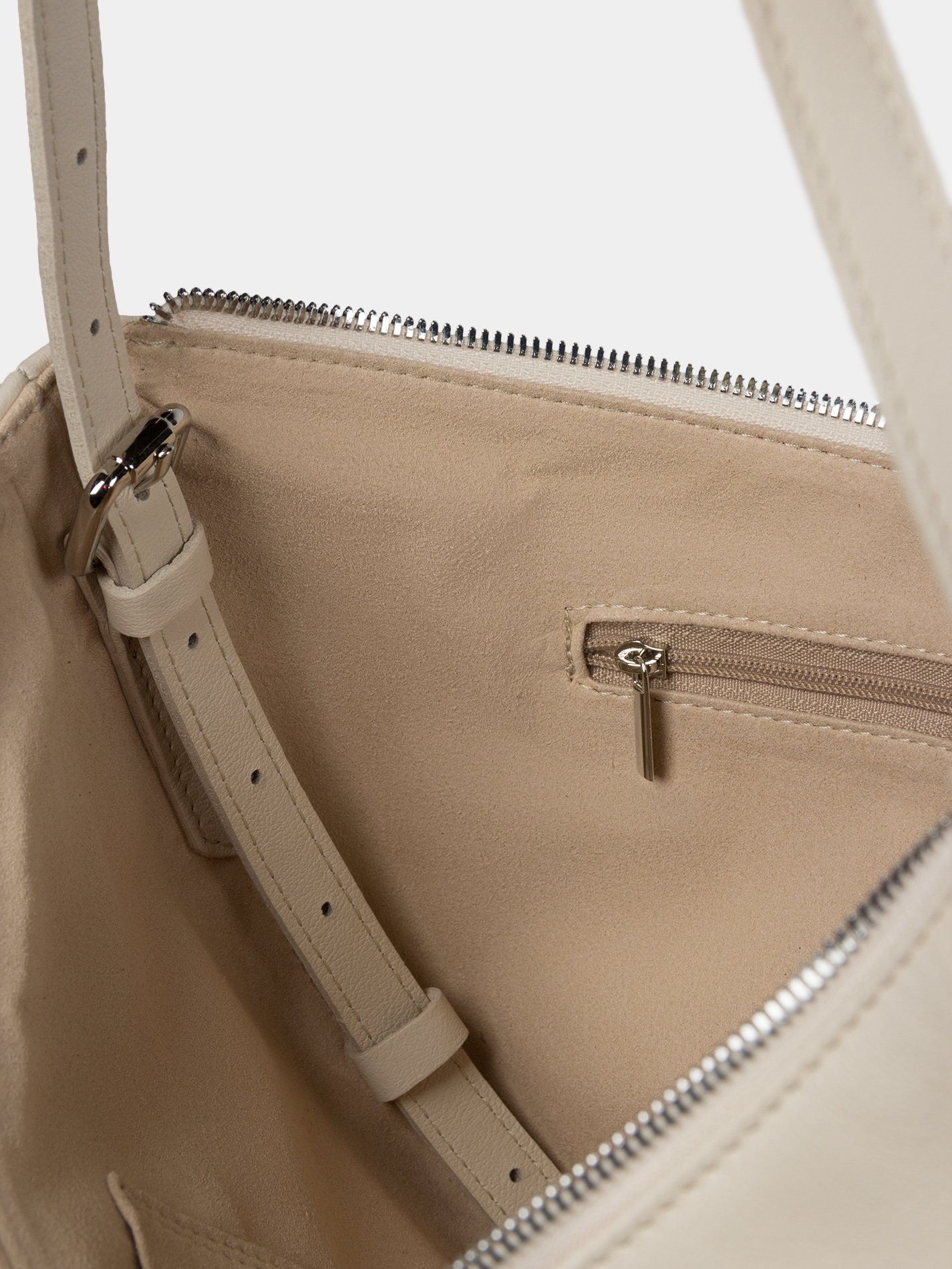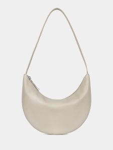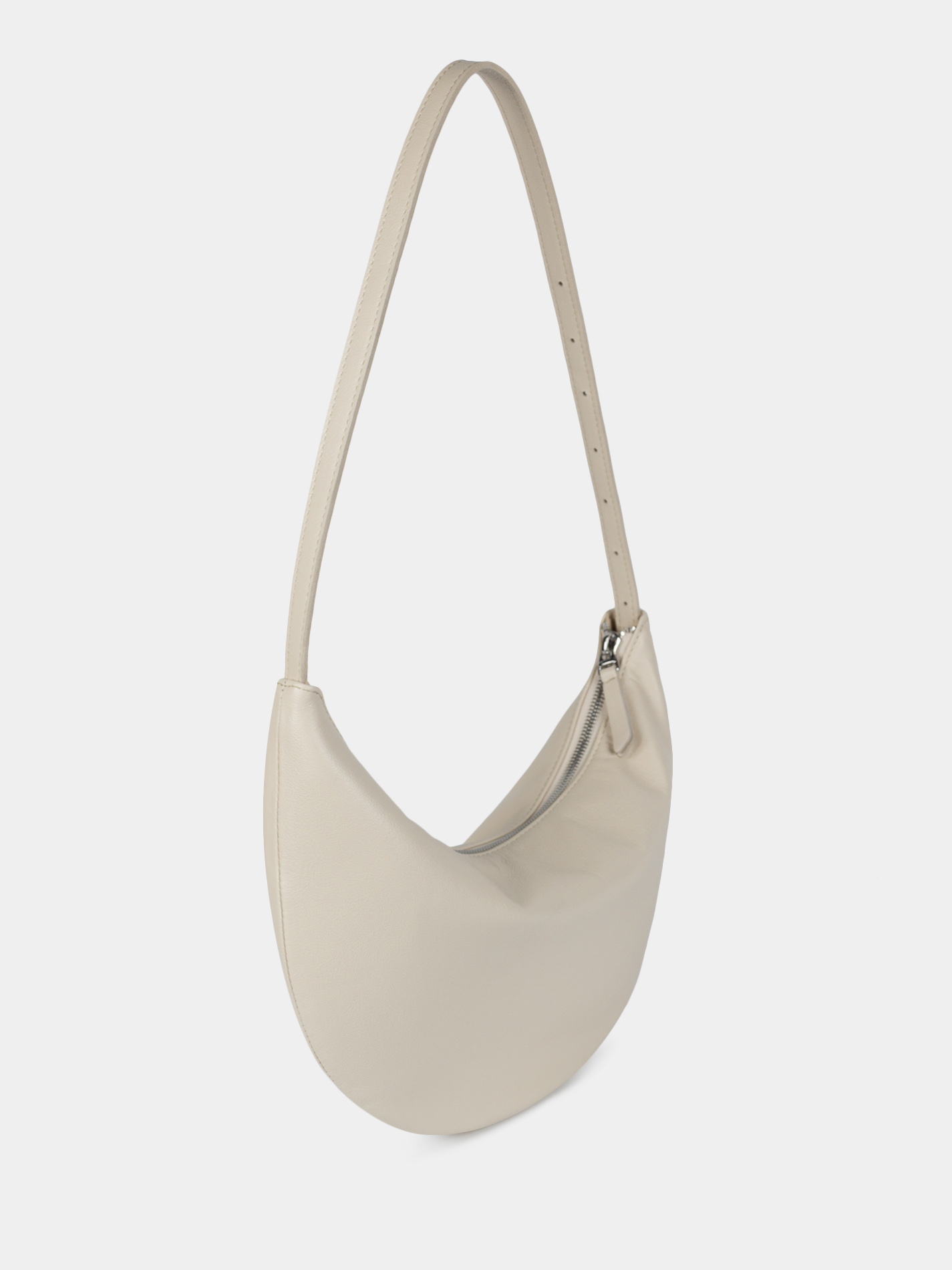 Сумка-хобо из натуральной высококачественной кожи молочного цвета с регулируемой ручкой. Внутри одно отделение, карман открытый для телефона и карман на молнии. Можно носить в руке и на плече. Рекомендованная постоянная нагрузка до 3,5 кг. Изделие упаковано в текстильный мешок.