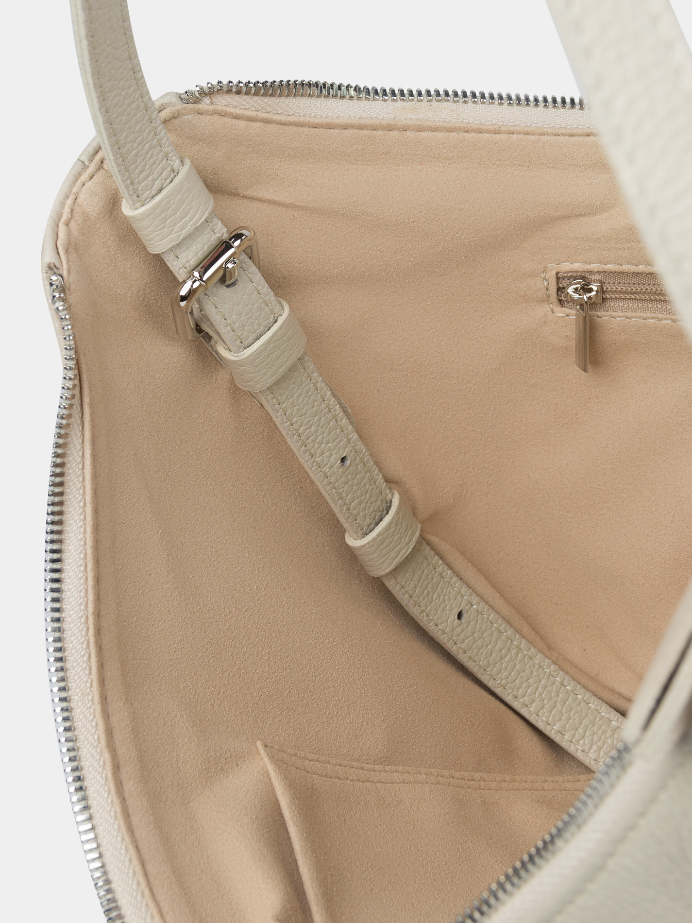 Сумка-хобо из высококачественной натуральной кожи молочного цвета с регулируемой ручкой. Внутри одно отделение, карман открытый для телефона и карман на молнии. Можно носить в руке и на плече. Рекомендованная постоянная нагрузка до 3,5 кг. Изделие упаковано в текстильный мешок.