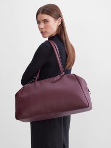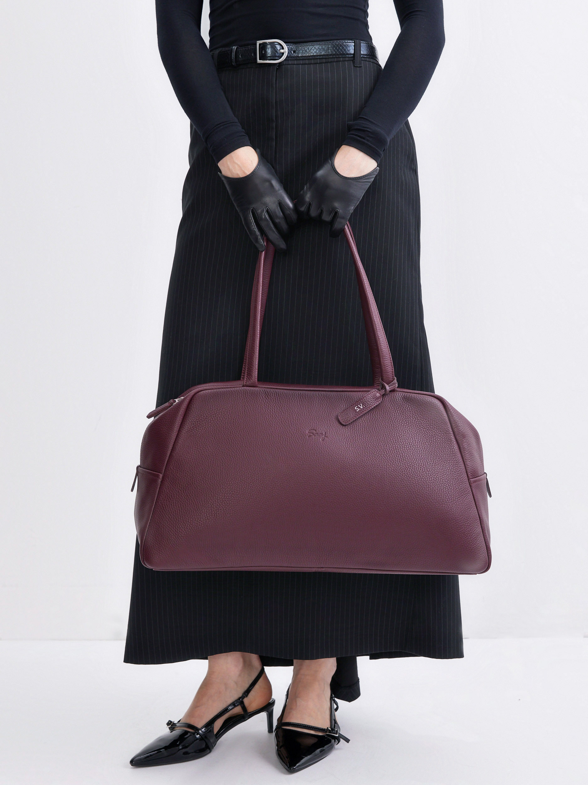 Дорожная сумка бренда SAAJ из высококачественной натуральной кожи цвета бургунди трапециевидной формы. В сумке: один открытый карман, один карман на молнии для ценных вещей, а также откидной карман на липучках для ноутбука 14 дюймов и формата А4. Откидной карман (длина — 32 см, высота — 22 см, глубина — 2,5 см) оберегает ноутбук от ударов и царапин от молнии. Имеется дополнительная молния для быстрого доступа к карману для ноутбука. Удобные кожаные ручки (высота 28 см) с перемычкой обеспечивают комфорт при повcедневном использовании. Рекомендованная нагрузка до 3,5 кг. Изделие упаковано в текстильный мешок.