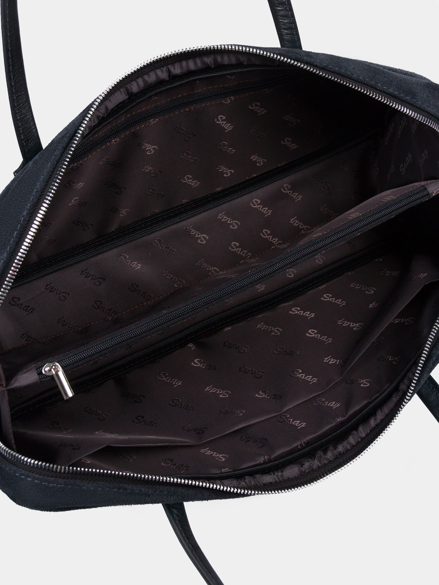 Сумка-такса женская бренда SAAJ из натуральной замши синего цвета в комбинации с натуральной кожей черного цвета. Сумка имеет форму трапеции. Внутри: карман-перегородка на молнии, 2 открытых кармана для мелочи, 1 карман на молнии. 2 ручки и донышко выполнены из натуральной кожи. Высота ручек 30 см. Изделие упаковано в текстильный мешок.