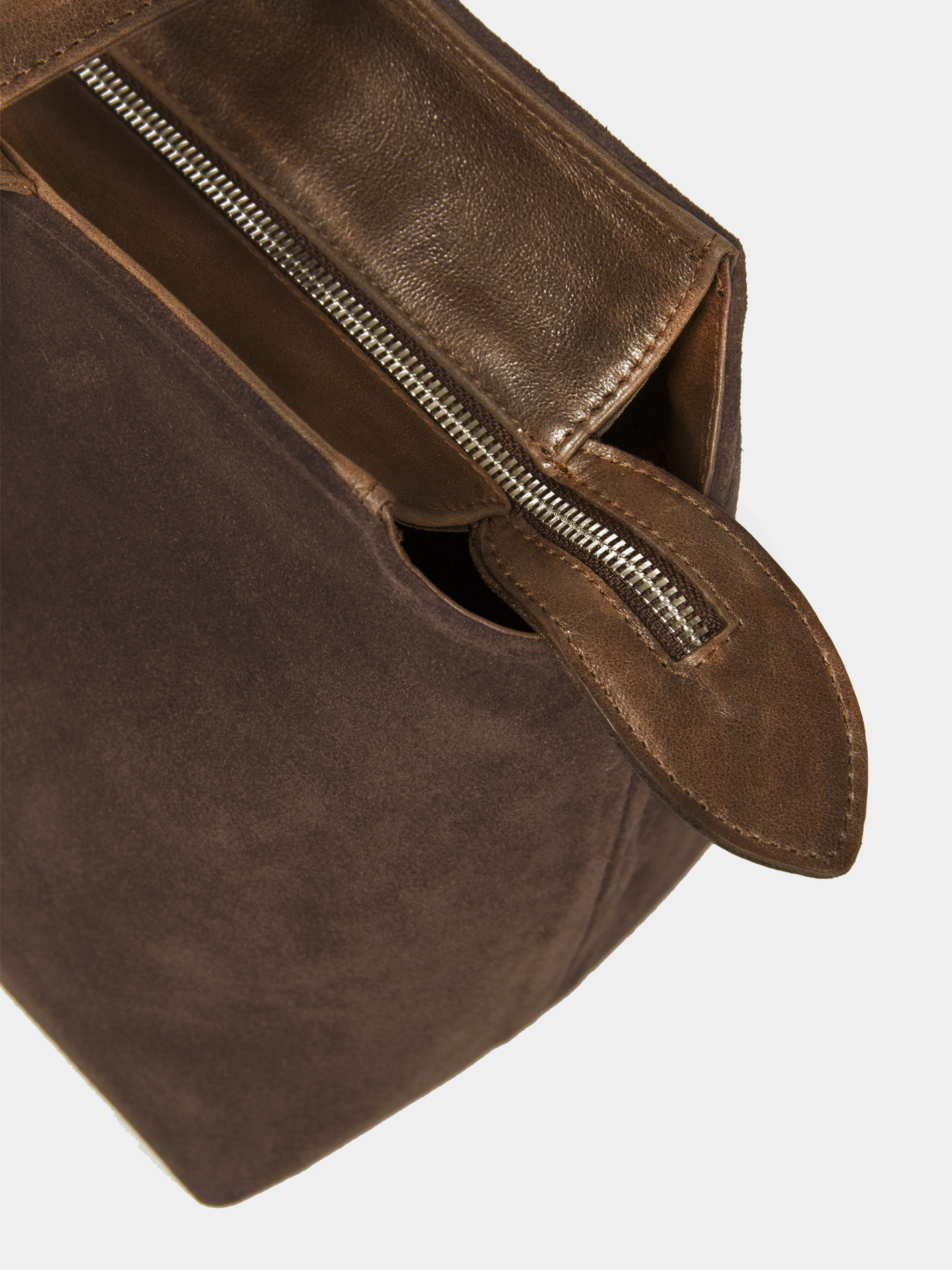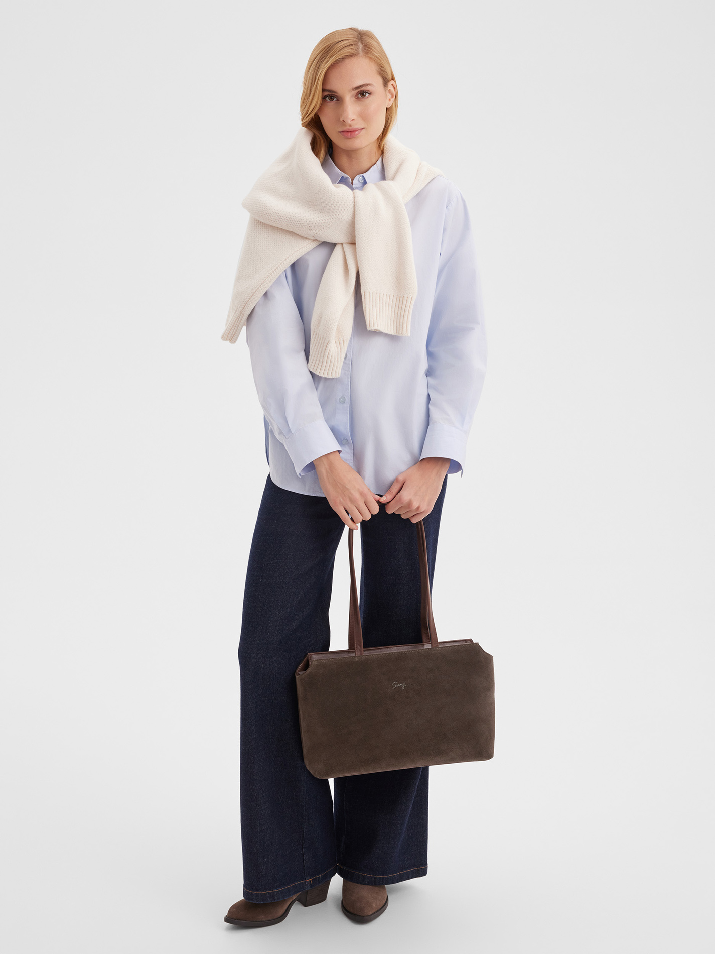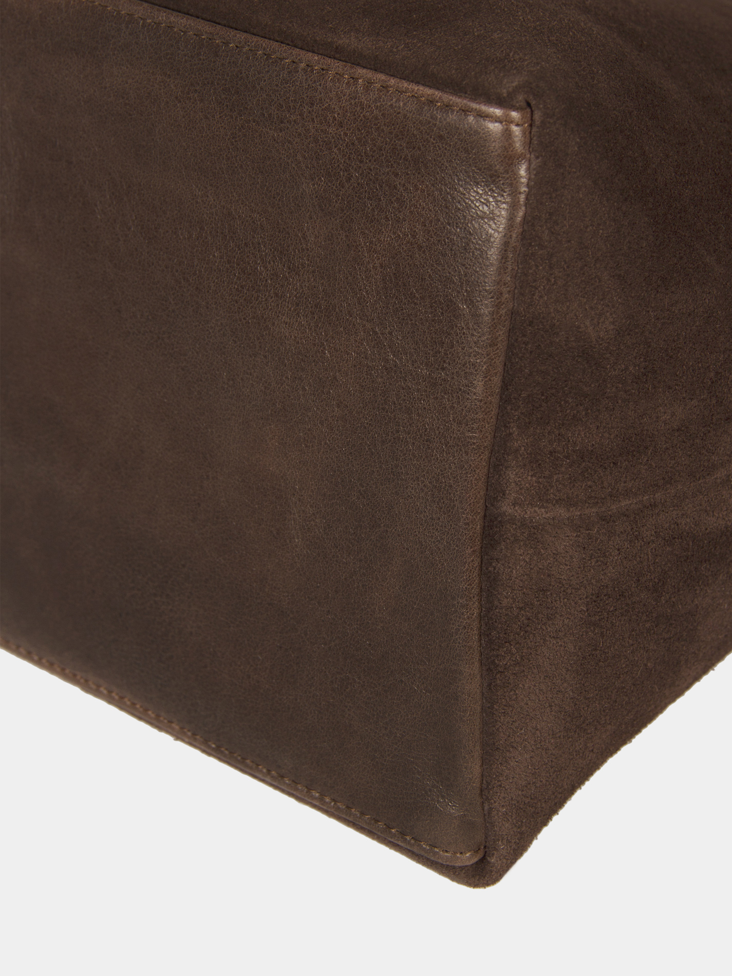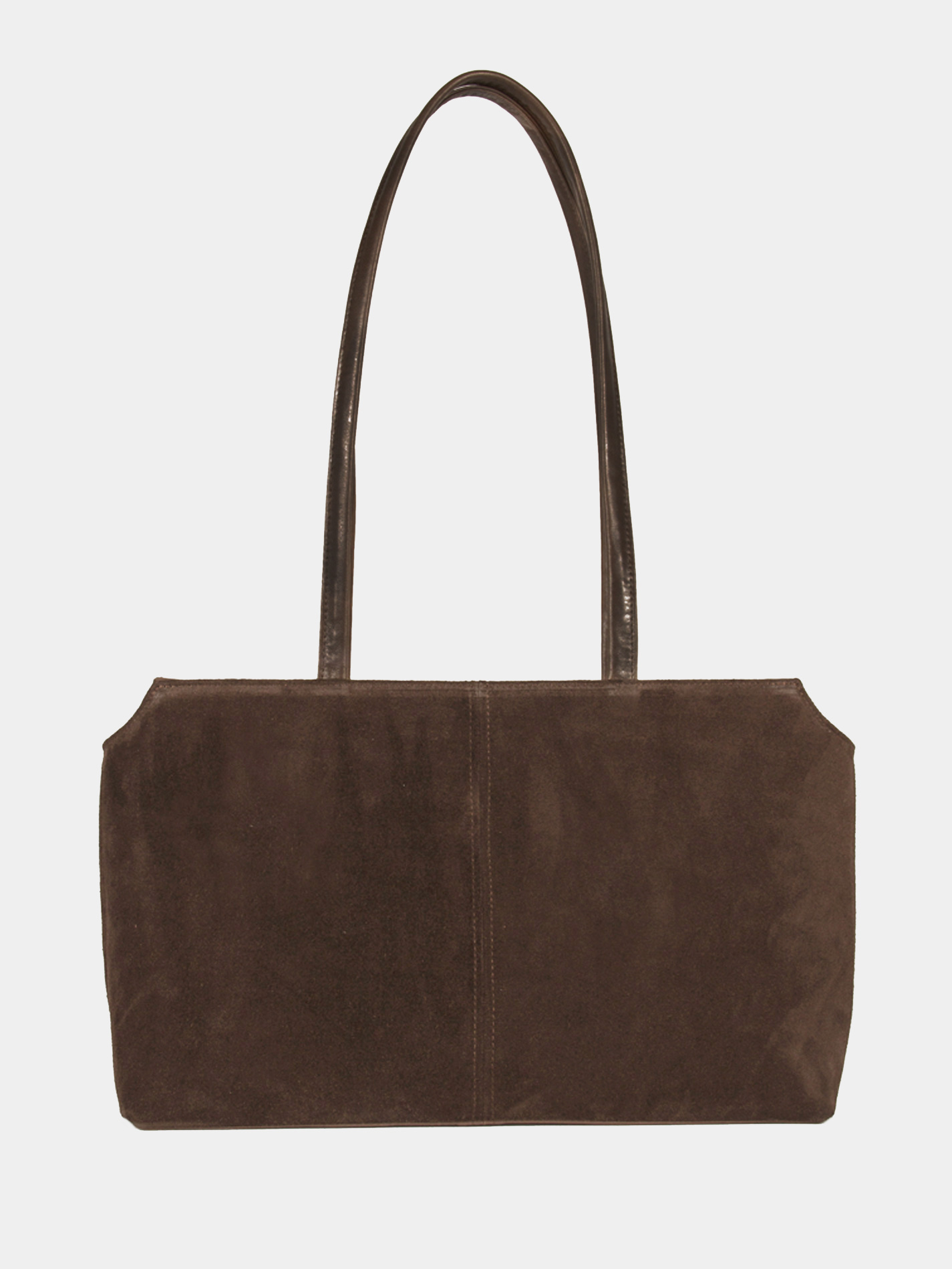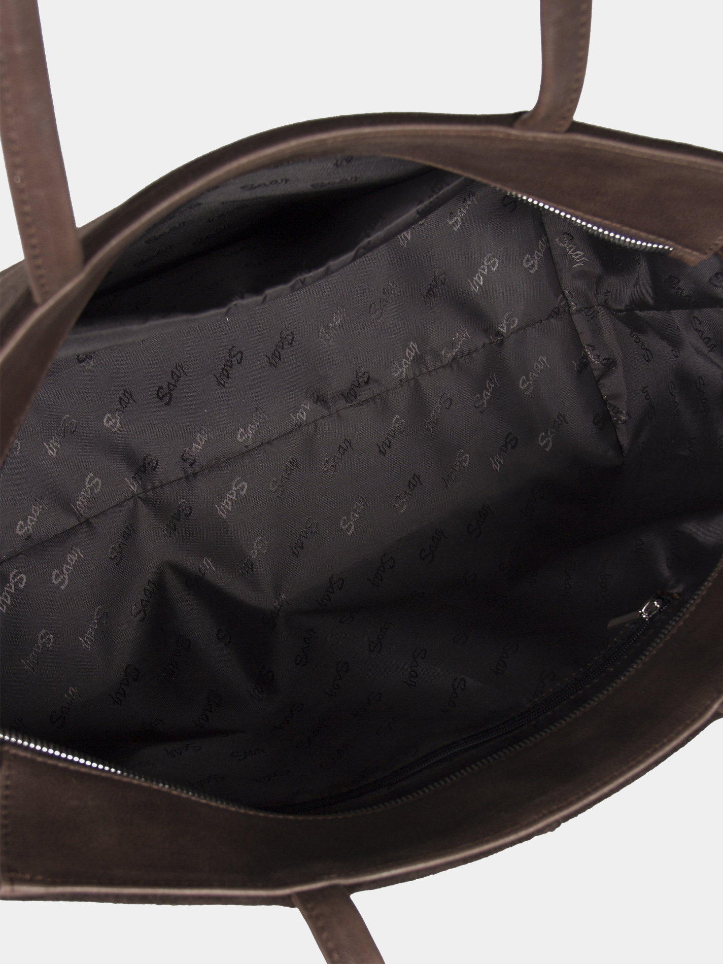 Сумка-тоут женская бренда SAAJ из натуральной замши в комбинации с натуральной кожей. Сумка закрывается на молнию. Внутри одно отделение, 1 карман на молнии и 1 открытый карман. В сумку помещается ноутбук 13 дюймов и формат А4. 2 ручки и донышко выполнены из натуральной кожи. Высота ручек 32 см. Изделие упаковано в текстильный мешок.