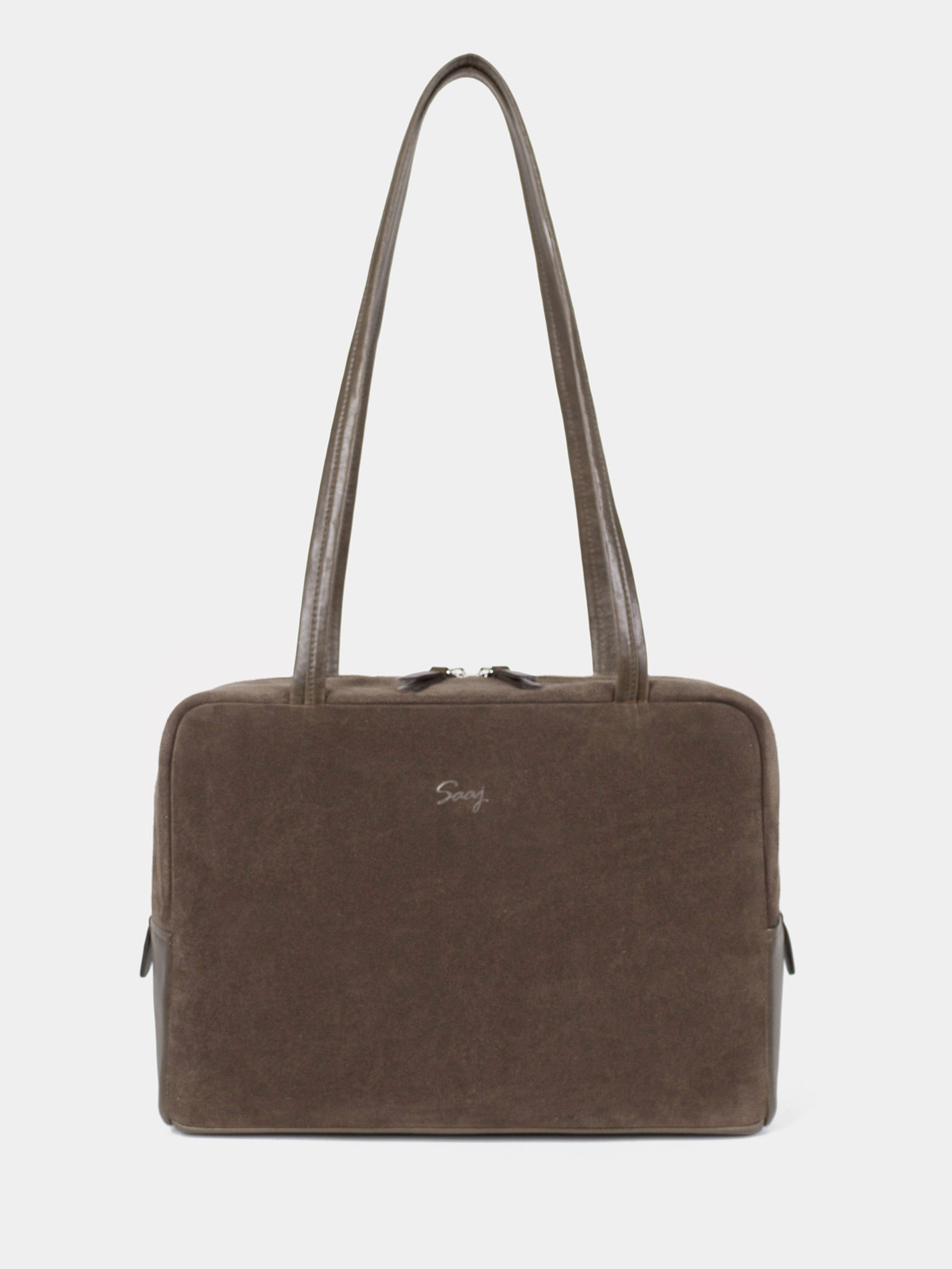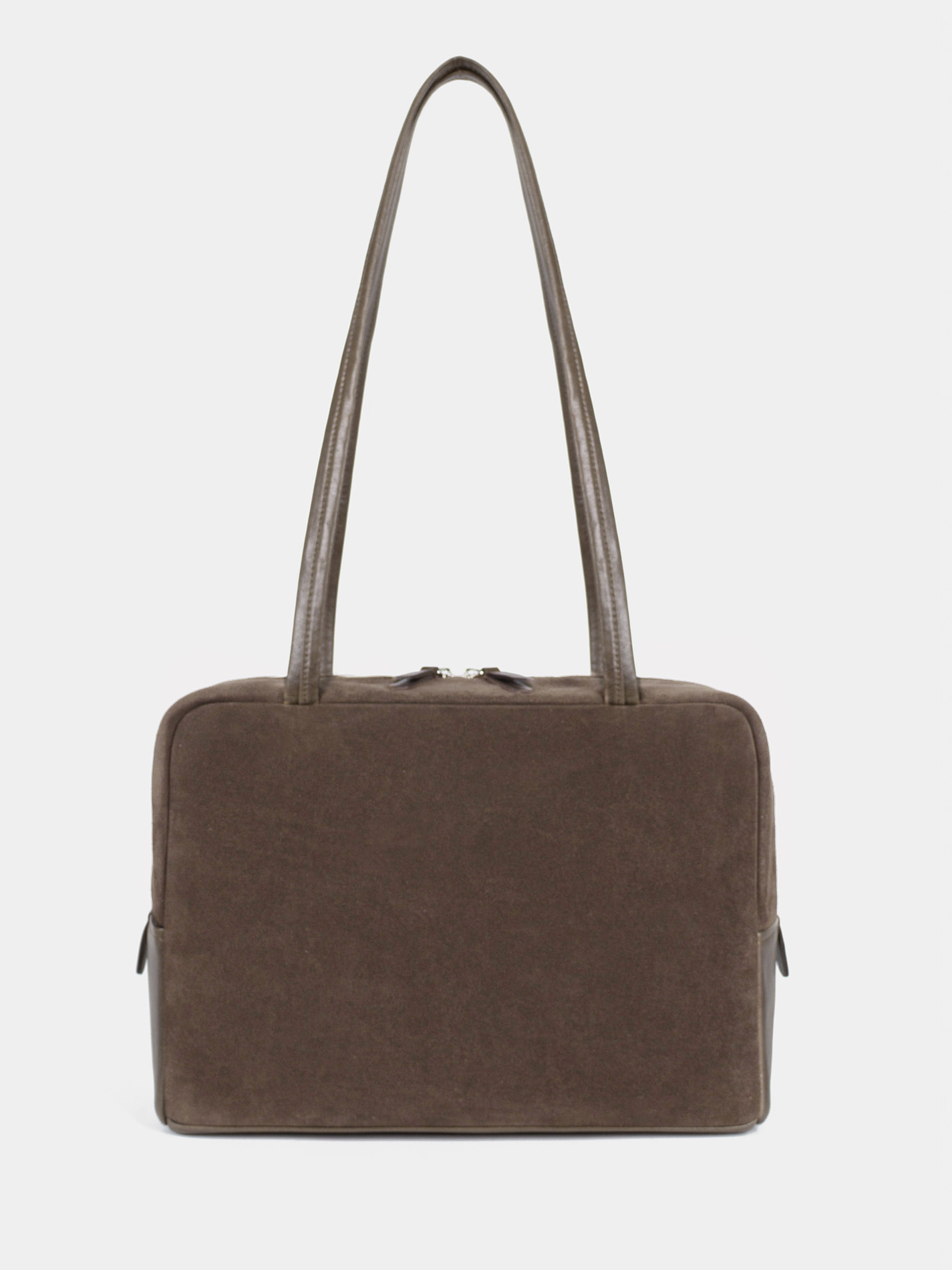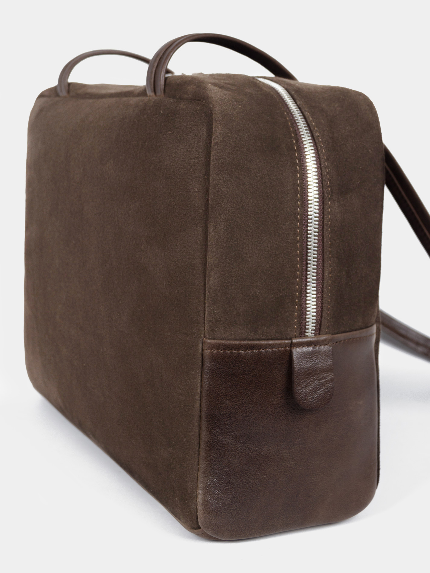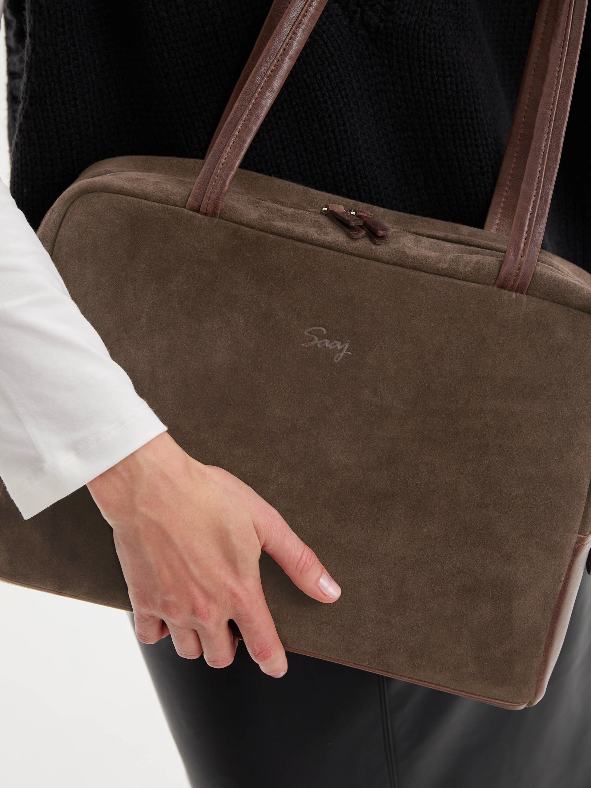 Сумка Айтишница 14 из высококачественной натуральной замши (темно-коричневый цвет) с кожаными донышком и ручками, с металлической молнией. В сумке карман на молнии для ценных вещей, а также откидной карман на липучках для ноутбука 14 дюймов и формата А4. Откидной карман (длина — 32 см, высота — 23 см, глубина — 2,5 см) оберегает ноутбук от ударов и царапин от молнии. У сумки предусмотрены длинные функциональные ручки (37 см) для носки в руках и на плече. Интересный стильный вариант на каждый день. Рекомендованная нагрузка до 3,5 кг. Изделие упаковано в текстильный мешок.