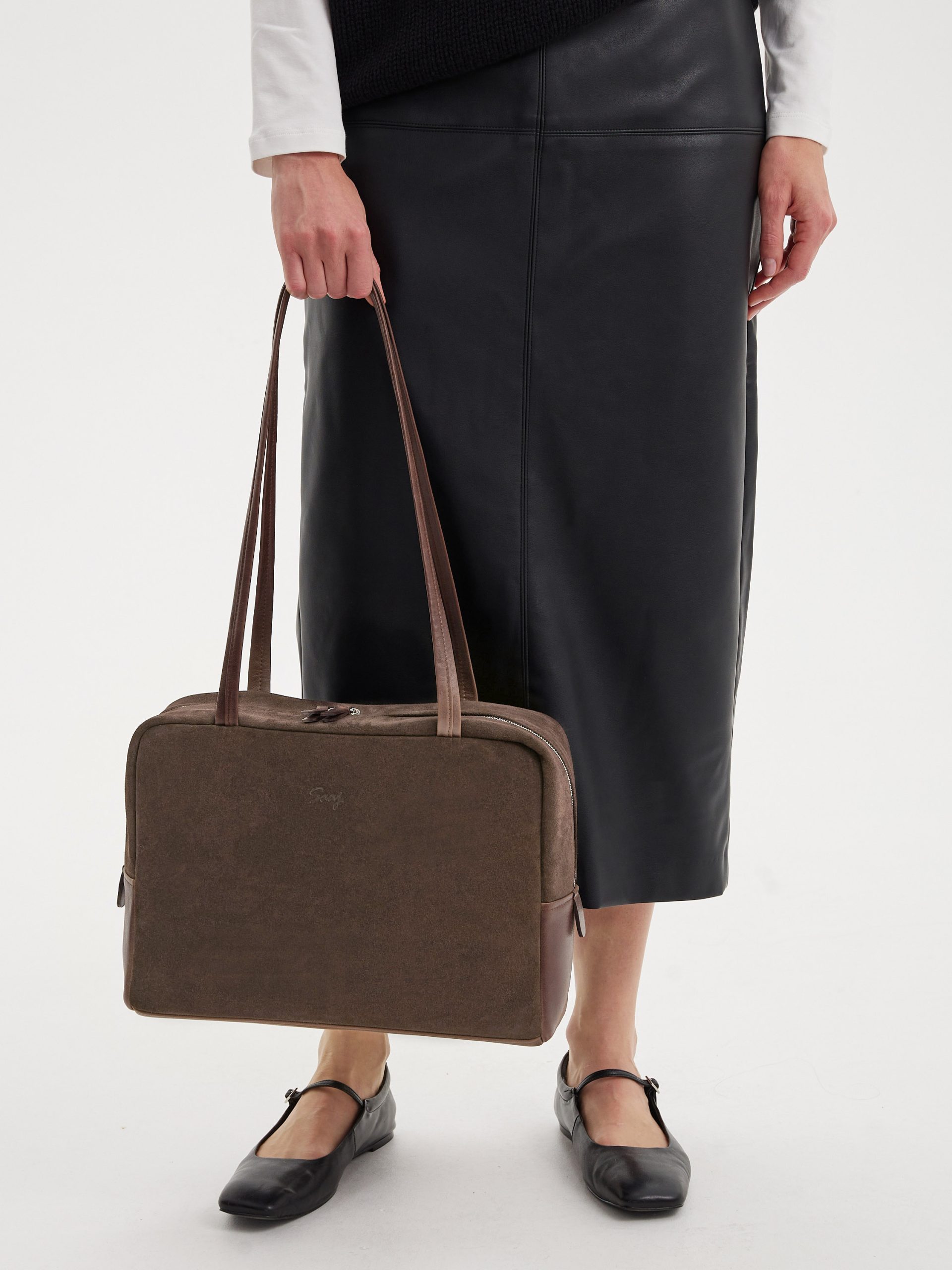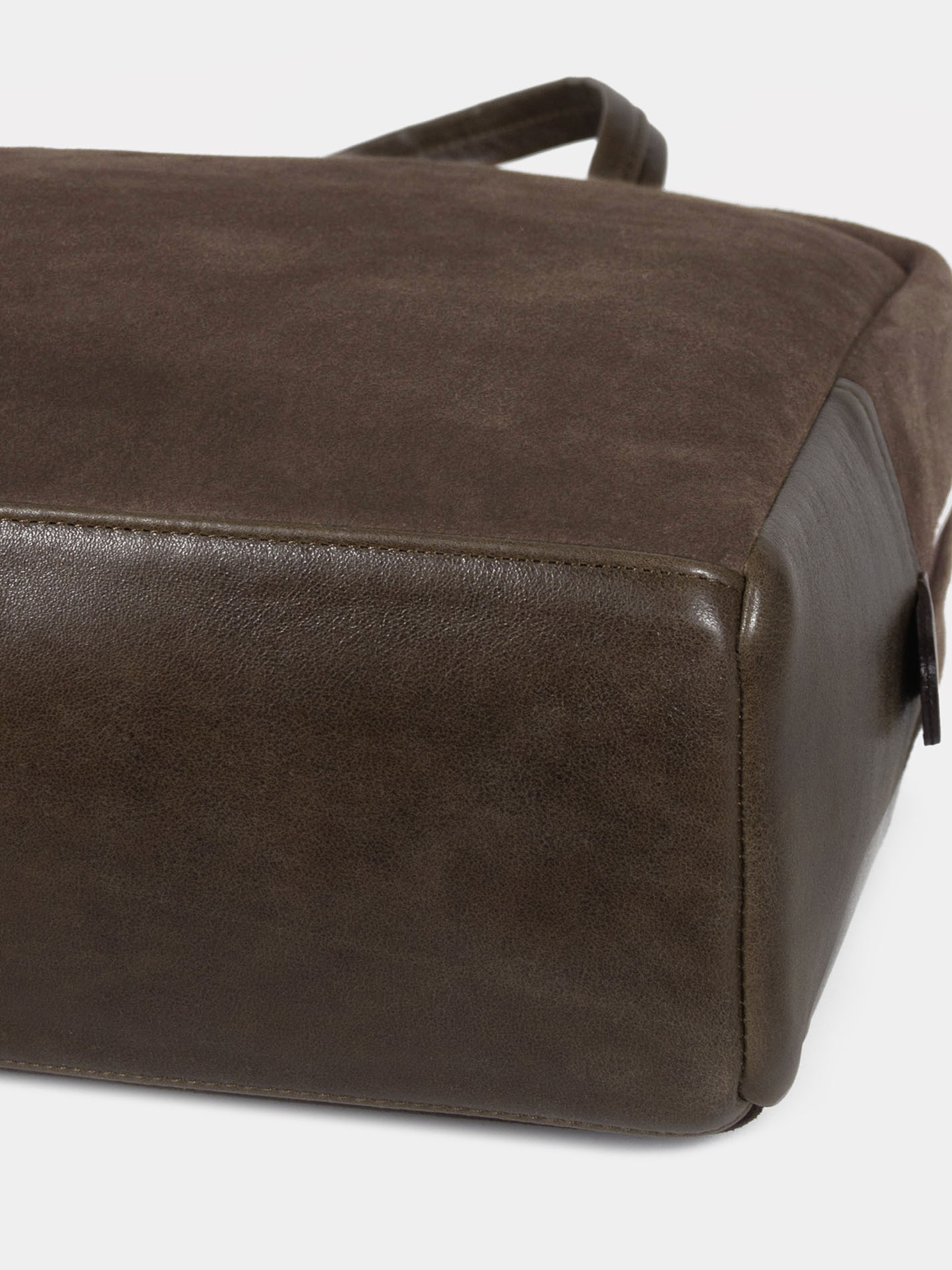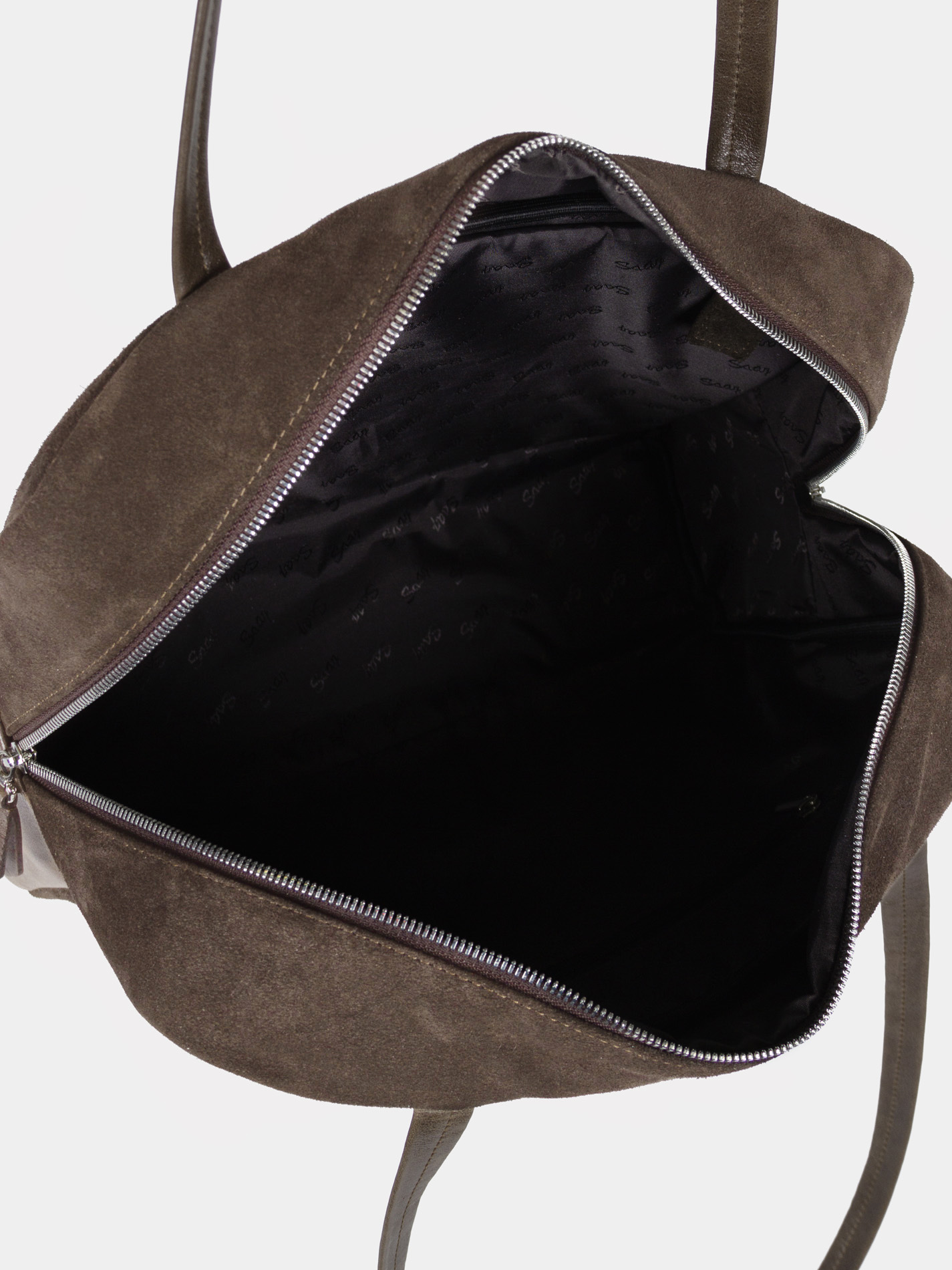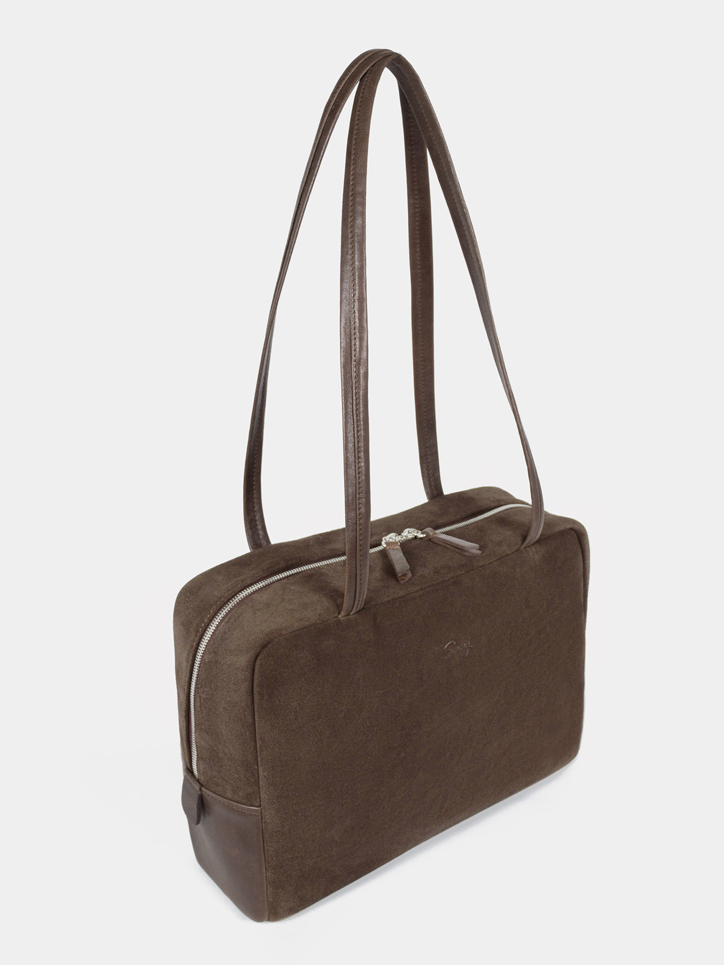 Сумка Айтишница 14 из высококачественной натуральной замши (темно-коричневый цвет) с кожаными донышком и ручками, с металлической молнией. В сумке карман на молнии для ценных вещей, а также откидной карман на липучках для ноутбука 14 дюймов и формата А4. Откидной карман (длина — 32 см, высота — 23 см, глубина — 2,5 см) оберегает ноутбук от ударов и царапин от молнии. У сумки предусмотрены длинные функциональные ручки (37 см) для носки в руках и на плече. Интересный стильный вариант на каждый день. Рекомендованная нагрузка до 3,5 кг. Изделие упаковано в текстильный мешок.