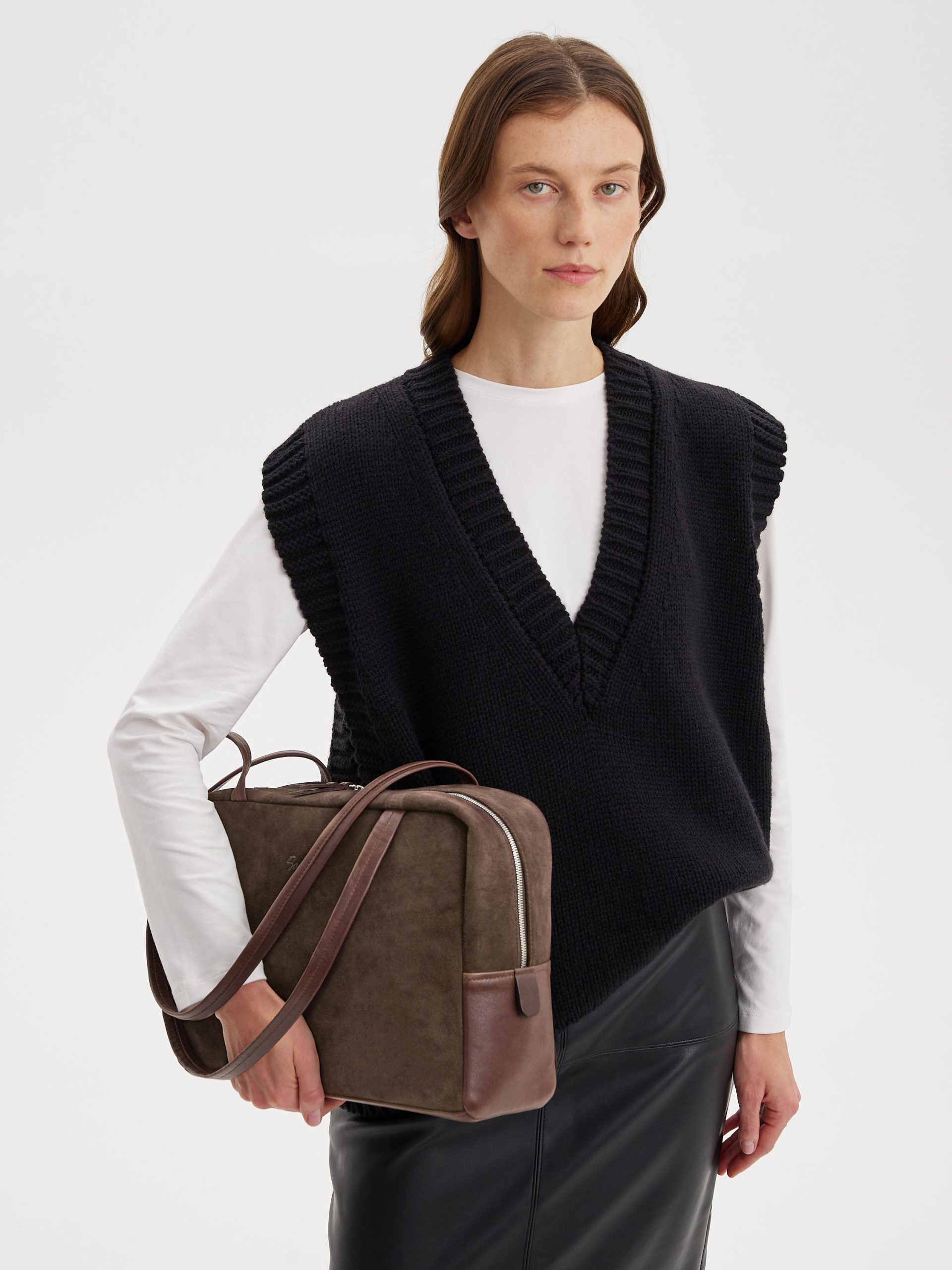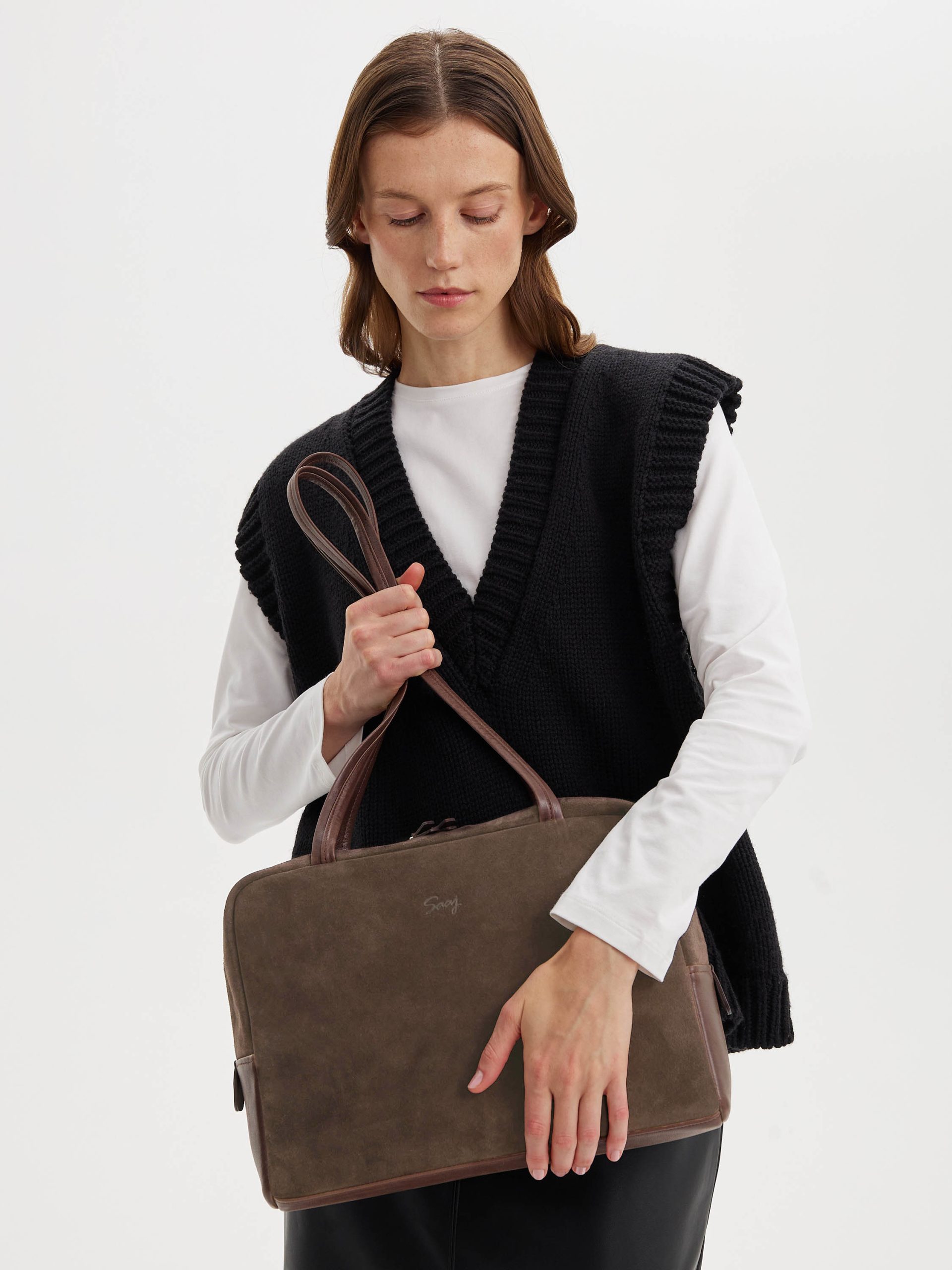 Цвета:Сумка Айтишница 14 из высококачественной натуральной замши (темно-коричневый цвет) с кожаными донышком и ручками, с металлической молнией. В сумке карман на молнии для ценных вещей, а также откидной карман на липучках для ноутбука 14 дюймов и формата А4. Откидной карман (длина — 32 см, высота — 23 см, глубина — 2,5 см) оберегает ноутбук от ударов и царапин от молнии. У сумки предусмотрены длинные функциональные ручки (37 см) для носки в руках и на плече. Интересный стильный вариант на каждый день. Рекомендованная нагрузка до 3,5 кг. Изделие упаковано в текстильный мешок.