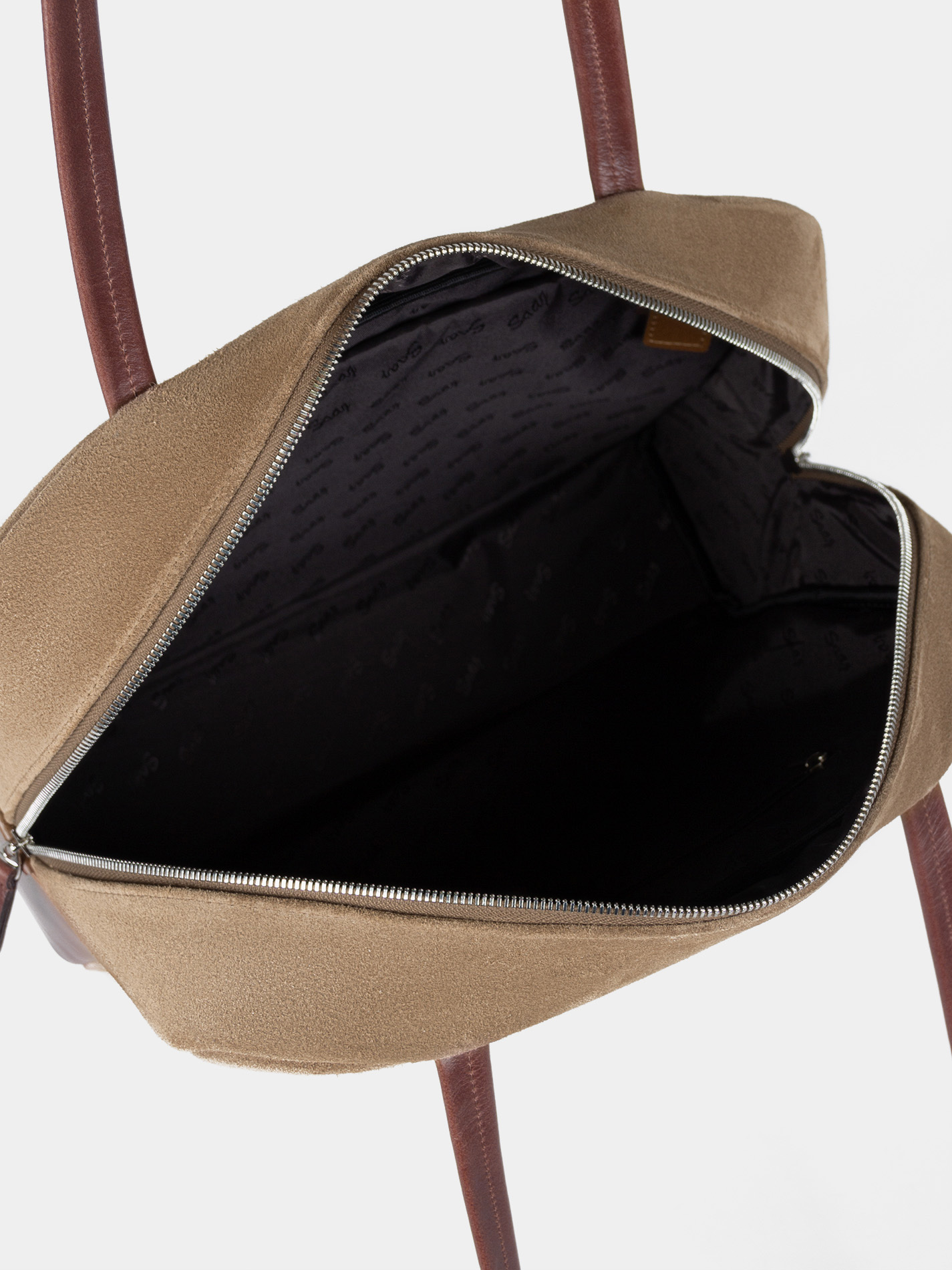 Сумка Айтишница 14 из высококачественной натуральной замши (светло-коричневый цвет) с кожаным донышком и ручками, с металлической молнией. В сумке карман на молнии для ценных вещей, а также откидной карман на липучках для ноутбука 14 дюймов и формата А4. Откидной карман (длина — 32 см, высота — 23 см, глубина — 2,5 см) оберегает ноутбук от ударов и царапин от молнии. У сумки предусмотрены длинные функциональные ручки (37 см) для носки в руках и на плече. Интересный стильный вариант на каждый день. Рекомендованная нагрузка до 3,5 кг. Изделие упаковано в текстильный мешок.