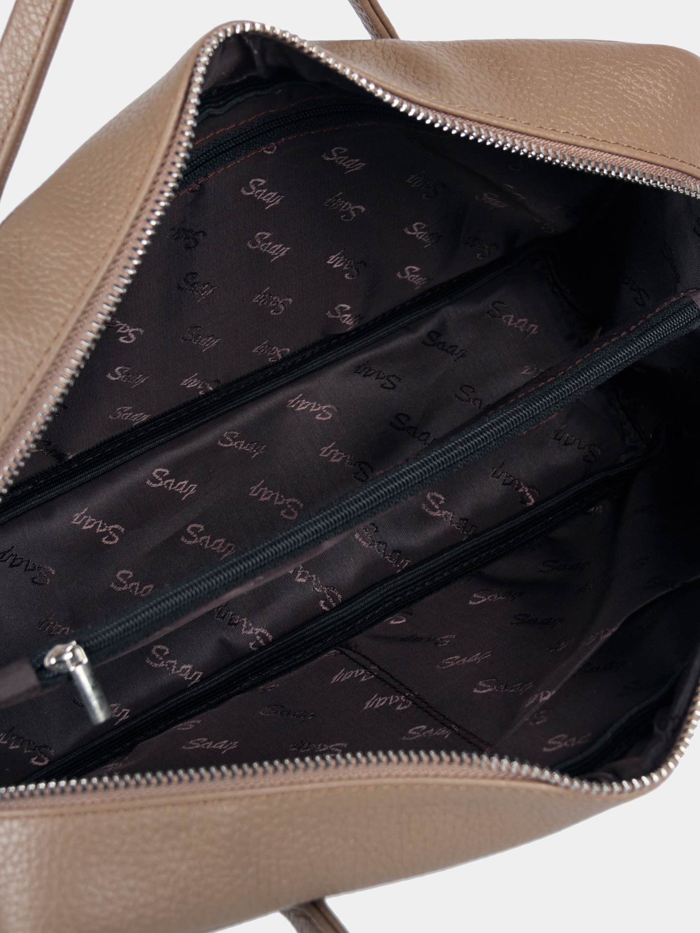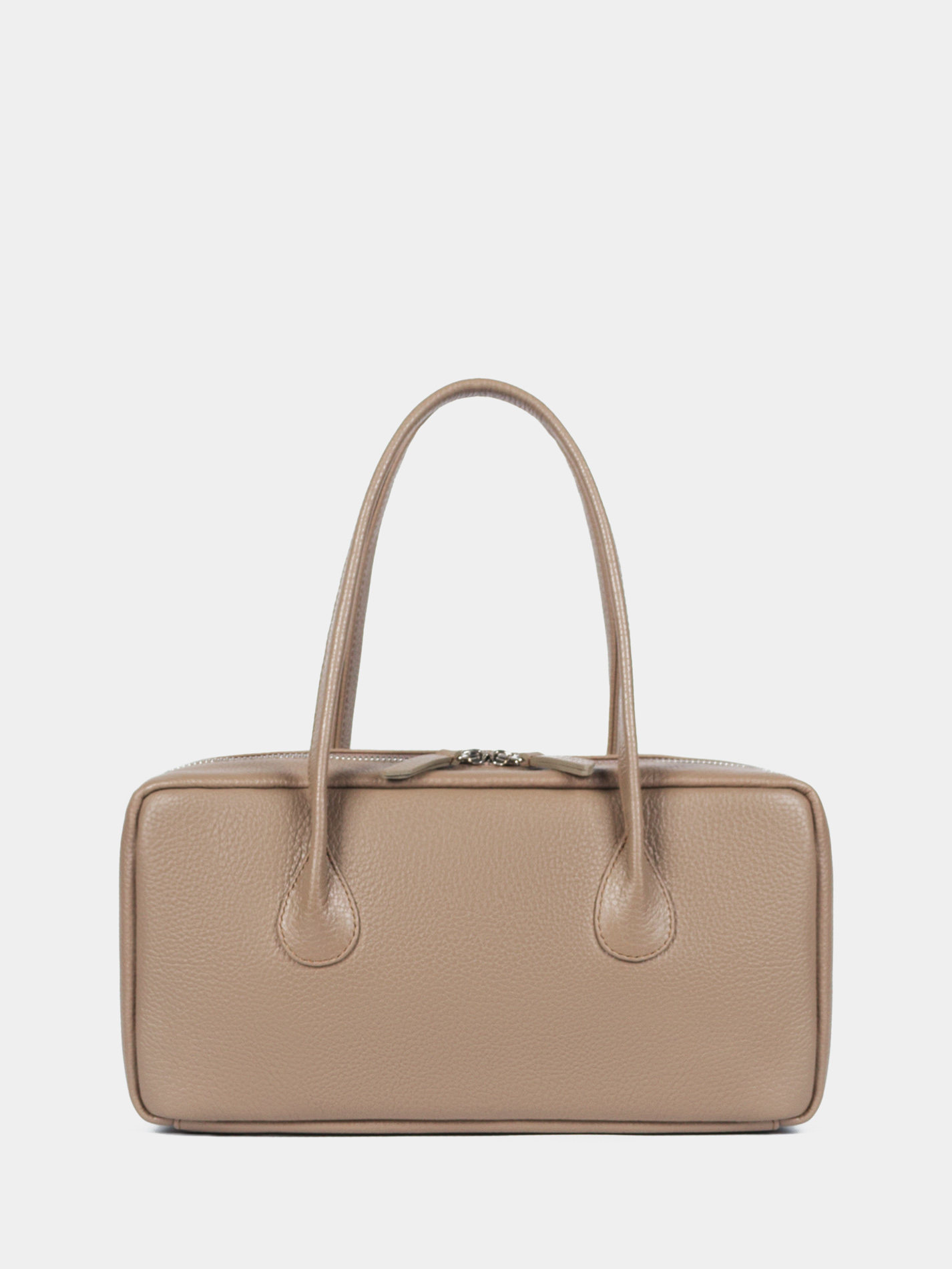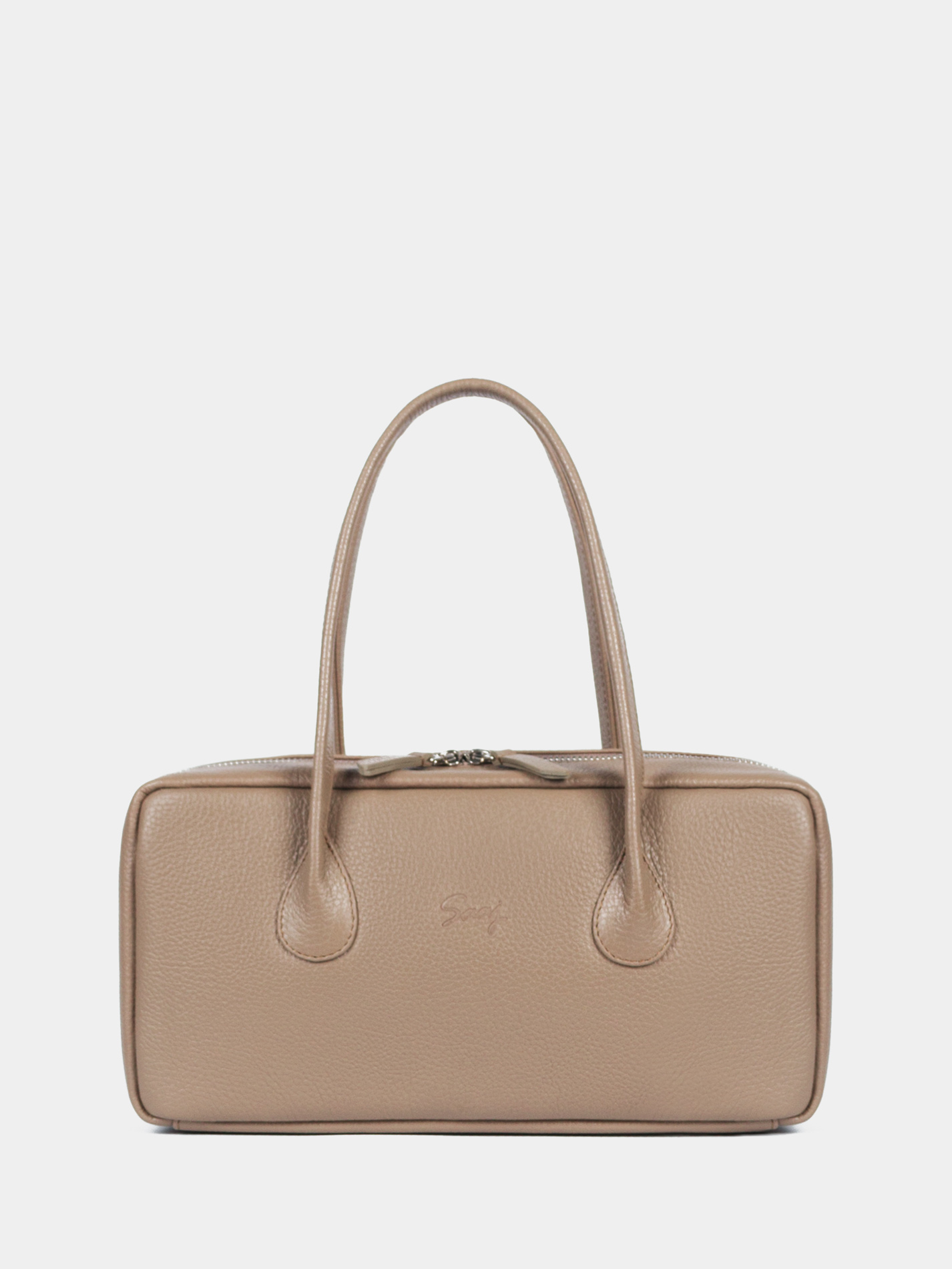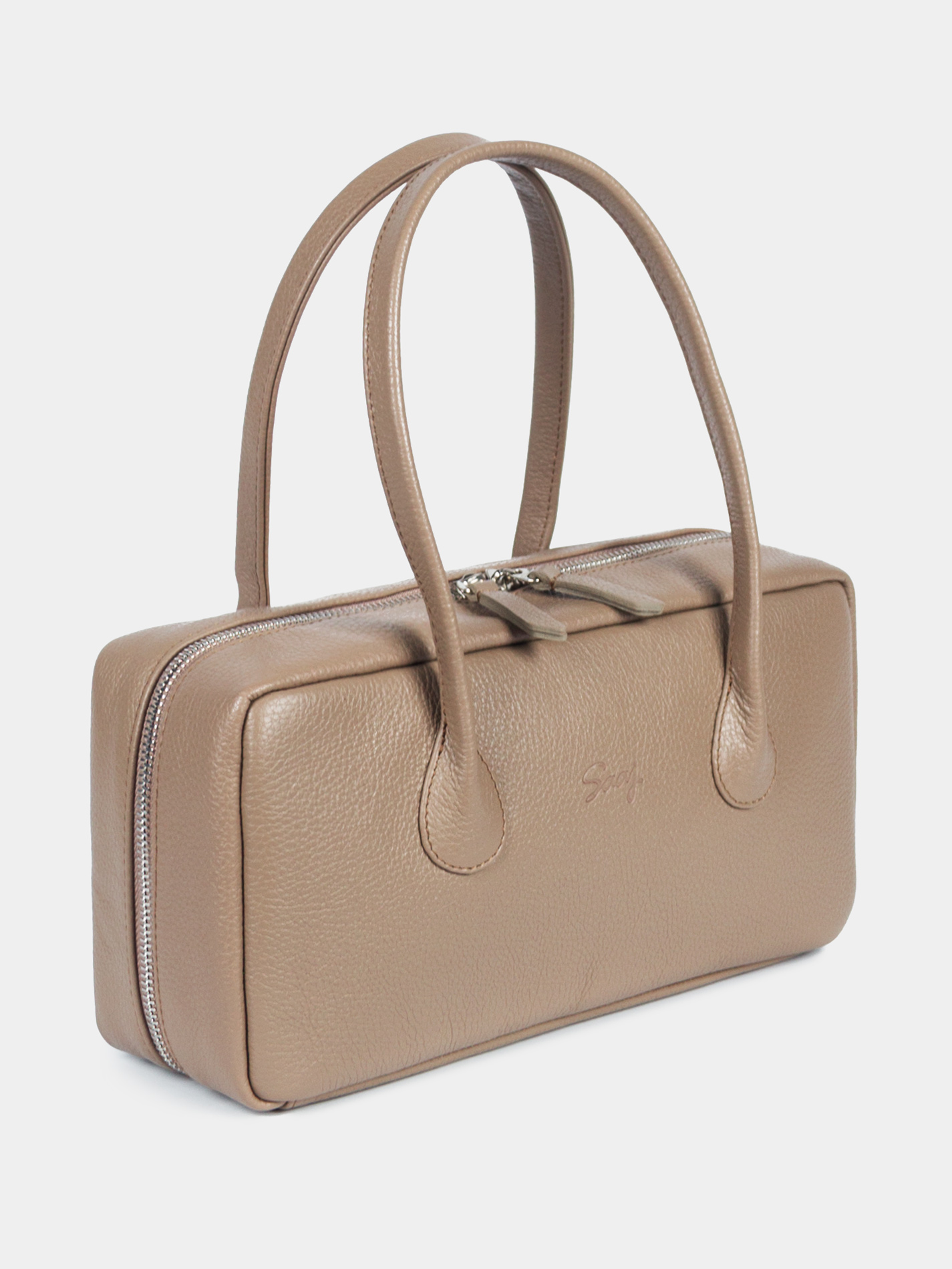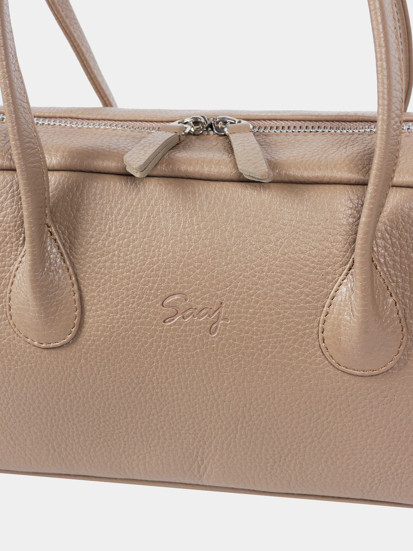 Сумка-багет женская бренда SAAJ из натуральной кожи цвета тауп. У сумки одно отделение. Внутри карман-перегородка на молнии, 2 открытых кармана для мелочи, 1 карман на молнии. Высота ручек 18 см. Изделие упаковано текстильный мешок.