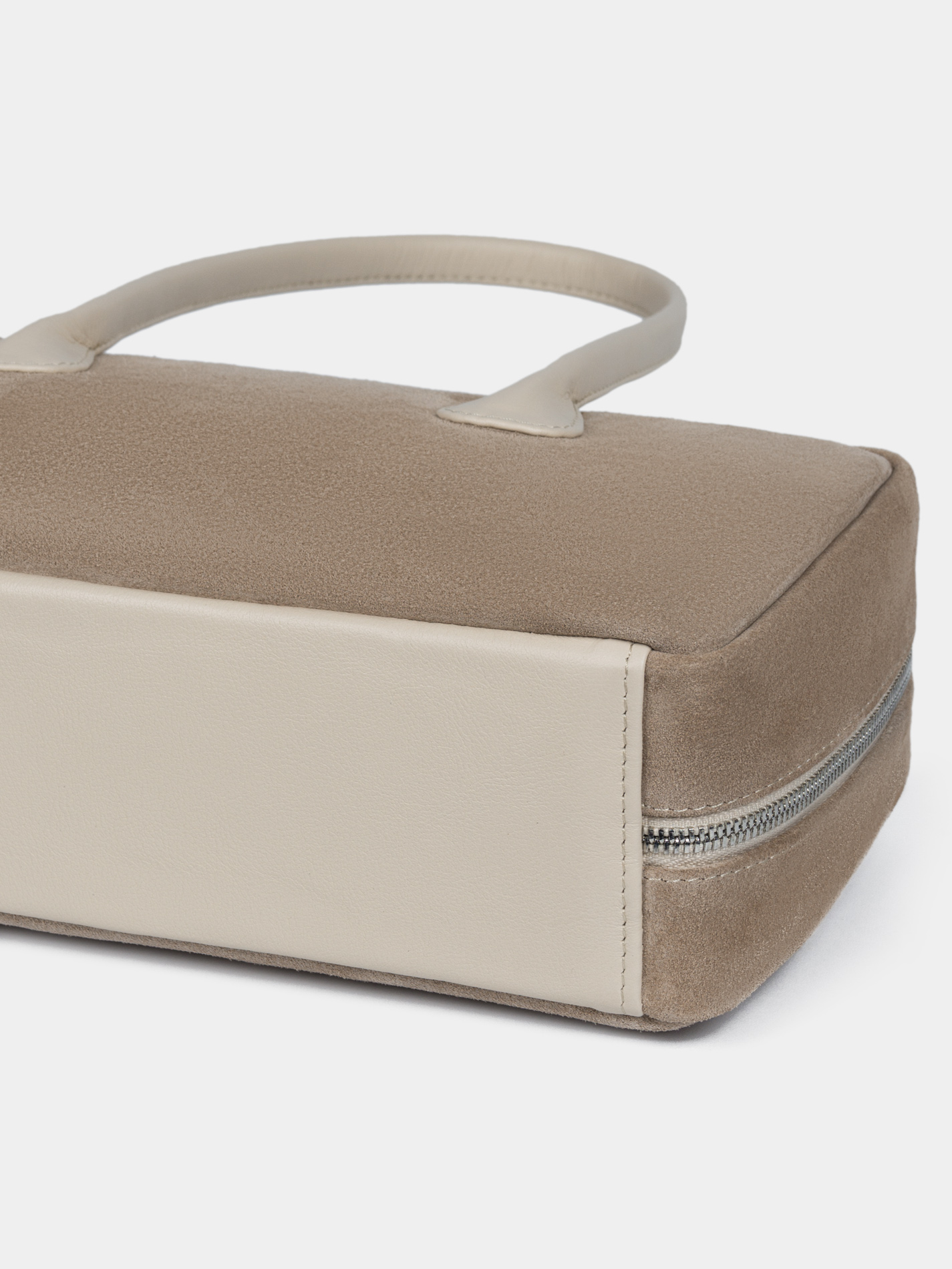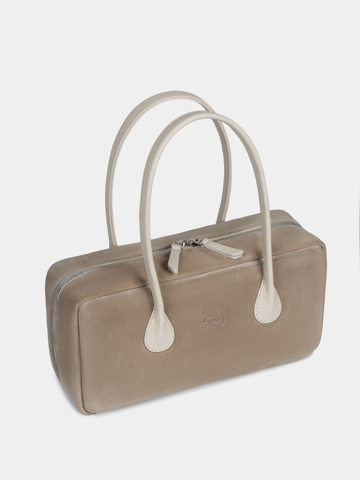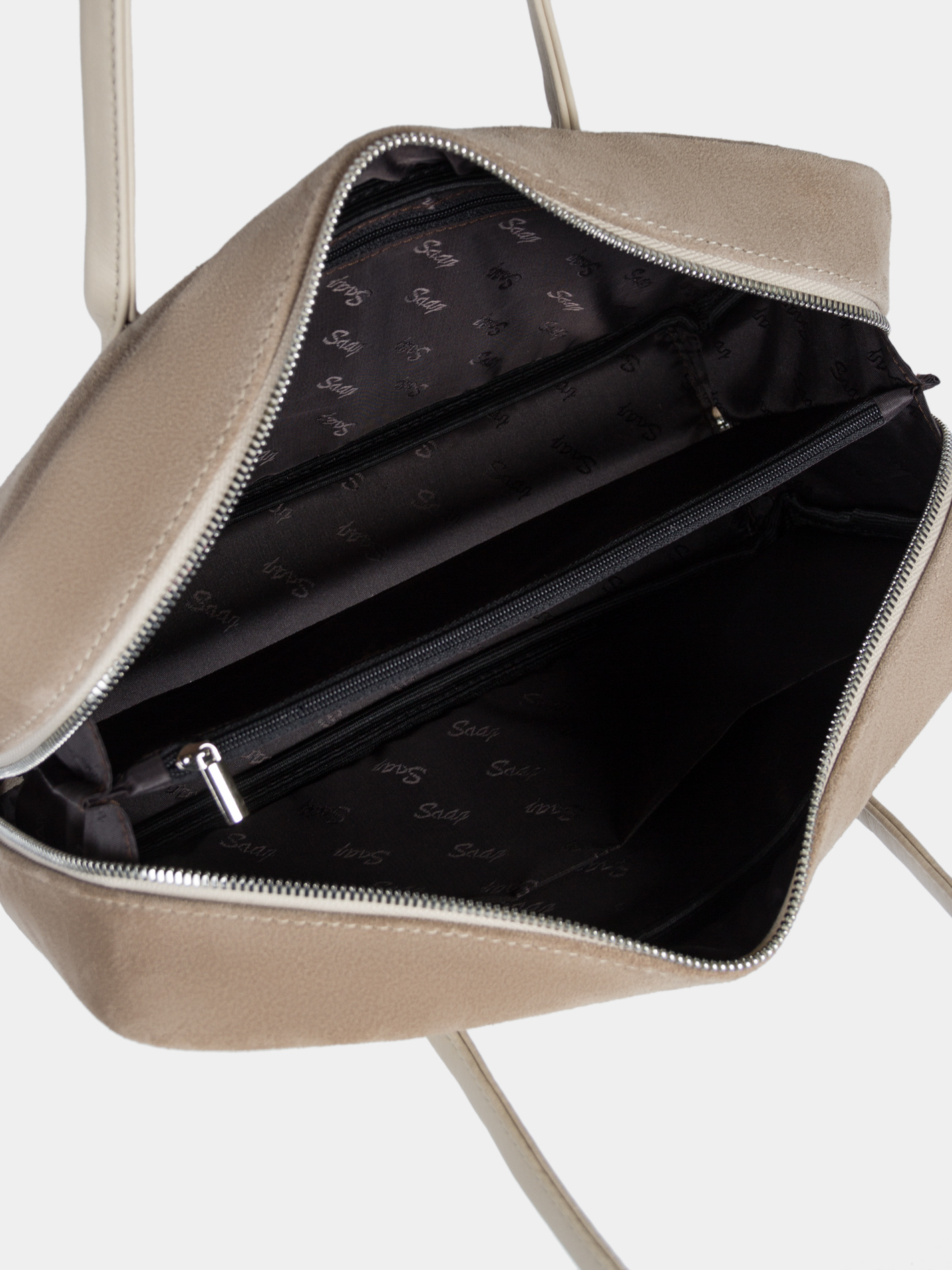 Сумка-багет женская бренда SAAJ из натуральной замши бежевого цвета в комбинации с натуральной кожей светло-бежевого цвета. У сумки одно отделение. Внутри карман-перегородка на молнии, 2 открытых кармана для мелочи, 1 карман на молнии. 2 ручки и донышко выполнены из натуральной кожи. Высота ручек 18 см. Изделие упаковано текстильный мешок.