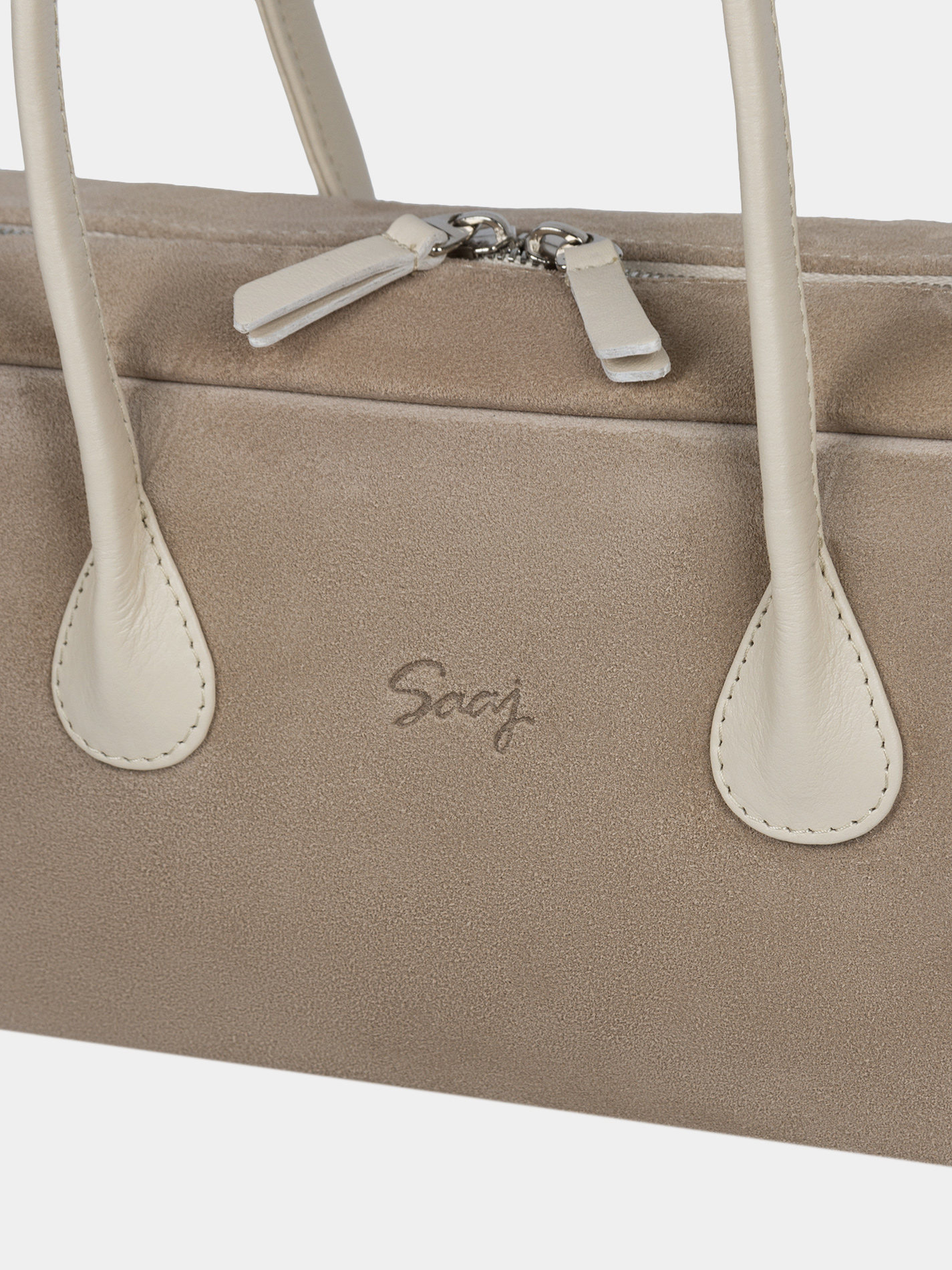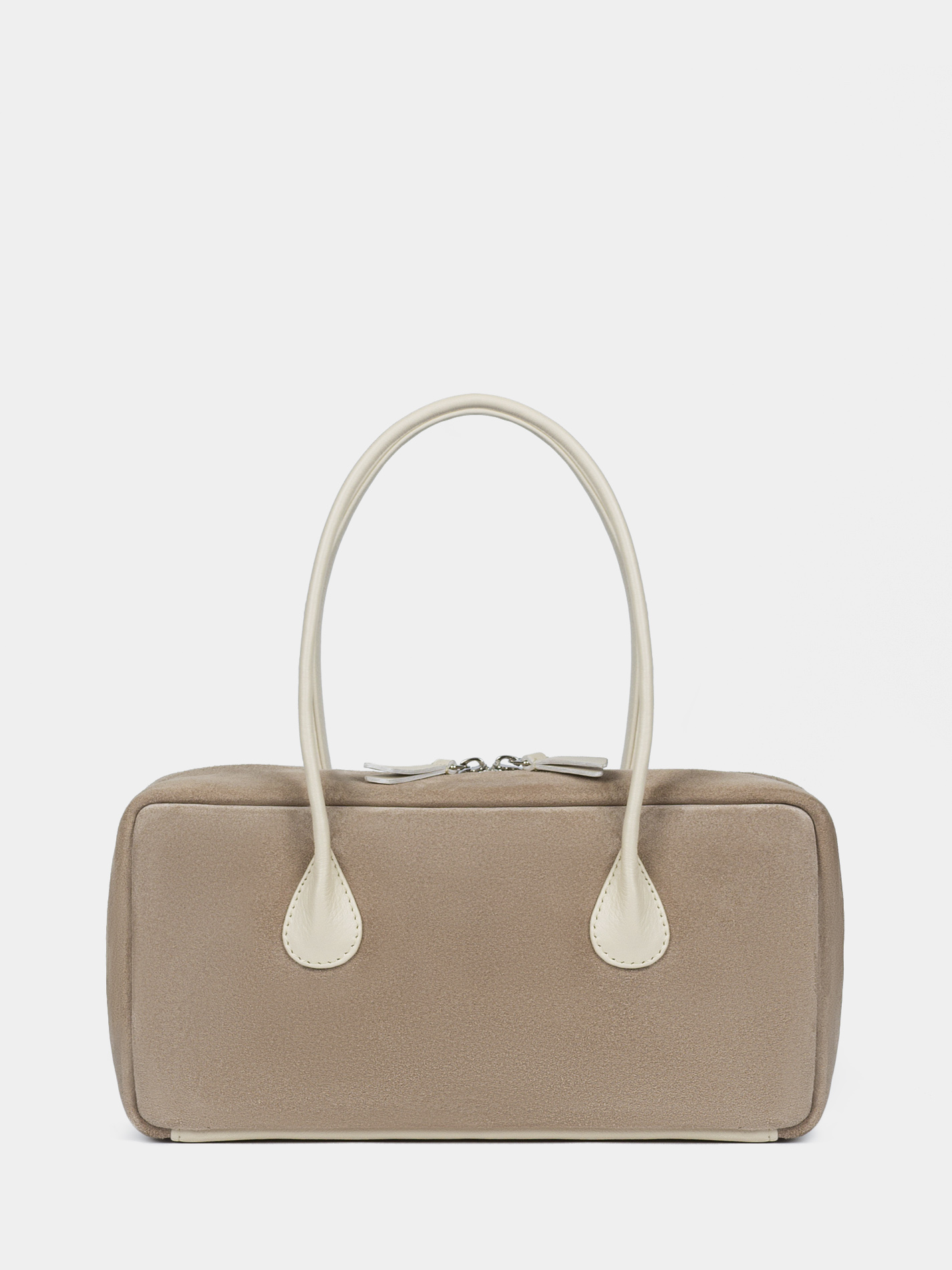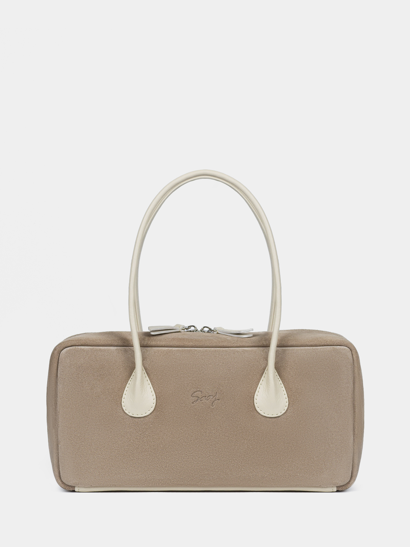 Сумка-багет женская бренда SAAJ из натуральной замши бежевого цвета в комбинации с натуральной кожей светло-бежевого цвета. У сумки одно отделение. Внутри карман-перегородка на молнии, 2 открытых кармана для мелочи, 1 карман на молнии. 2 ручки и донышко выполнены из натуральной кожи. Высота ручек 18 см. Изделие упаковано текстильный мешок.