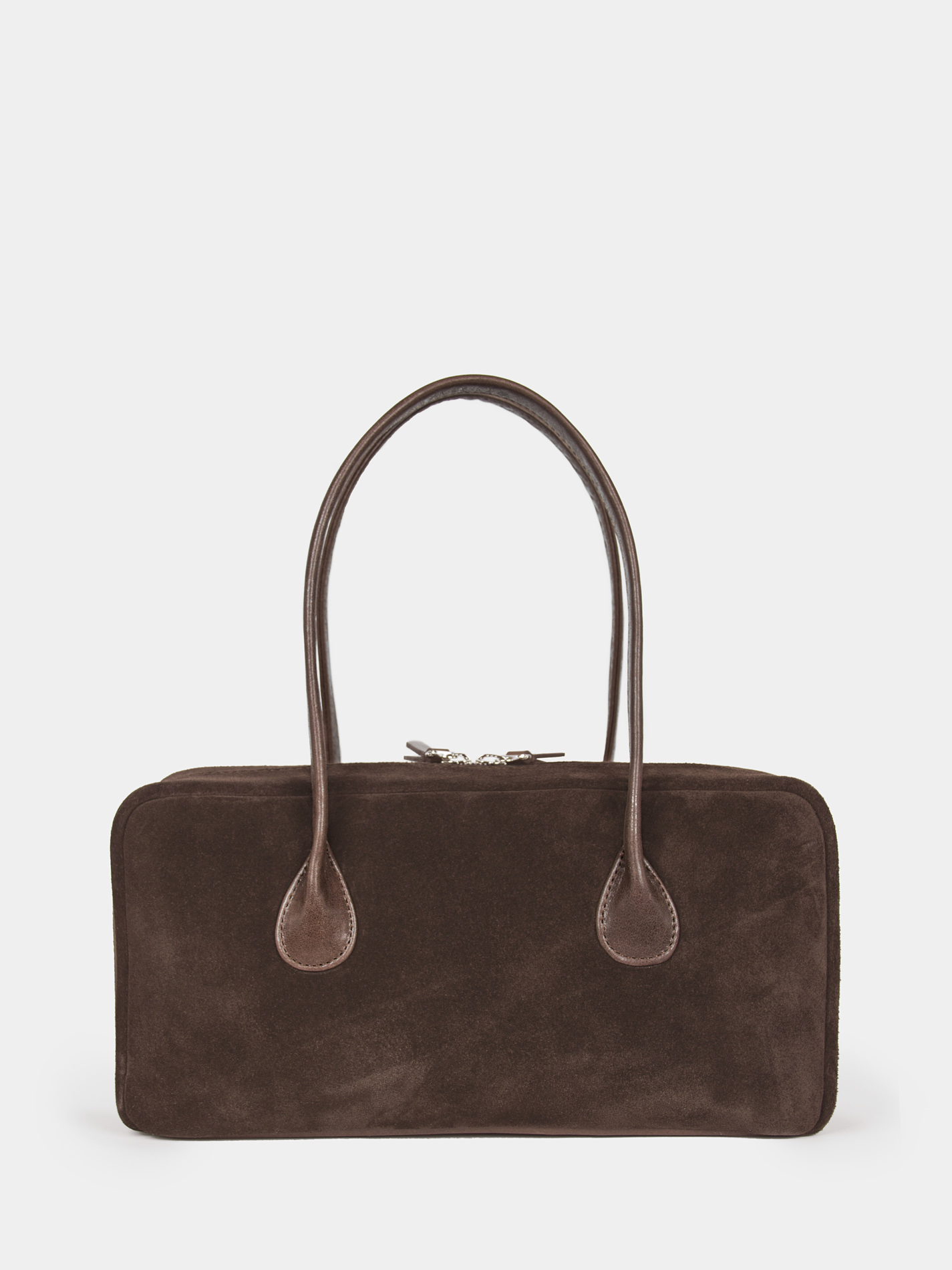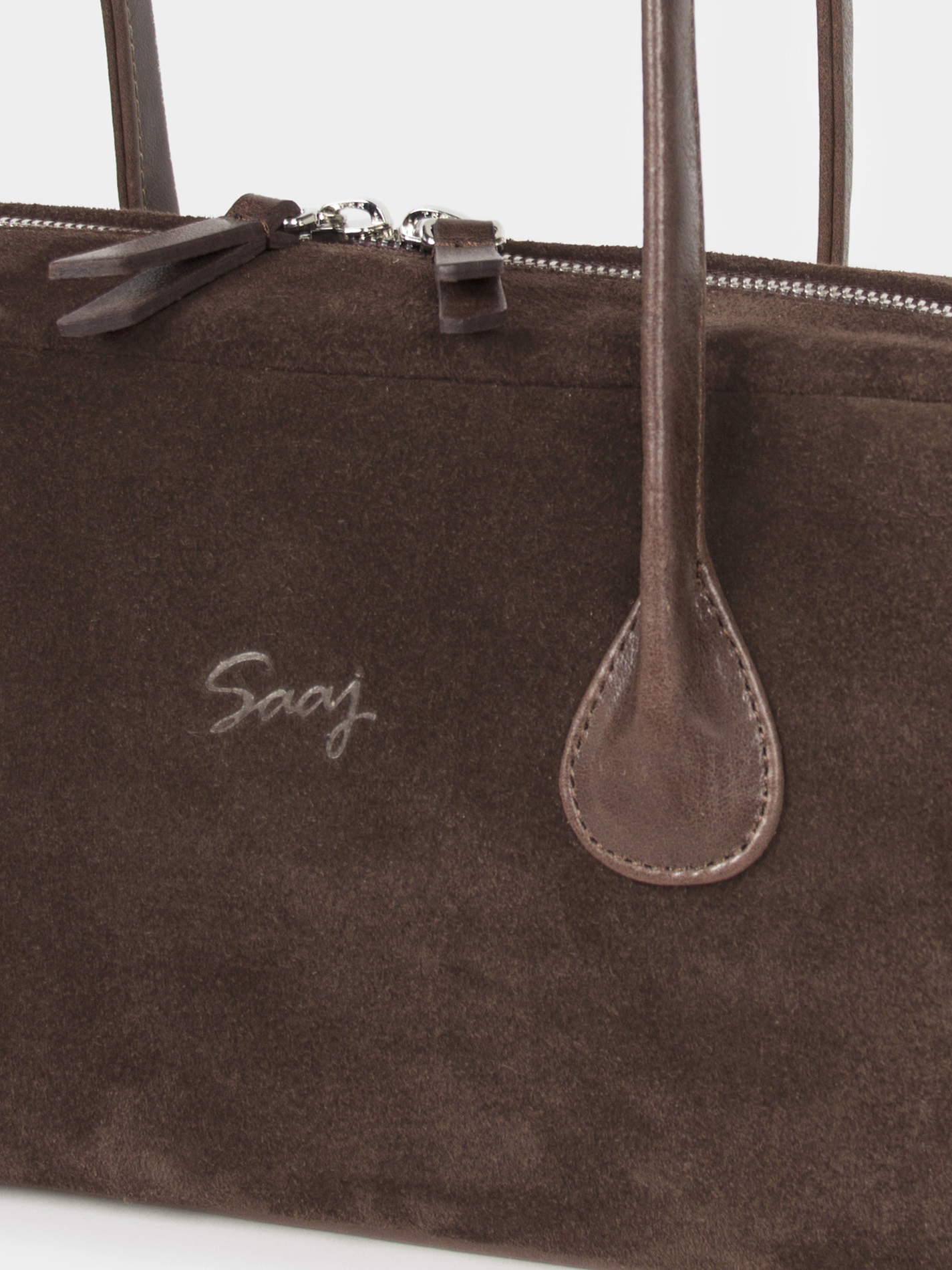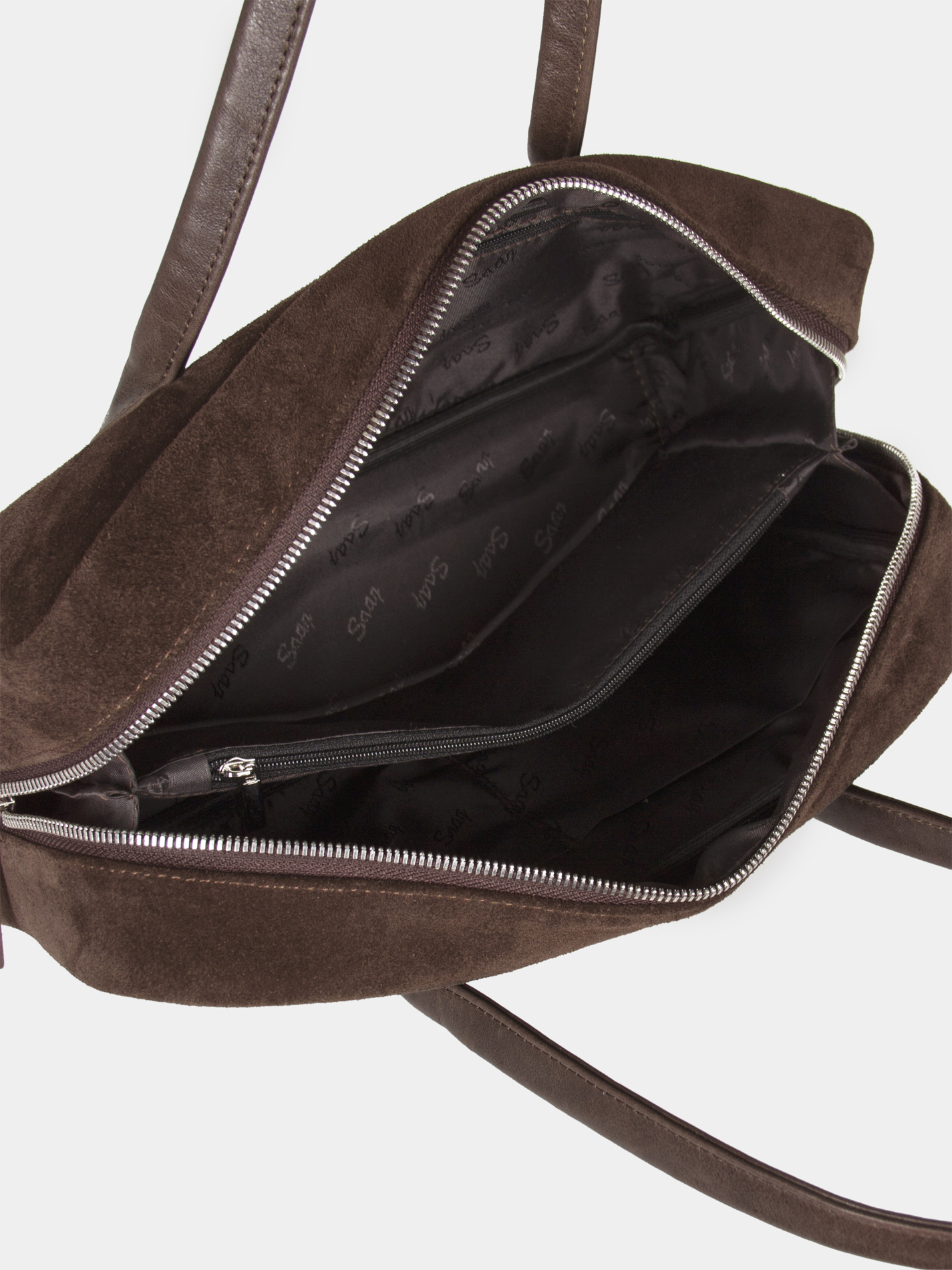 Сумка-багет женская бренда SAAJ из натуральной замши коричневого цвета. У сумки одно отделение. Внутри карман-перегородка на молнии, 2 открытых кармана для мелочи, 1 карман на молнии. 2 ручки и донышко выполнены из натуральной кожи. Высота ручек 18 см. Изделие упаковано текстильный мешок.